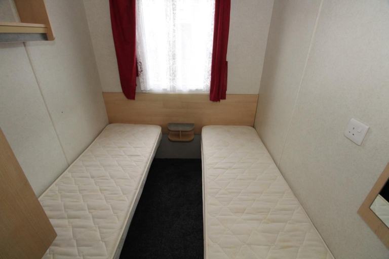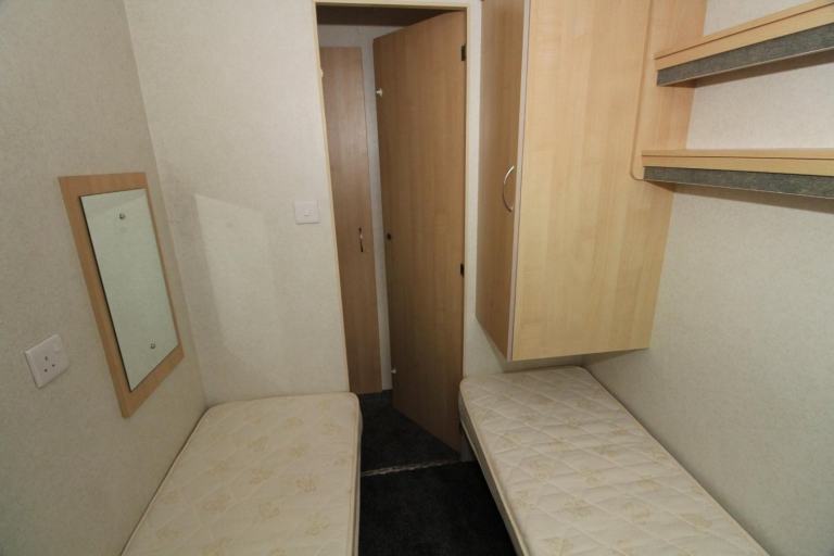 At the rear of the caravan, the main bedroom includes overhead storage and a wardrobe, making smart use of space. The twin bedroom offers two single beds and additional storage, providing ideal accommodation for family or guests.