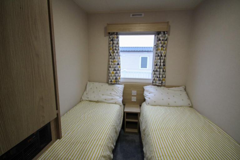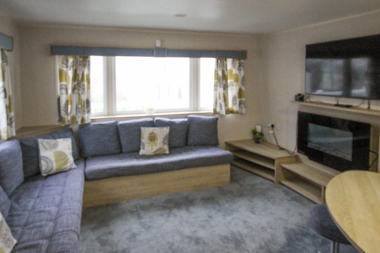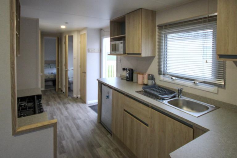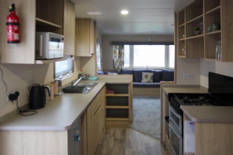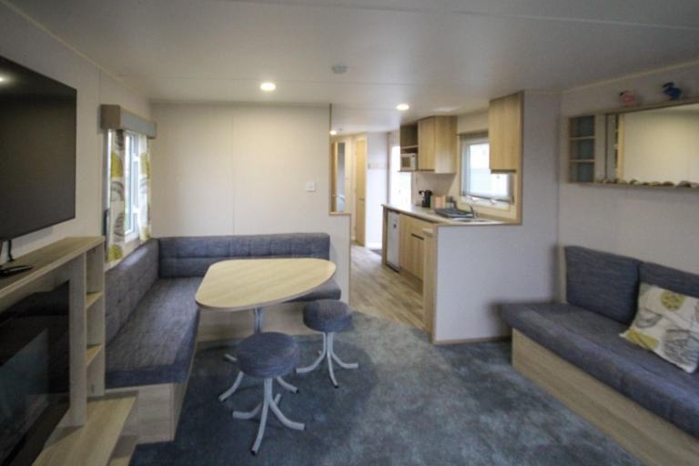 The caravan is a good size at 36ft x 12ft and has a spacious open-plan layout. The lounge has a large front window, a large built-in corner-sofa (with a pull-out bed beneath) and a matching dining area, an electric fire, and a TV unit with lots of storage. There’s a lot of floor space for children to play, and lots of seating for everyone to spread out. The kitchen is a galley style with storage on each side, and a gas cooker & hob, an under-counter fridge-freezer, and a microwave shelf.
