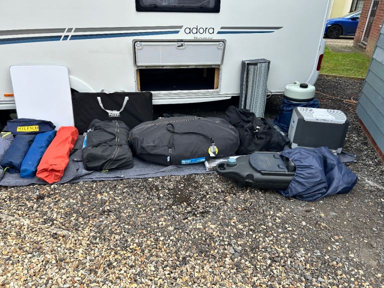 Tables, chairs, loungers, kitchen cupboard unit, caravan top cover, wheel covers, front towing cover and loads more!