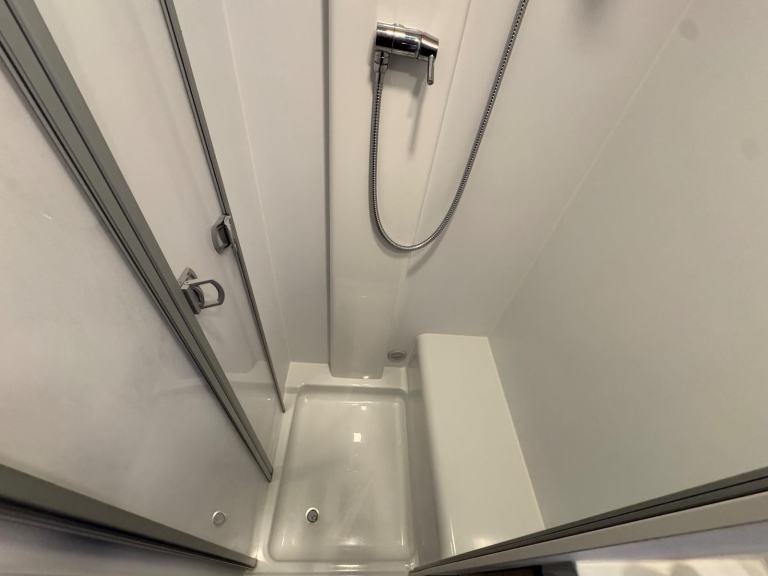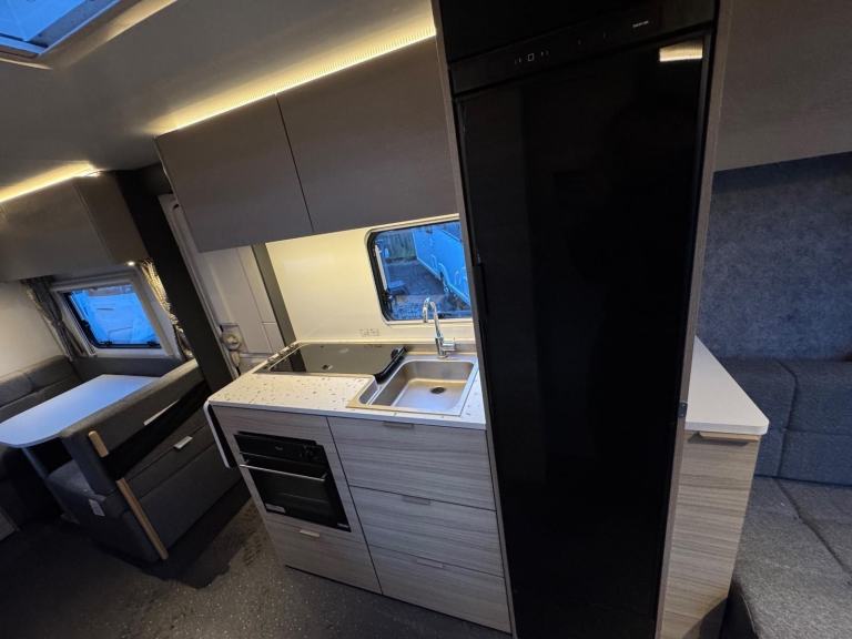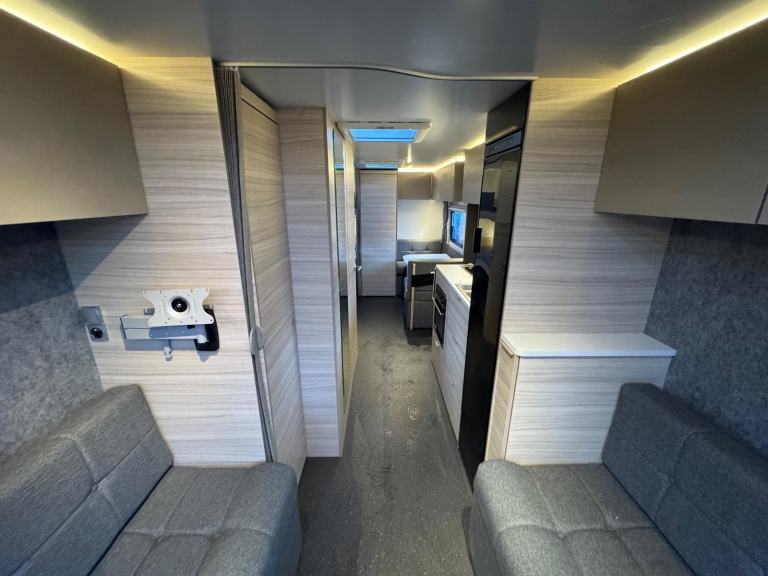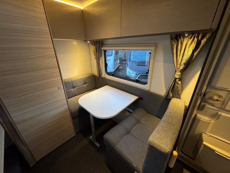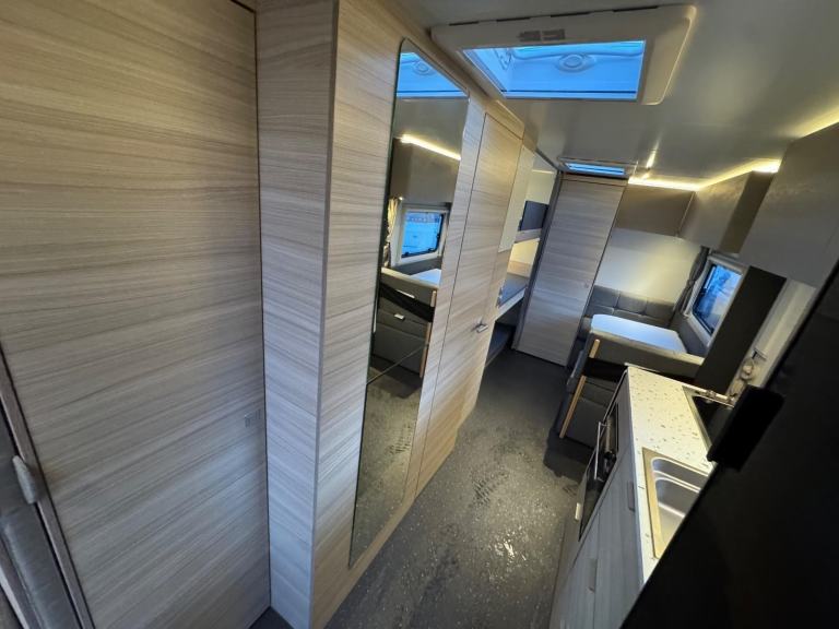 Offside rear double bunks - nearside rear single dinette with retractable bunk above - central nearside kitchen - offside central dressing room with individual shower cubicle, toilet and vanity unit - 2 x 6' singles double at the front . This model offers a home style feeling with a light and bright welcoming ambiance , together with a top specification , contemporary practical design and spacious accommodation.