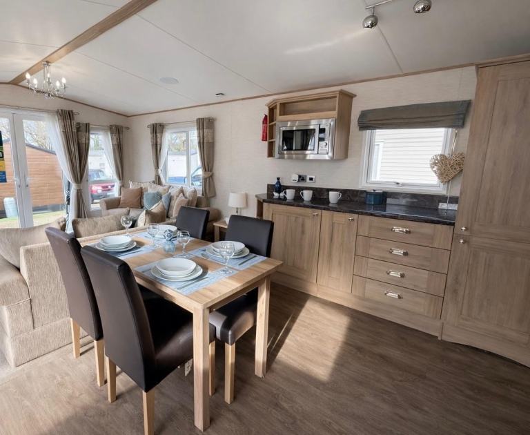 The open-plan lounge and dining area is light, airy and generously proportioned, with freestanding sofas, coordinating cushions, a large footstool and a feature fireplace creating a warm, relaxed feel. Full-height front doors and multiple windows allow natural light to pour in and frame attractive views across the park; there is plenty of space for everyone to stretch out, entertain and unwind.