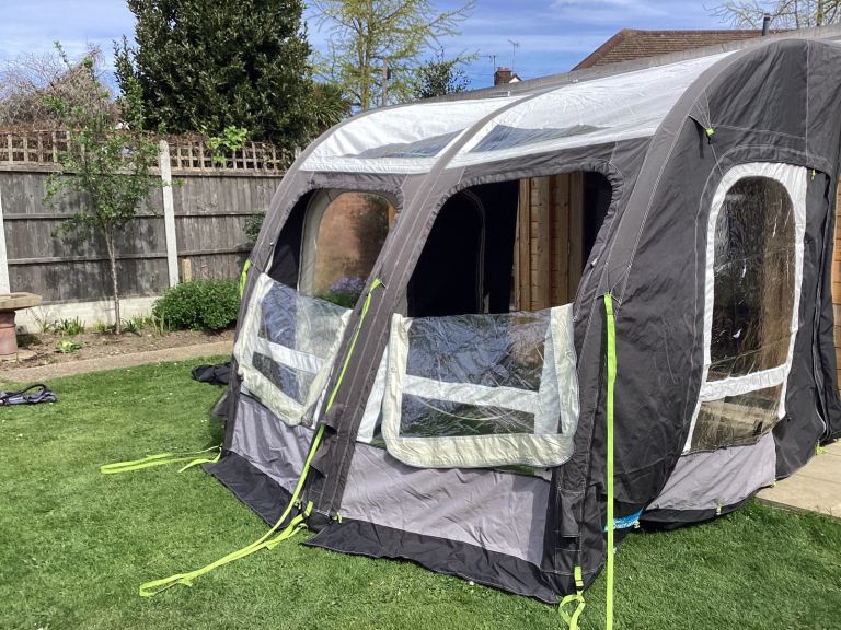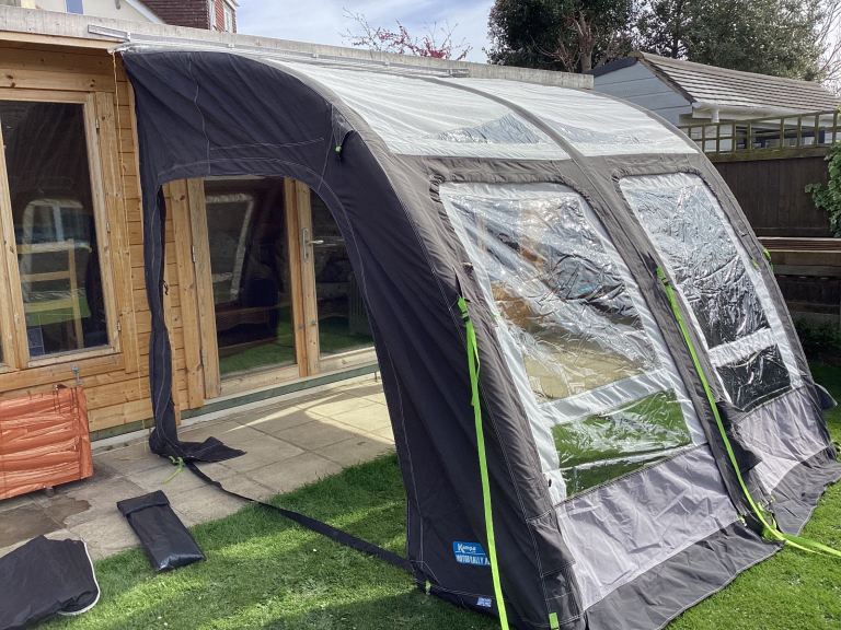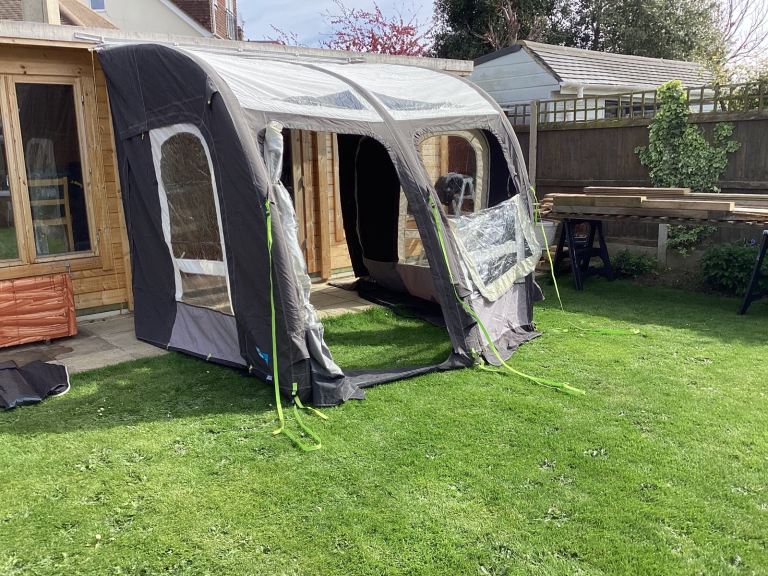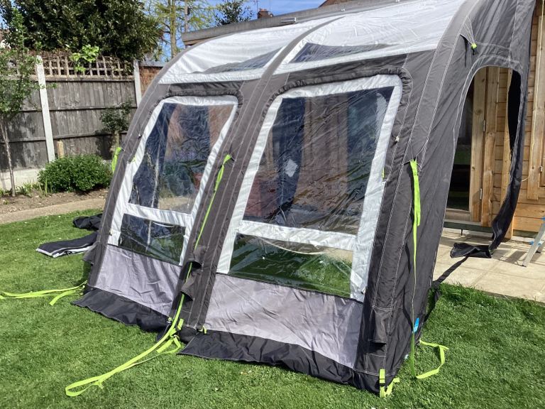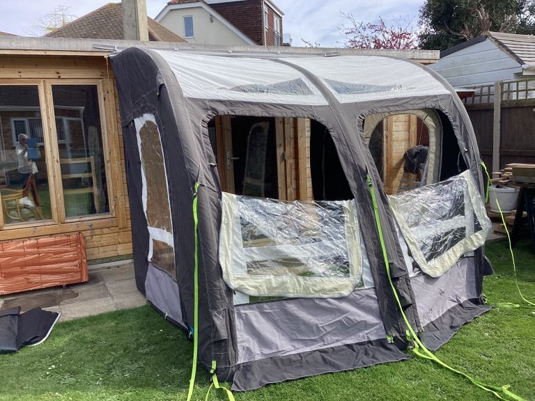 Kampa Rally pro26 L air awning suitable for Motorhome camper and caravan. As new very little used in carrying case New electric pump in bag Roof lining curtains. Very easy to erect approximately 10 minutes it doubles your floor area . Front can be lowered or removed to bring the outside in. Extending side annex can be added on zip sides. Please note the photos don’t do it justice as it’s erected in the garden. Excellent to give children extra play area. Please ring on the phone number on the ad