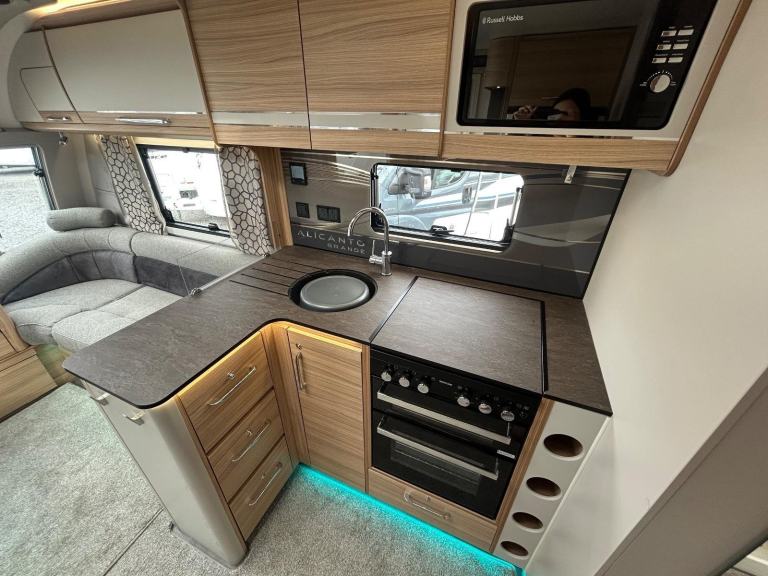 In the nearside kitchen, culinary delights await, with an adjacent tower fridge freezer ensuring your ingredients stay fresh throughout your journey. An offside dresser adds both functionality and style to the living space.