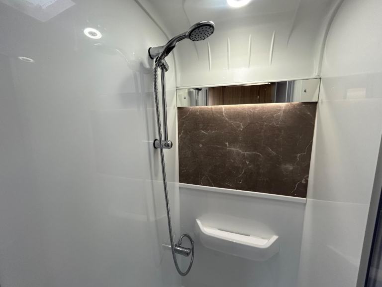 Step into luxury with a rear forward-facing island bed, creating a cosy retreat at the end of each day's adventures. Adjoining wardrobes on either side of the bed offer ample storage space for all your belongings, while an adjacent TV display point ensures entertainment is always within reach.
