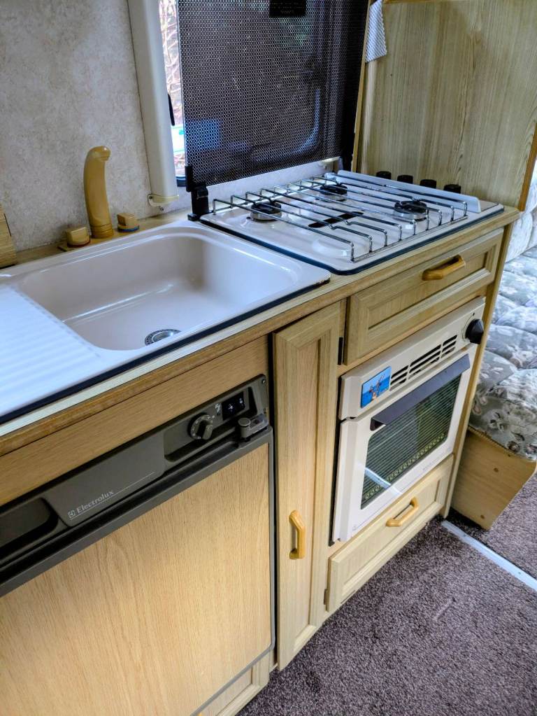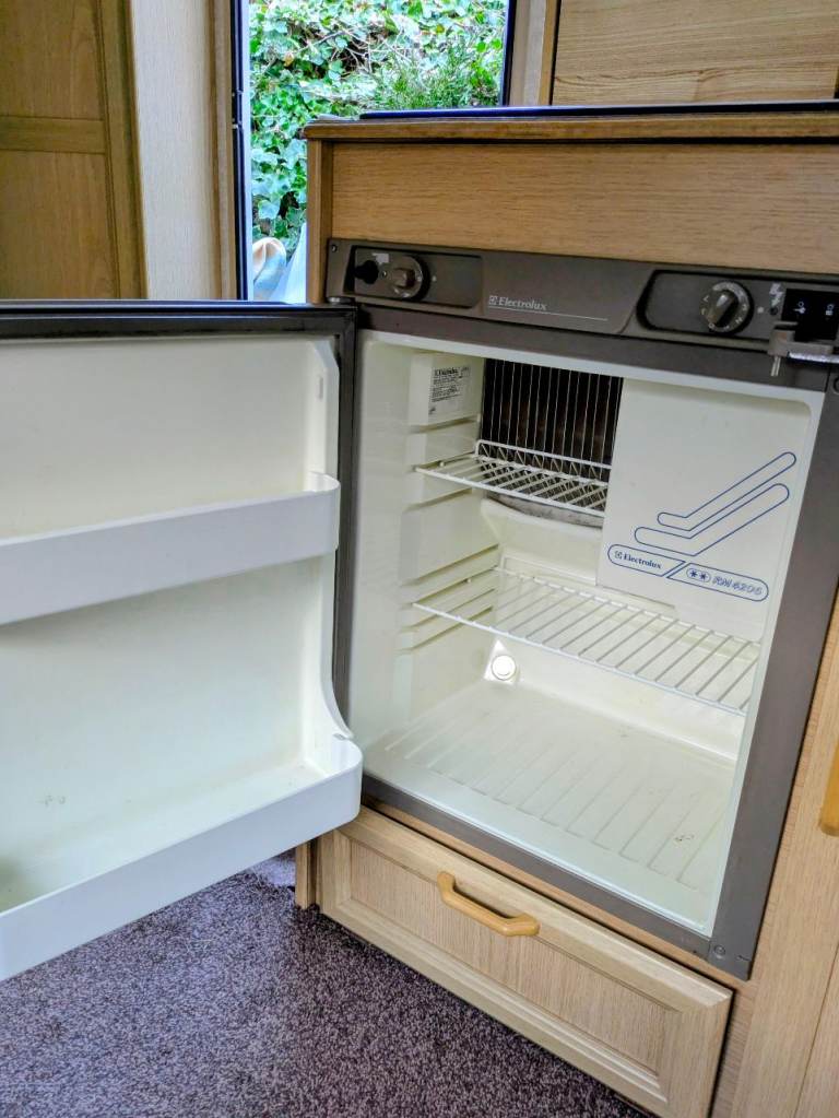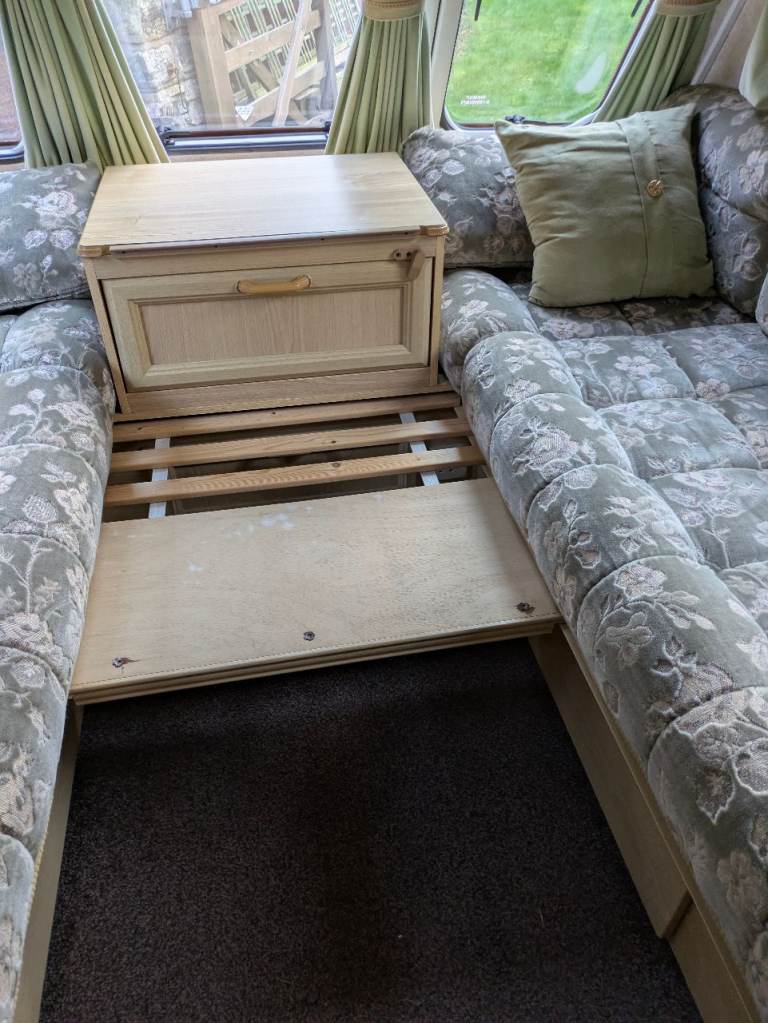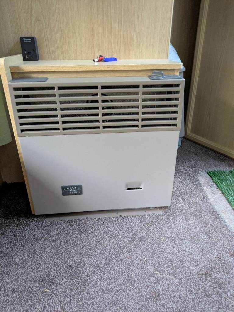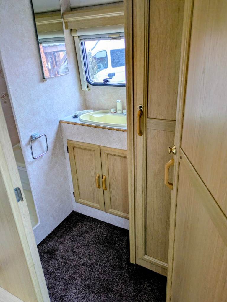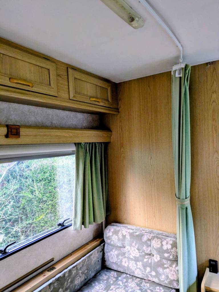 A small shower and toilet cubical with separate hand basin with useful swing out mirrors and a wardrobe. The water heater was fixed when we acquired the caravan and we have drained it and emptied it of any remaining water with compressed air every winter. It gives a great shower or two. A new whale pump included (it plugs into the side of the caravan and is placed into the water roll, which we are not selling). This caravan comes equipped with a fully working refrigerator (runs on electric or gas) with a small freezer compartment great for ice creams, a three ring gas hob and gas oven with a grill. There is also a central gas heater.