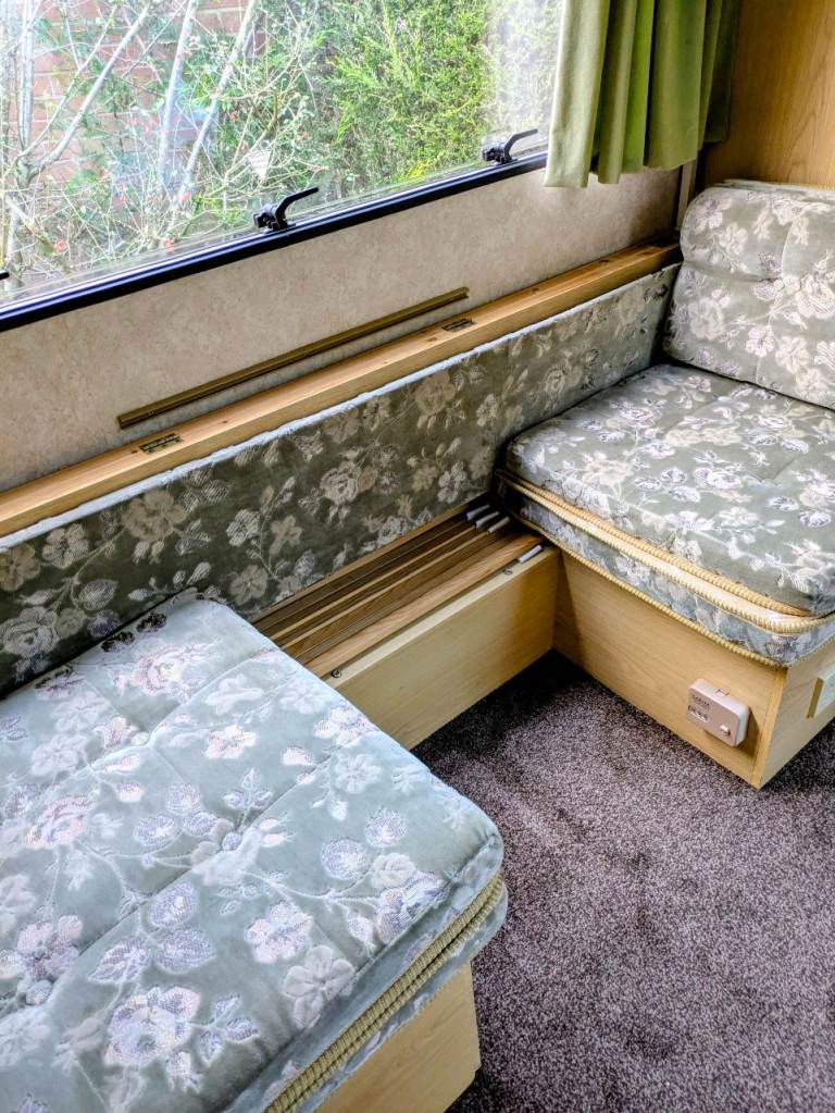 There are two smaller seats with clip-on small table that convert to two single bunk beds with surround curtain for privacy. Would suit a young family. We used it with small kiddies for the length of our ownership and it's been great.