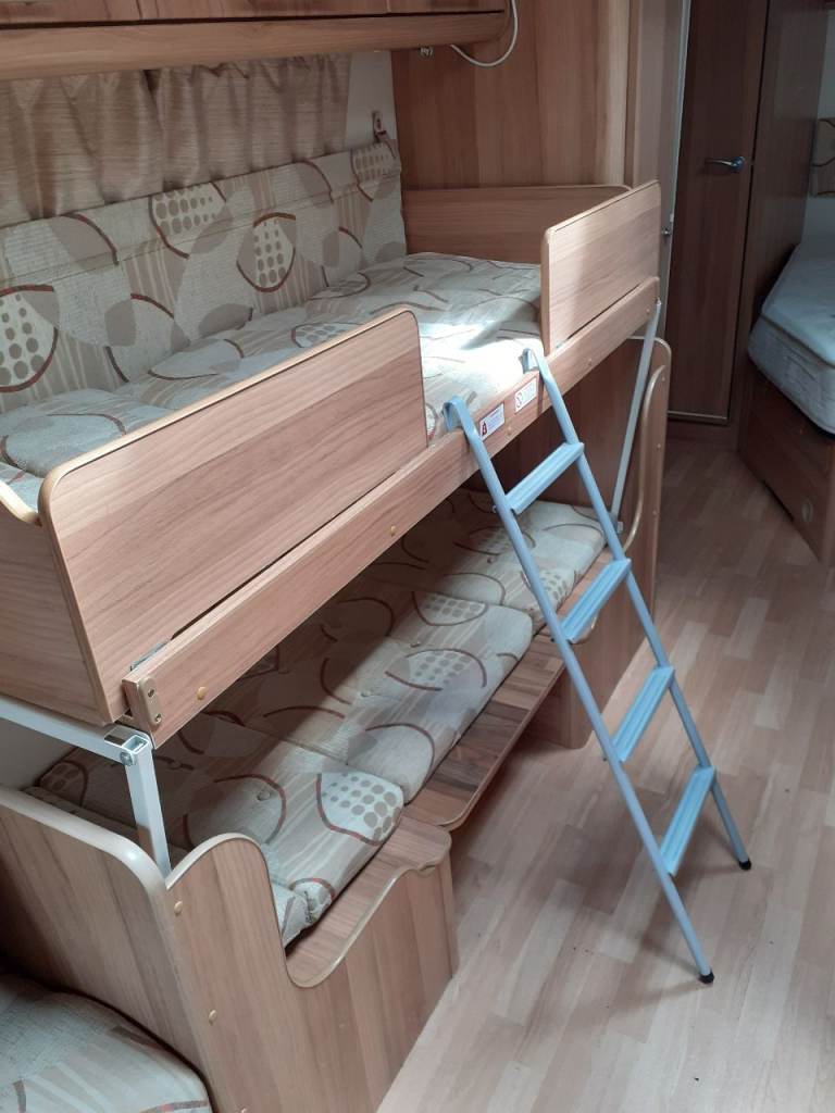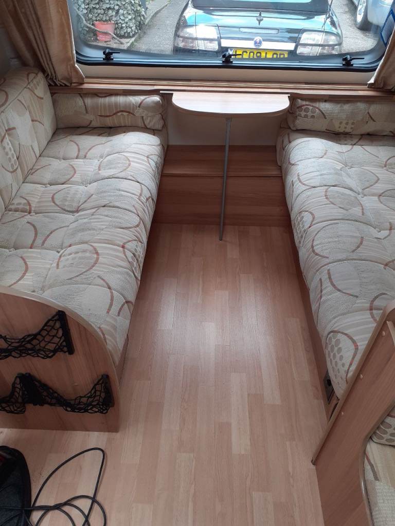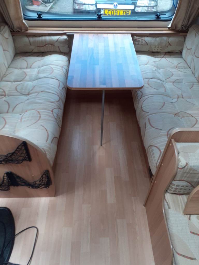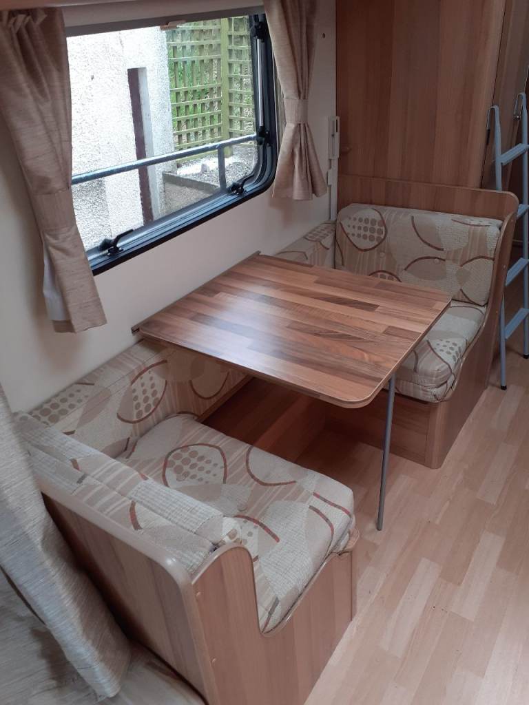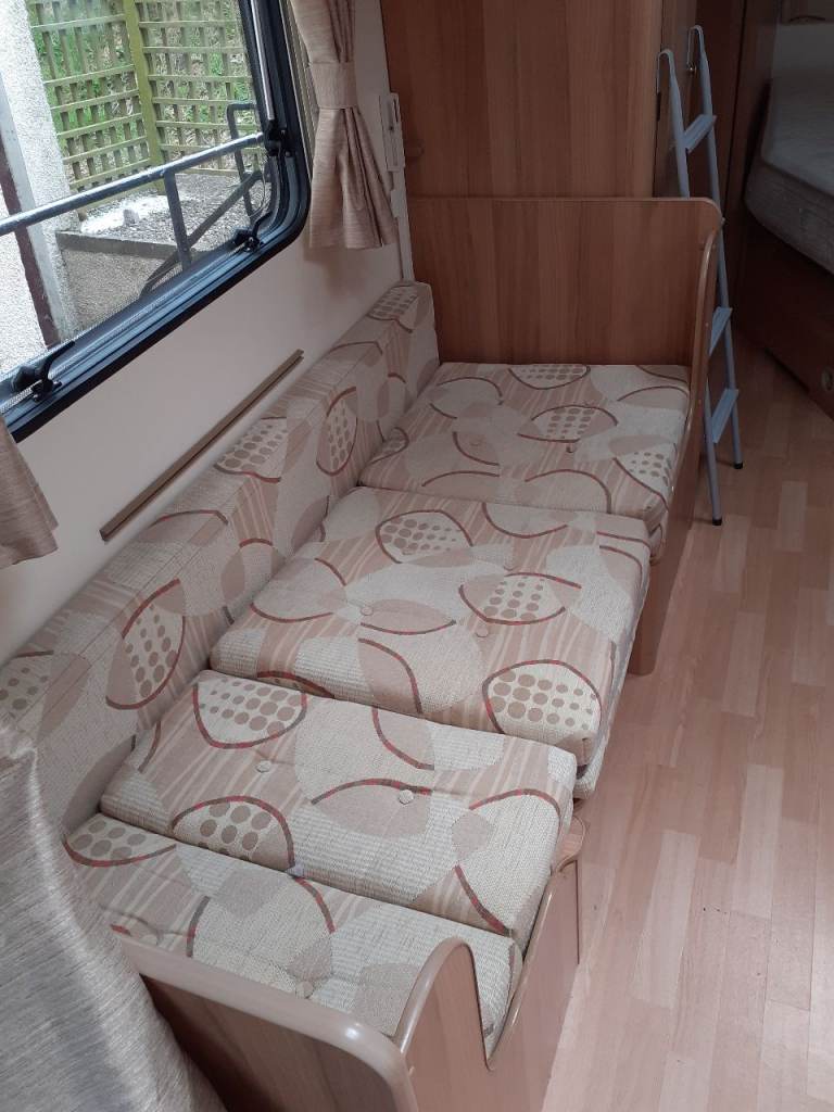 Ideal 6 berth caravan layout for families with fixed double bed at the back, side dinenette that converts to single or bunk beds. Seats at front convert to large double bed.