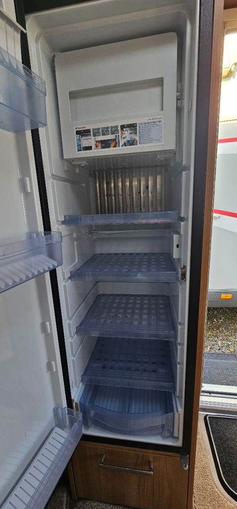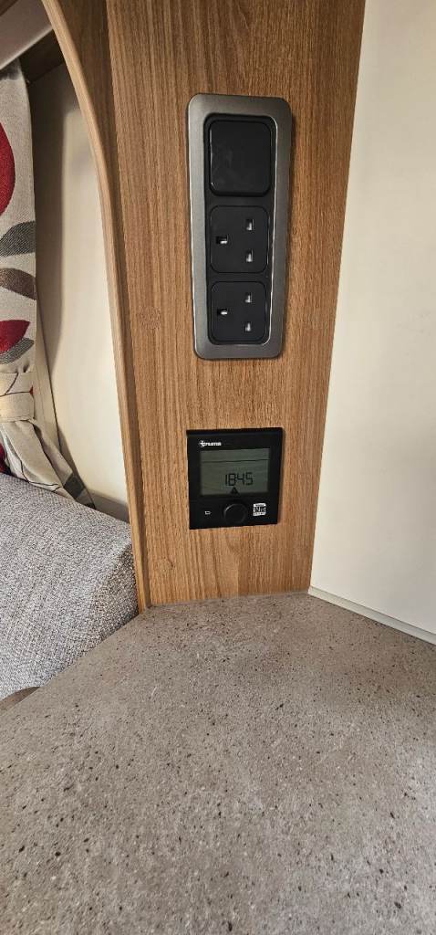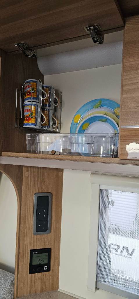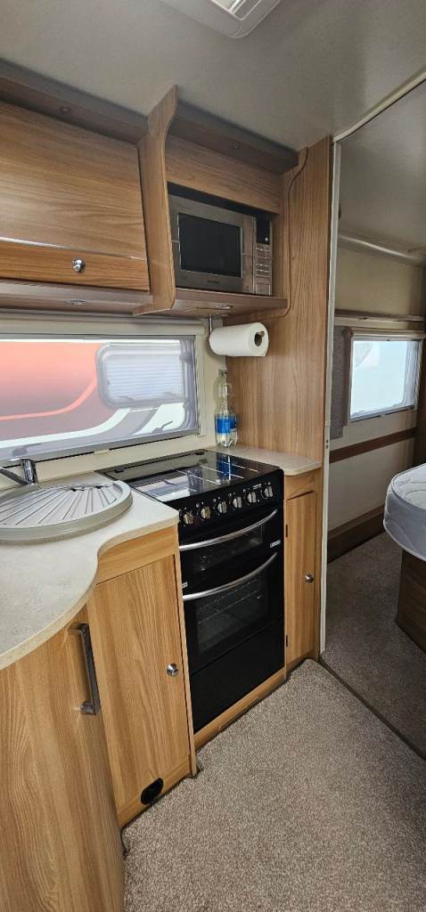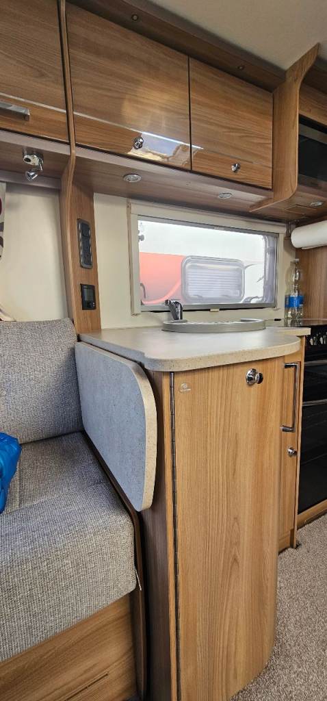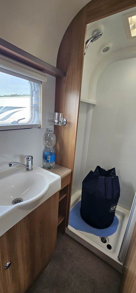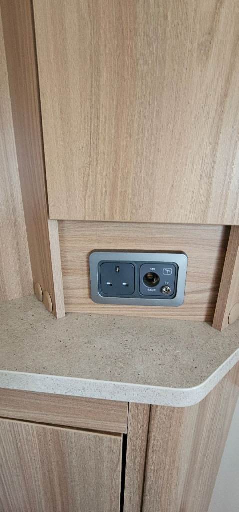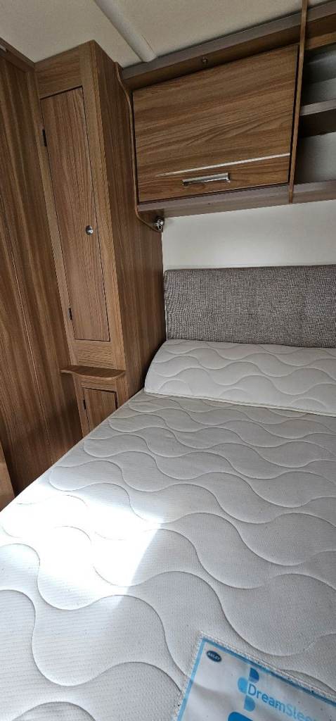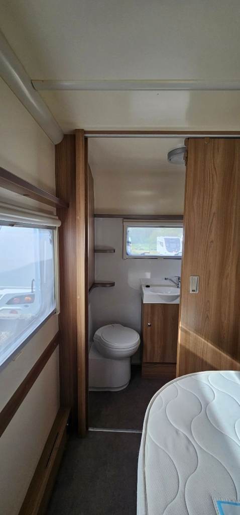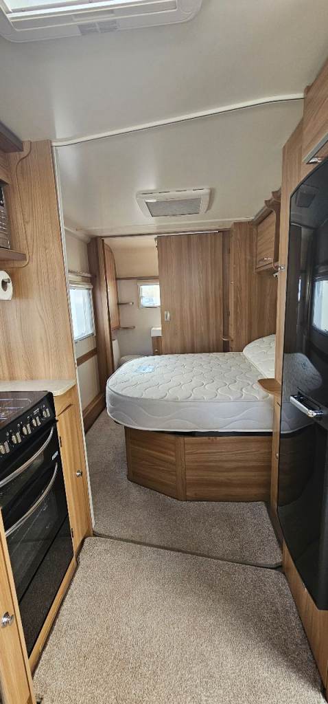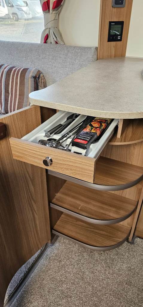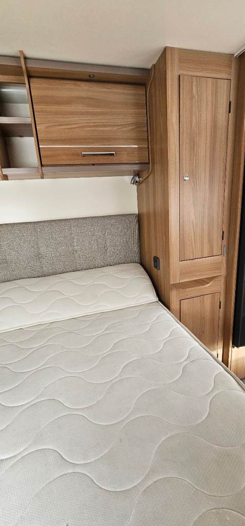 Motor mover, Hitch lock, Wheel lock, Alco ATC, Aluminium step, Milenco towing mirrors, Suncamp porch 260, Hookup cable, Water roller, Waste hog, Gas bottle, Leisure battery, Rotary clothes line, Blown air heating, Large fridge, Microwave, Full cooker, Carpets, End washroom, Transverse bed with storage under.
