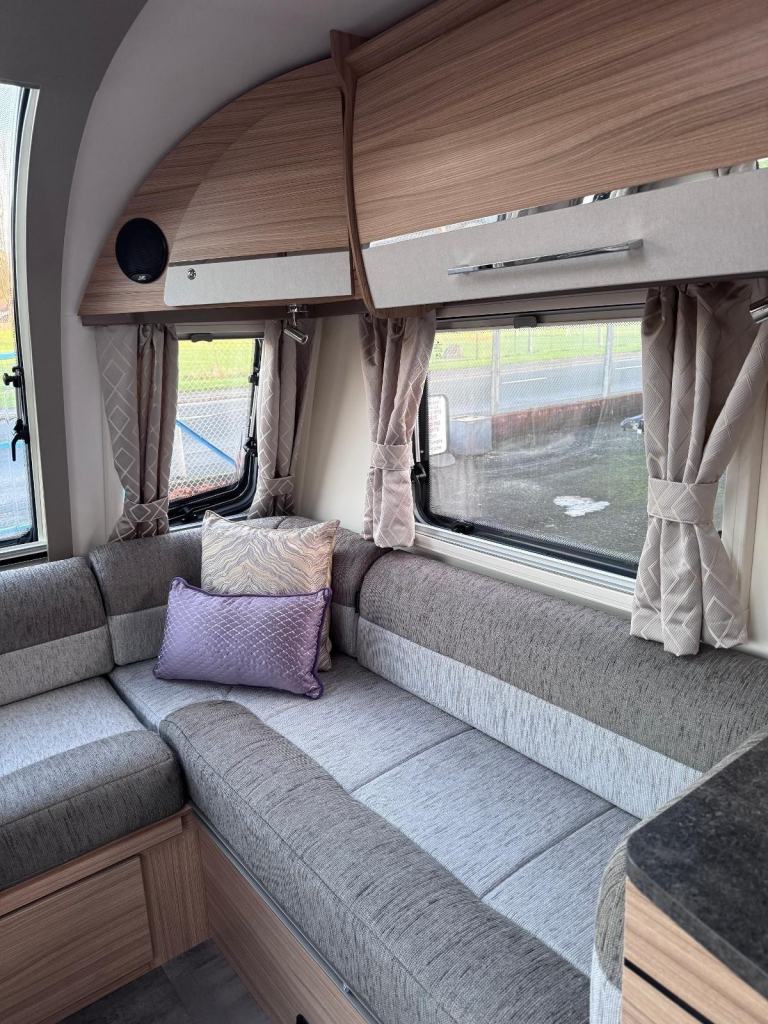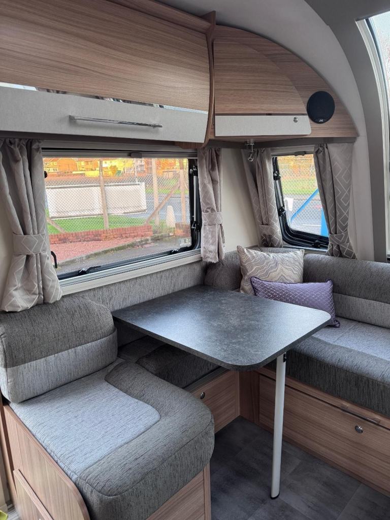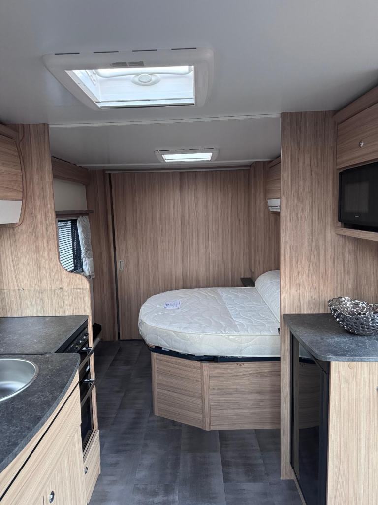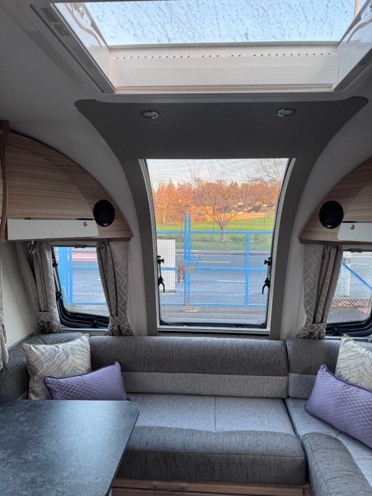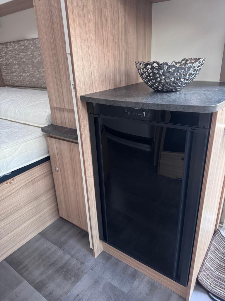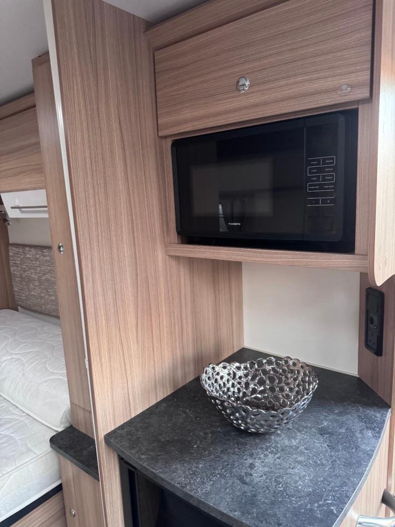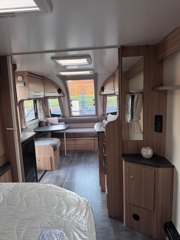 Eight foot wide tourer giving plenty of extra living space with the G shape lounge seating, a well equipped kitchen, ample space around the fixed transverse island bed and full width rear washroom with separate shower. One owner with service history and working demo on collection. Extras include motor mover and awning. Viewings at Kingdom Caravans, Fk10 4qr, open everyday except Wednesdays.