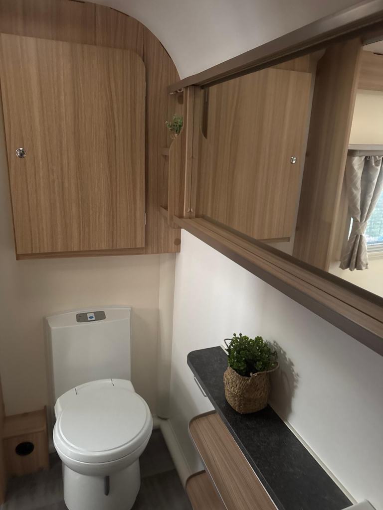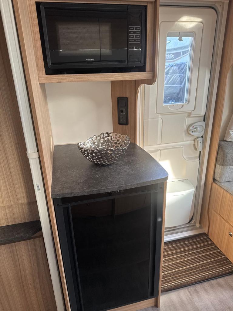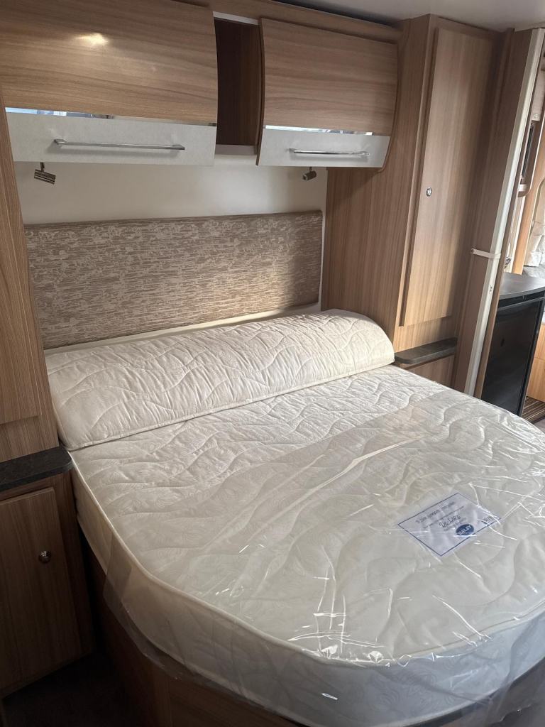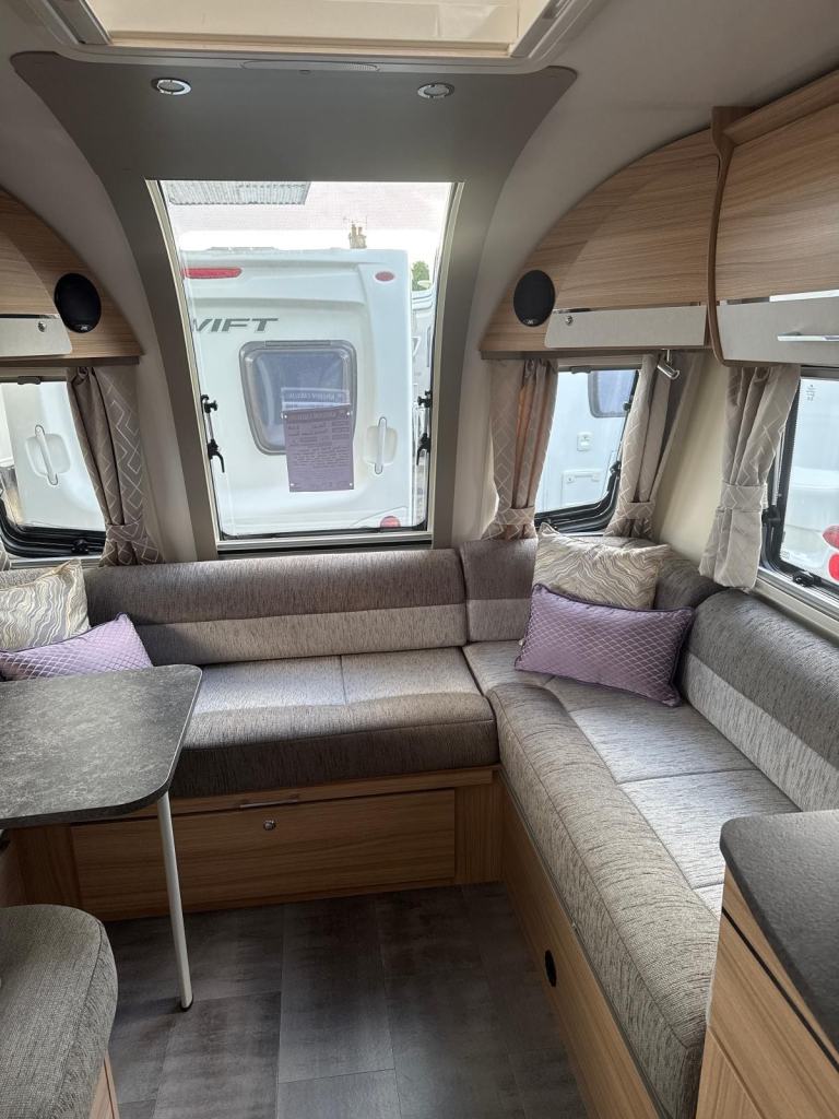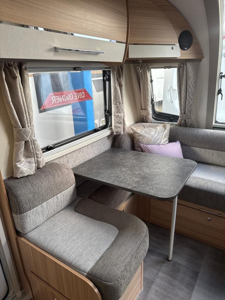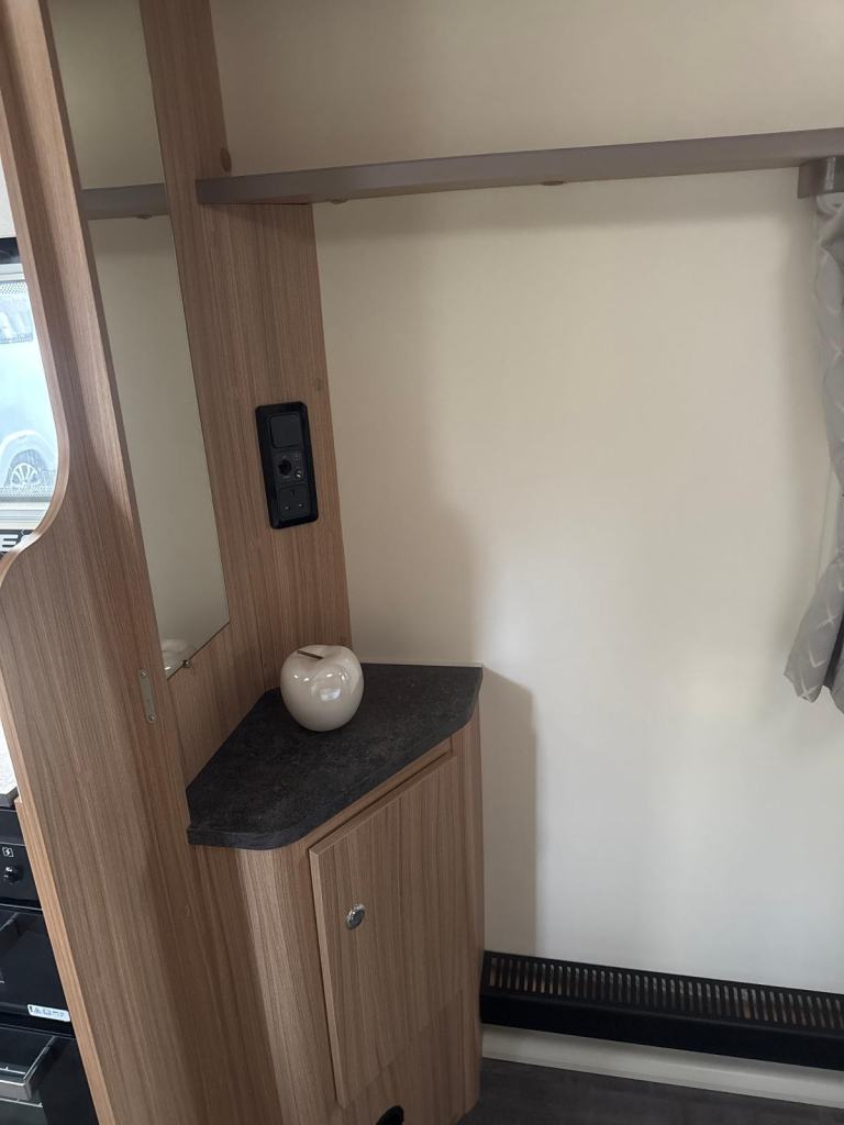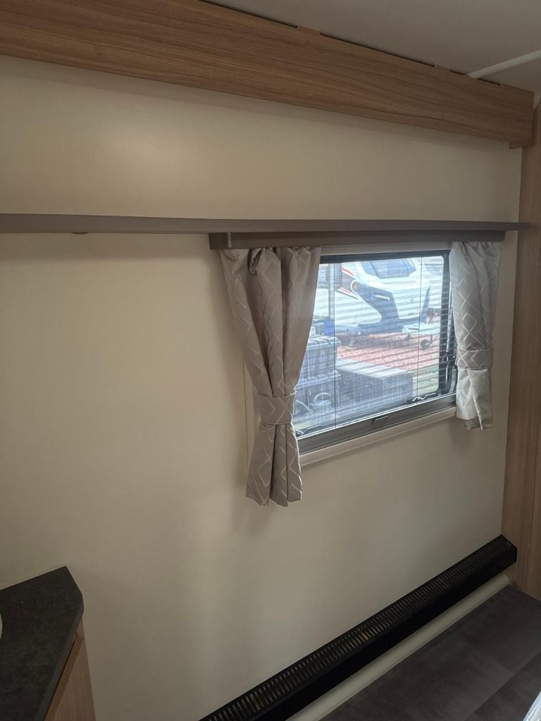 Exceptional layout, this 8 ft. wide tourer with a spacious G shaped front lounge, a well equipped kitchen and with ample space around the fixed transverse island bed that leads onto the rear washroom. One owner from new with service history. Working demo on collection. Extras include motor-mover, awning. Viewing at kingdom Caravans. FK10 4QR.