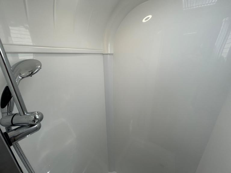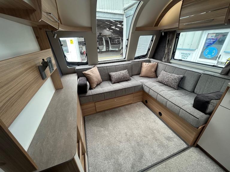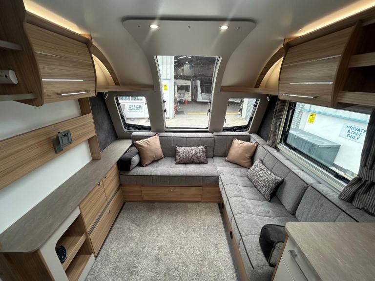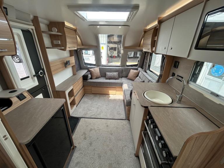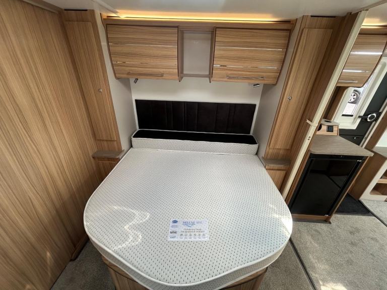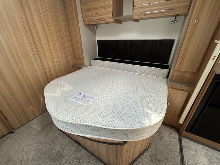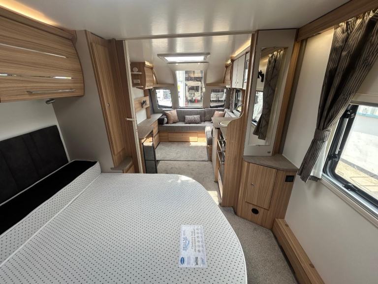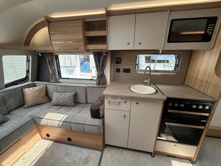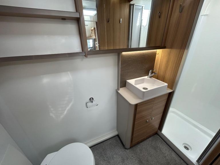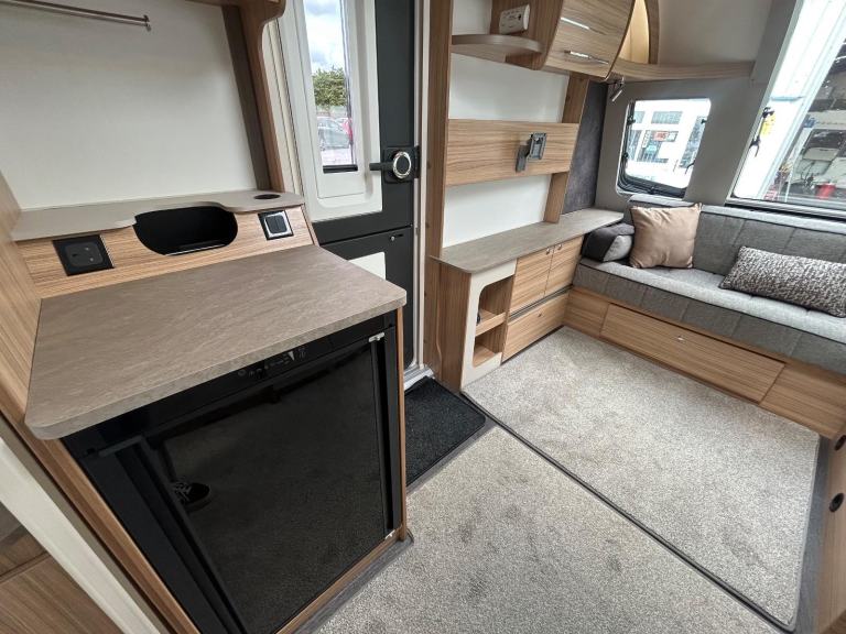 Full rear dressing room featuring separate shower cubicle, toilet and vanity unit - nearside transverse fixed island bed with adjoining wardrobes- central offside kitchen - L shape front seating with nearside TV display unit - the ultimate Grande 4 berth caravan that combines luxury and practicality for the perfect holiday experience. With its sleek and modern design, this caravan offers a comfortable and spacious interior, complete with a double bed and two additional berths. The Bailey Pegasus GT75 Brindisi is equipped with all the amenities you need, including a fully-equipped kitchen, a stylish bathroom, and ample storage space. Whether you're a family or a group of friends, this caravan is perfect for all your adventures. Don't miss out on the opportunity to travel in style with the Bailey Pegasus GT75 Brindisi Grande 4.