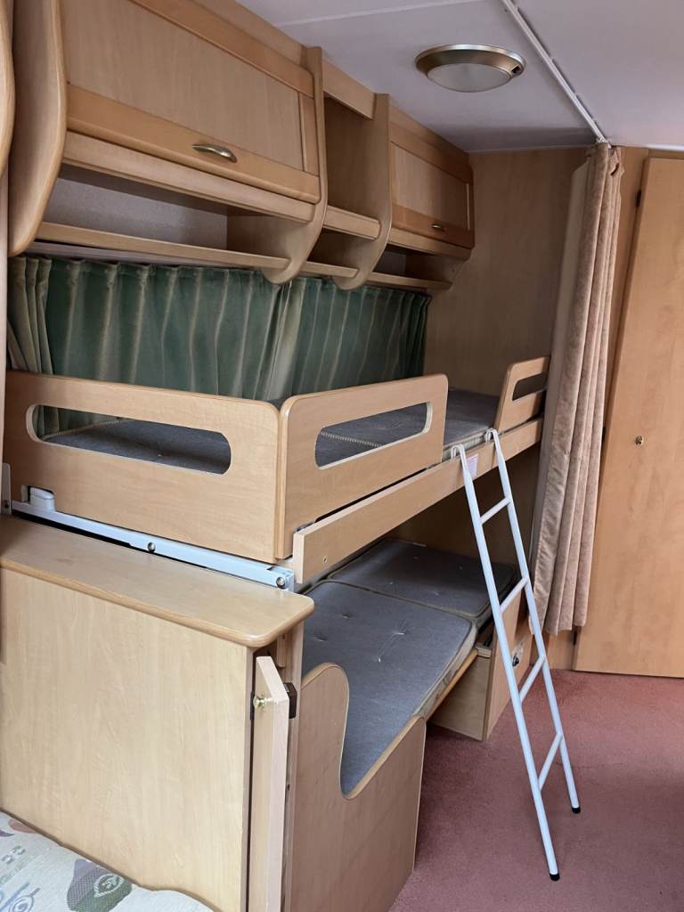 4 berth (front bunks turn into a double bed or could be used as singles and side dinette into bunk beds);