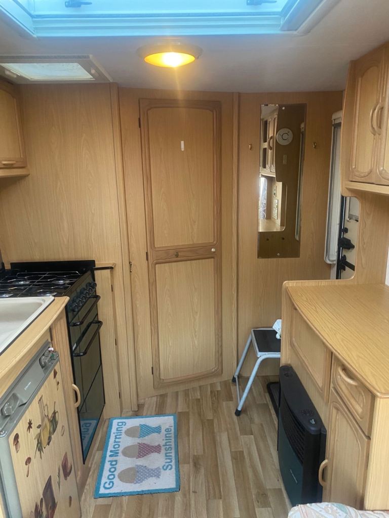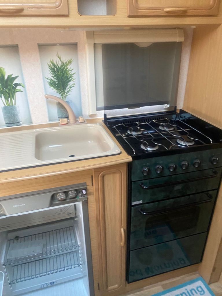 Two birth Caravan, in very good condition, full cooker oven, three-way fridge, electric and gas Heating shower room cassette toilet Hook up lead step water cans and a motor mover