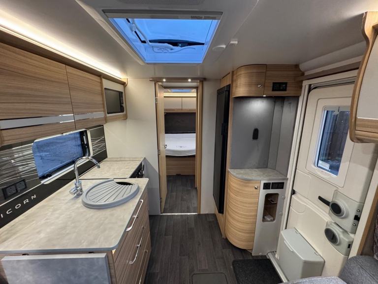 Full rear bedroom featuring a central forward facing island bed with adjoining wardrobes - central dressing room incorporating individual shower cubicle, toilet - offside kitchen incorporating a tower fridge - 2 x singles / double /lounge area at the front - this ever popular model blends cutting edge design with unparalleled comfort and practical innovation- HARDLY EVER USED and boasting an exceptional specification.