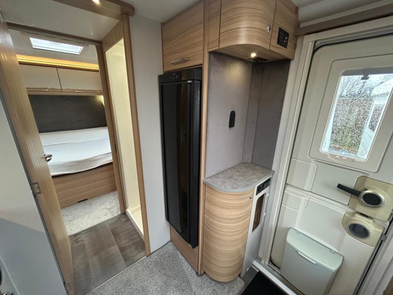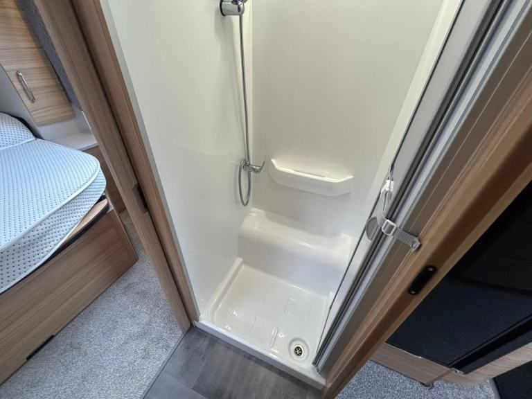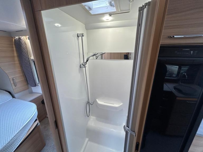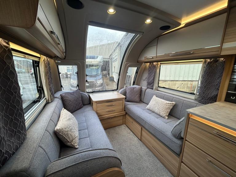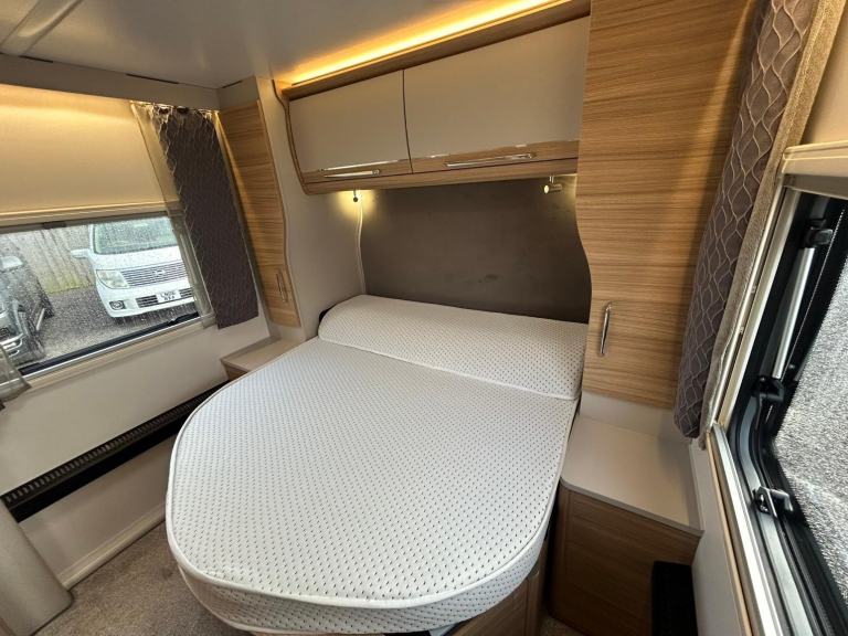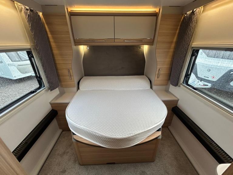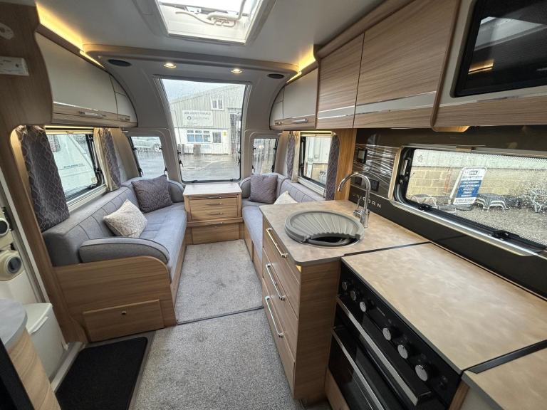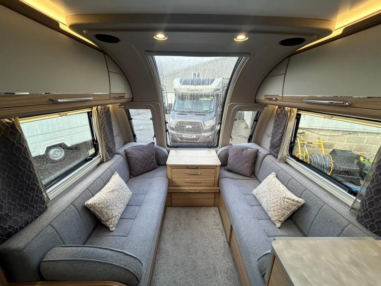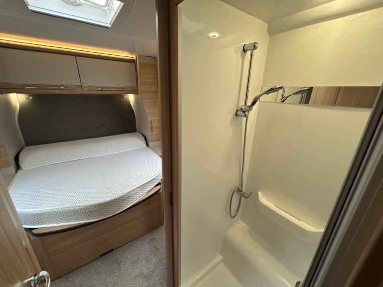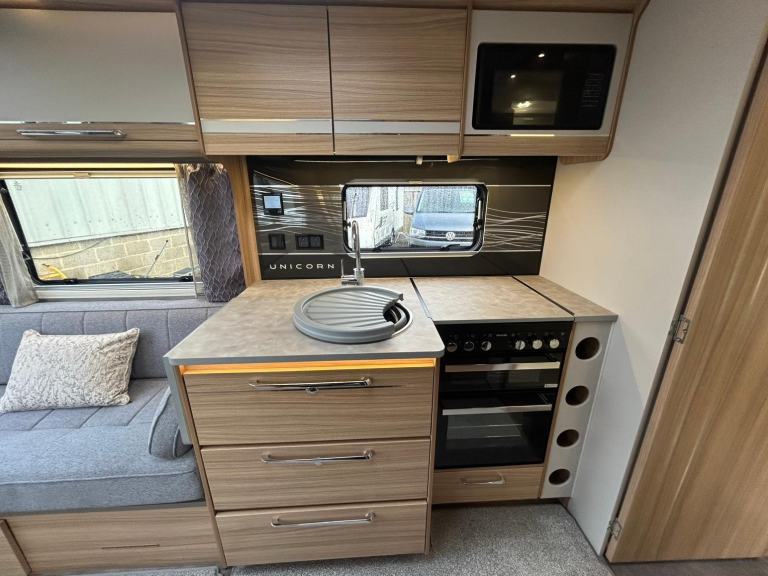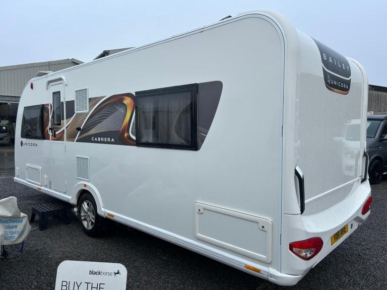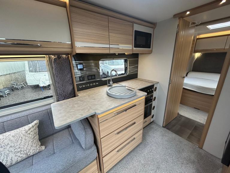 Full rear bedroom featuring a central island bed - central dressing room incorporating individual shower, vanity unit and toilet - central offside kitchen - 2 x sofas at the front converting to a double bed - a spacious and luxurious 4 berth caravan boasting a large panoramic window for stunning views . With a length of 7340mm and a width of 2264mm, there's plenty of room for the whole family to relax and unwind. With a maximum Technically Permissible Laden Mass (MTPLM) of 1600kg, this caravan offers both comfort and convenience as standard The modern design and stylish interior coupled with a host of extras make it a home away from home, featuring all the amenities you need for a comfortable trip. Whether you're planning a weekend getaway or a longer road trip, the Bailey Unicorn Cabrera is the perfect choice for your next caravan adventure.