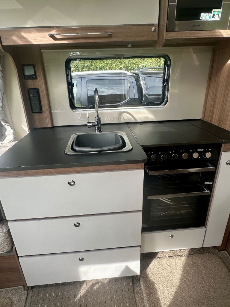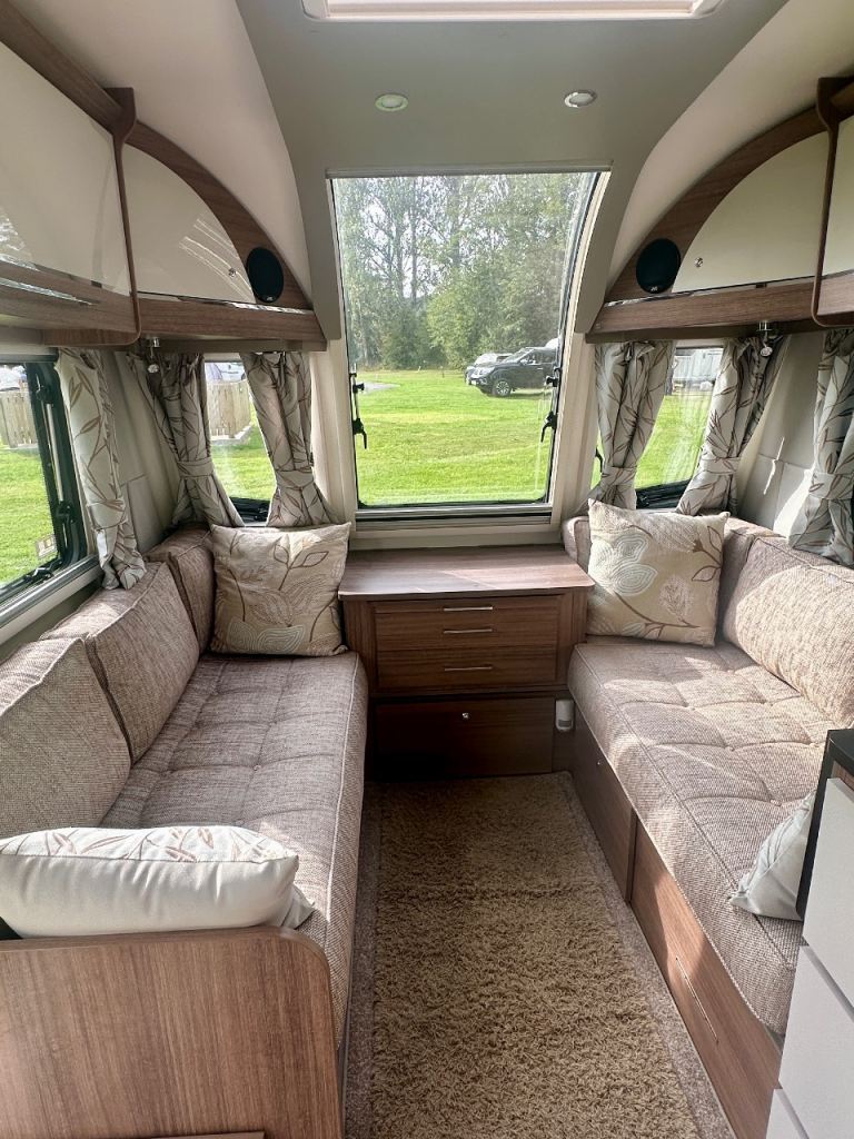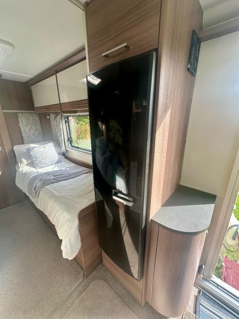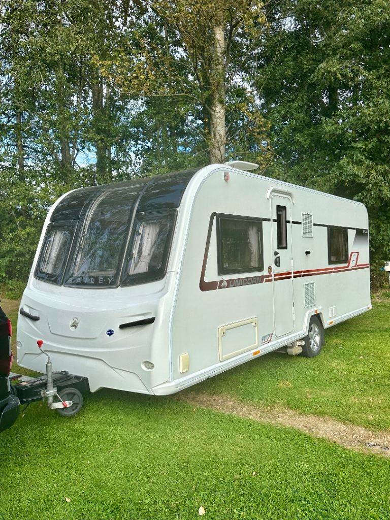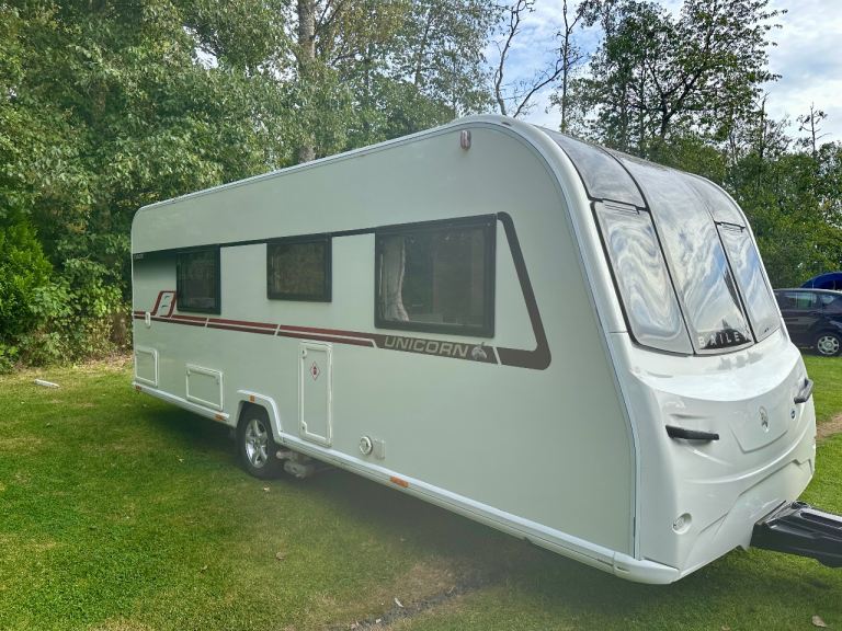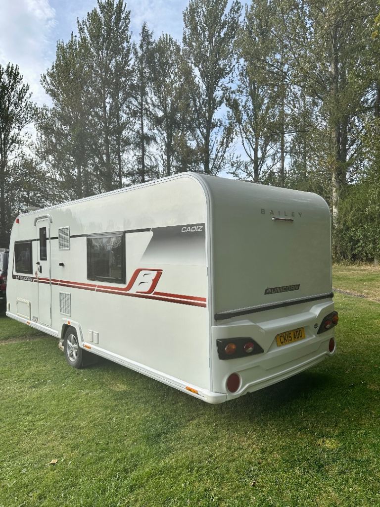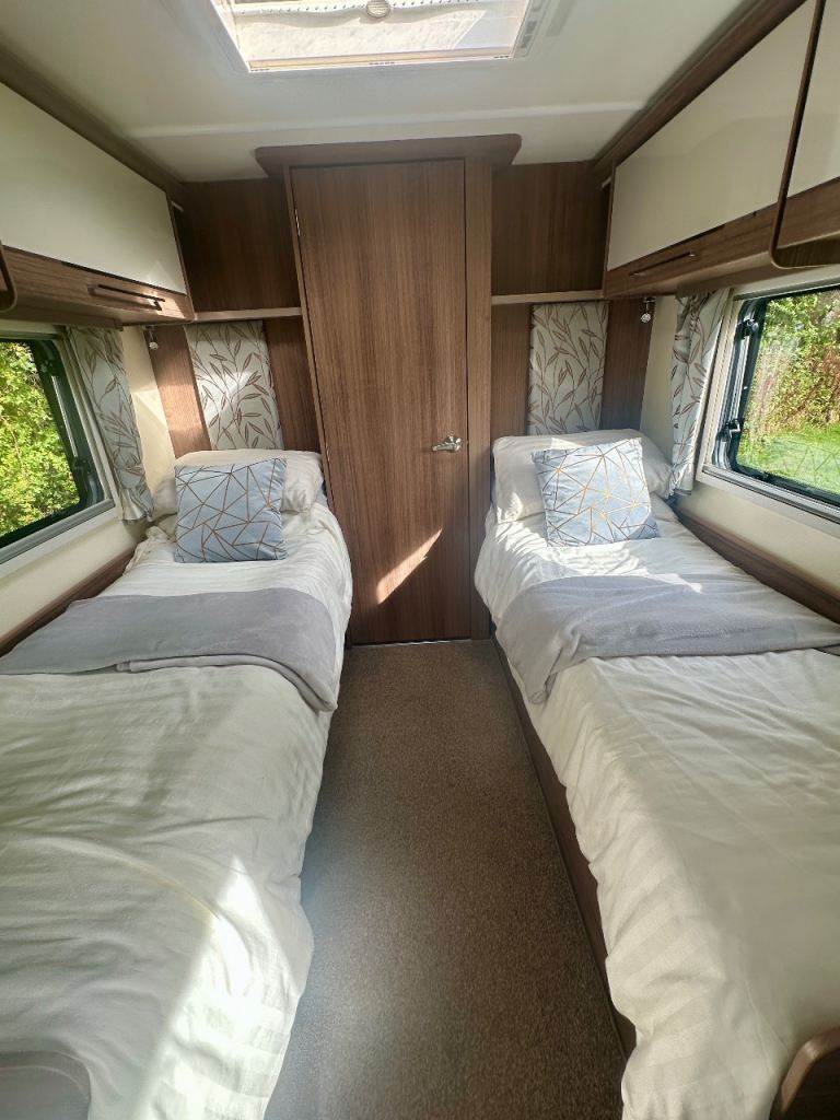 Four berth Bailey Unicorn Cadiz 2018. Two of which are single beds. End bathroom. Full service history. Immaculate condition. power tough mover. track control system, wheel locks, hitch lock, alarm.