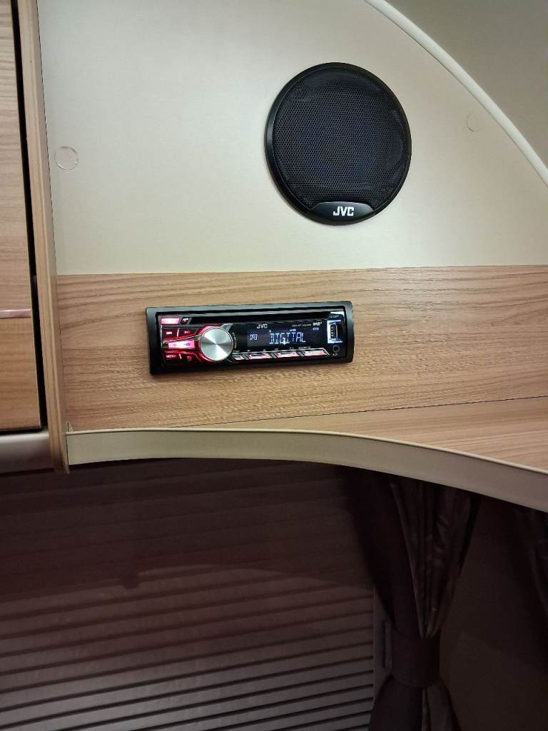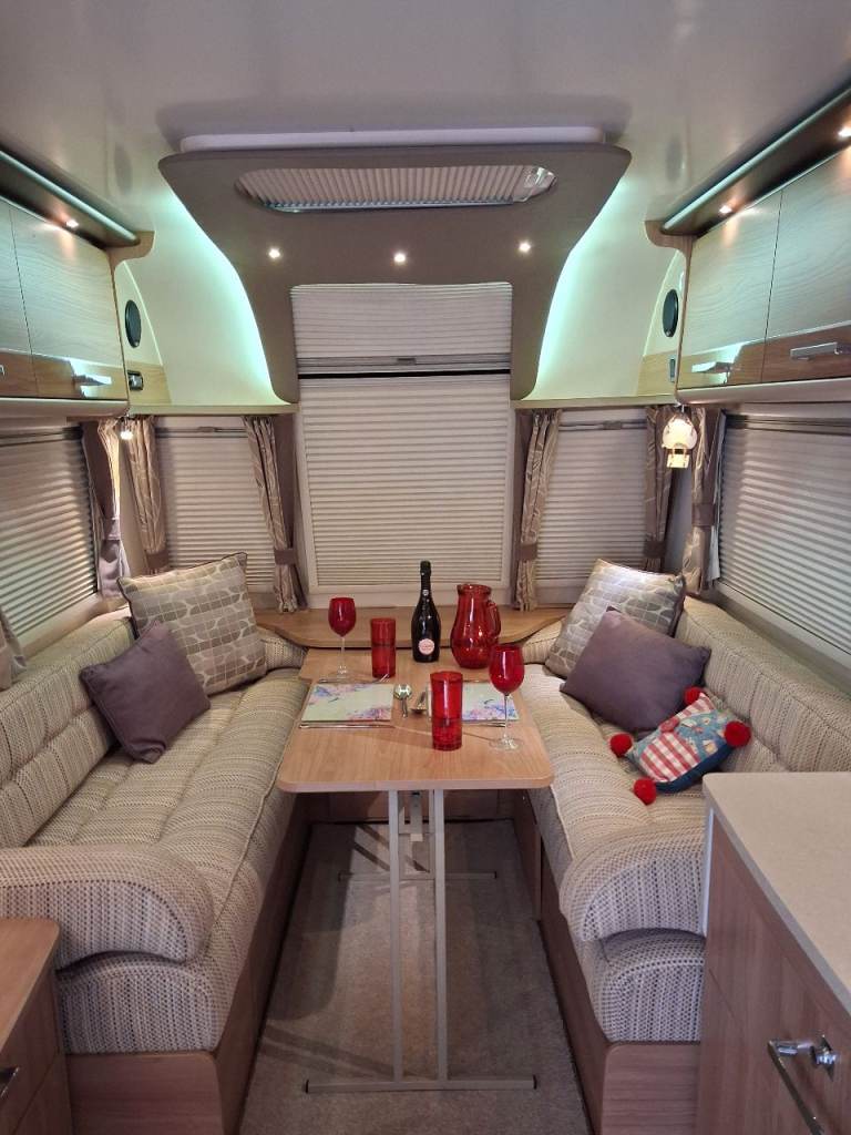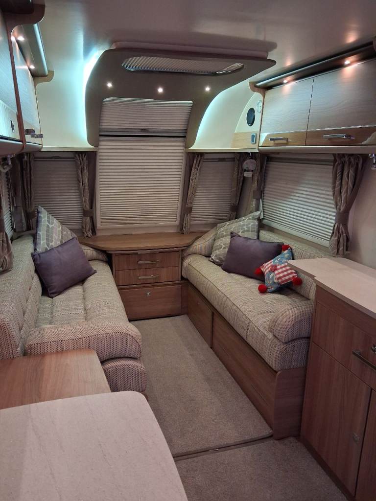2 Gas Bottles (1 full 1 half full) with pigtails, Alde wet heating + water heating, door security/access handle, seating convertion to single beds/ double bed, loose fit carpets, free standing table (fold up to stow away), hot and cold mixer taps (kitchen & shower), flush cassette toilet, battery charger. Dab radio.