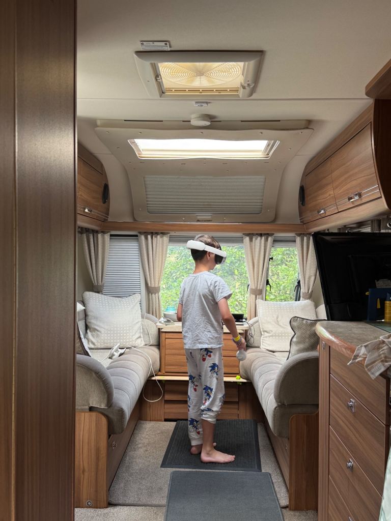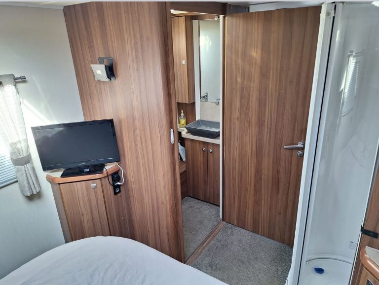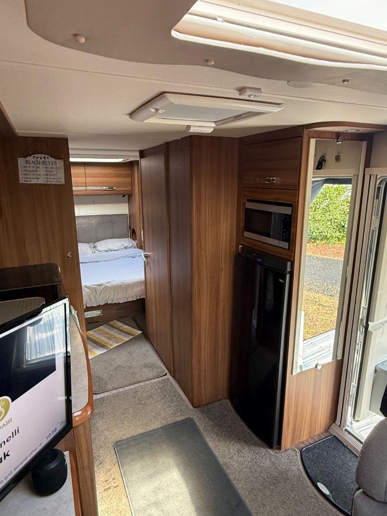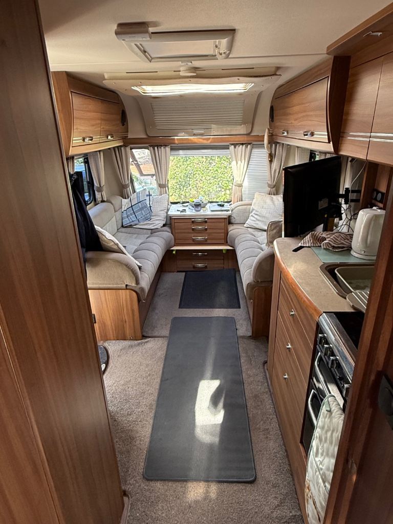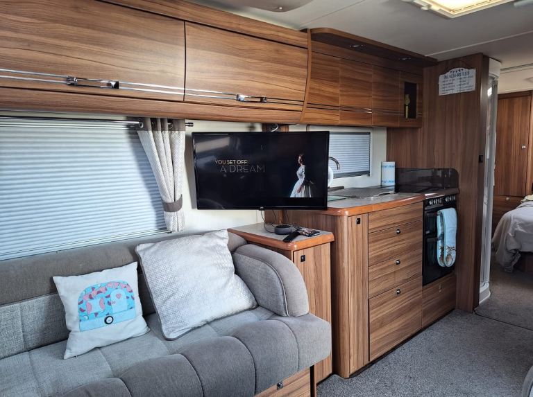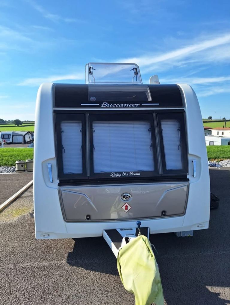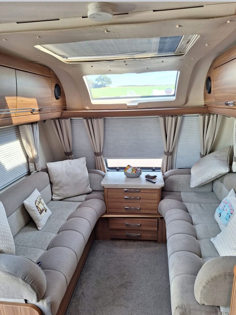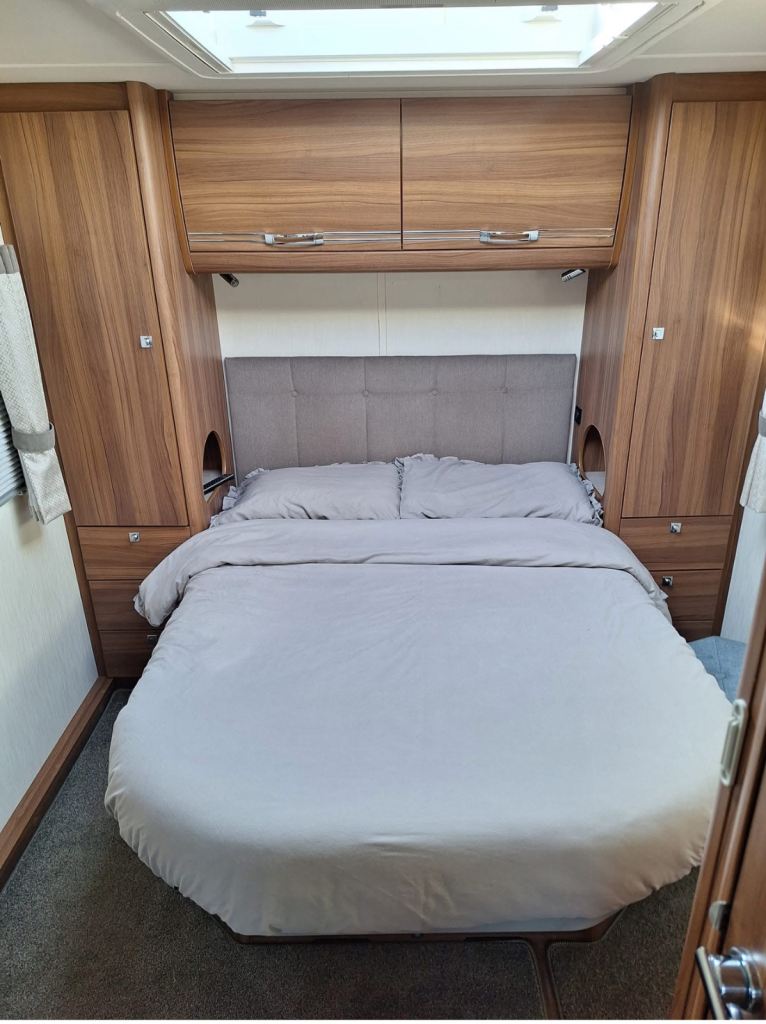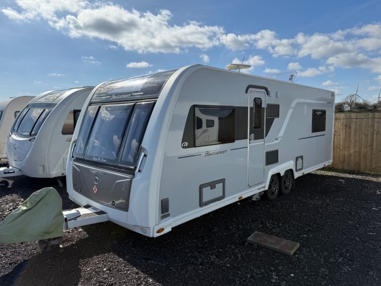 Buccaneer Caravel 2016 it is a 4-berth, 8-foot wide touring caravan with a fixed island end bedroom , underfloor heating, a self-levelling system, and a panoramic sunroof.