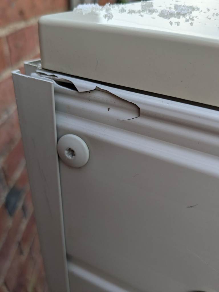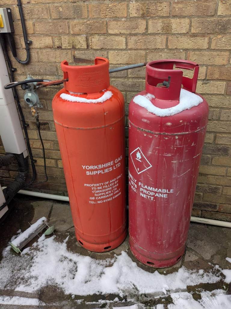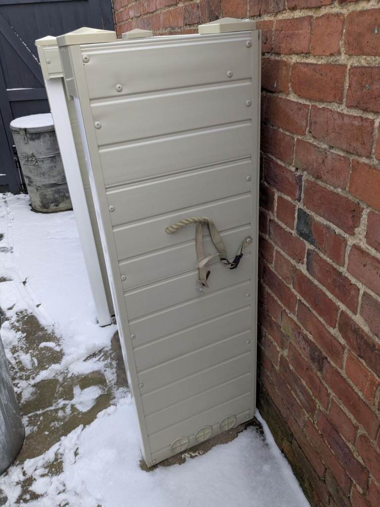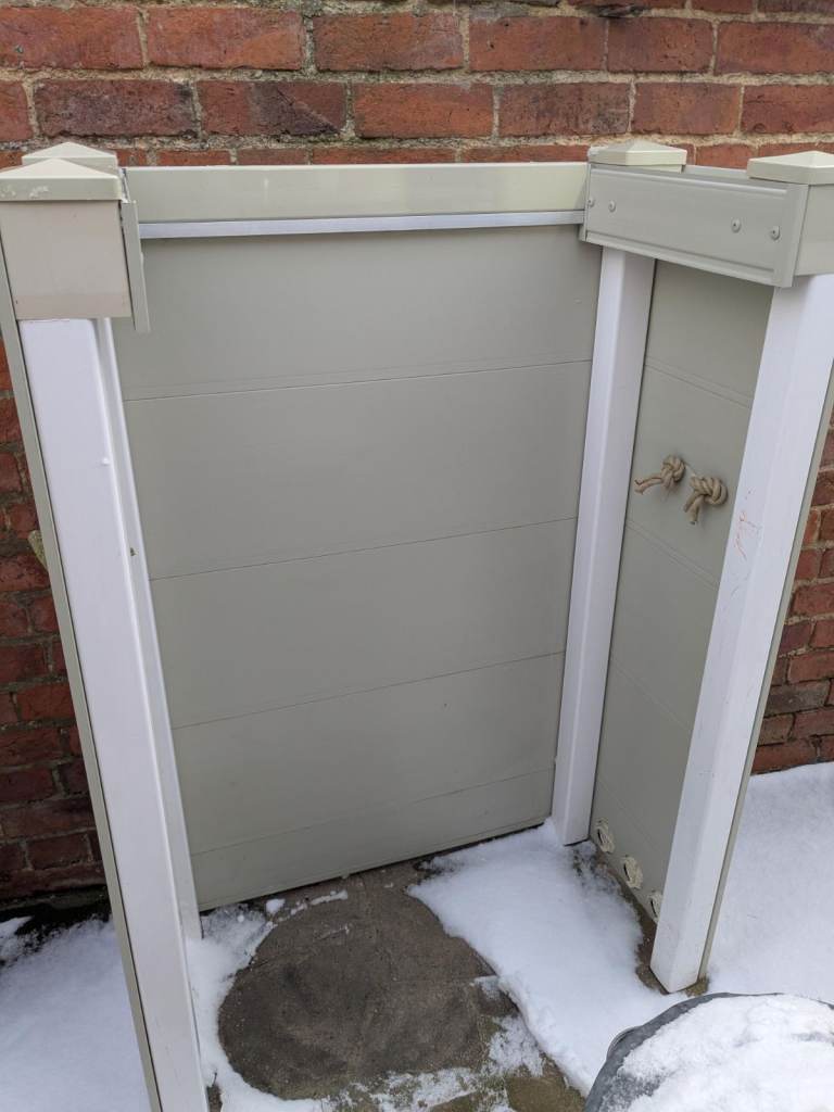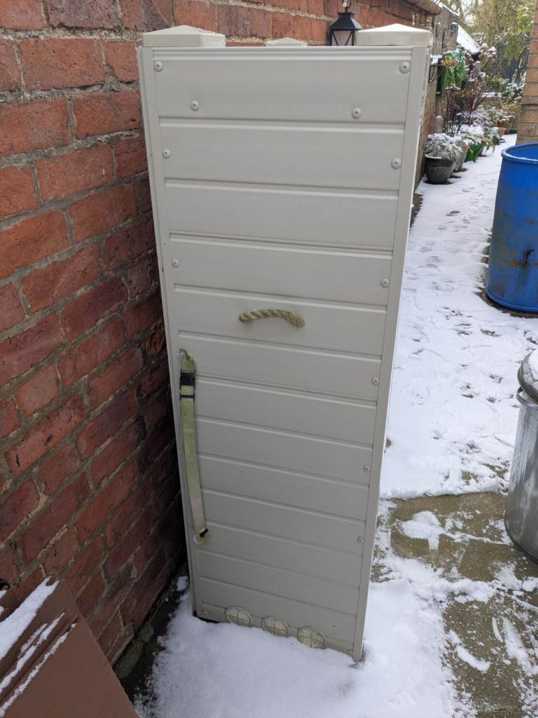 This covers 2 x 47kg calor gas bottles. Great to hide them . as shown in photos,2 small knocks. we never got around to attaching it to the wall and it blew over. Actually look worse in the photo than they are.