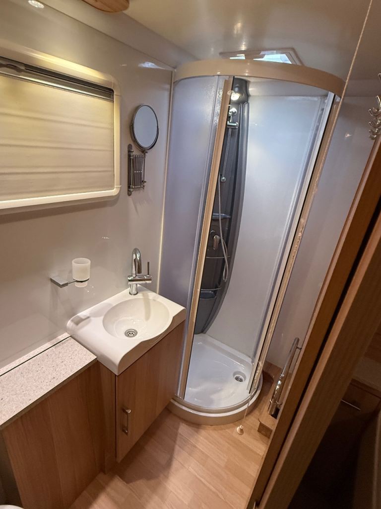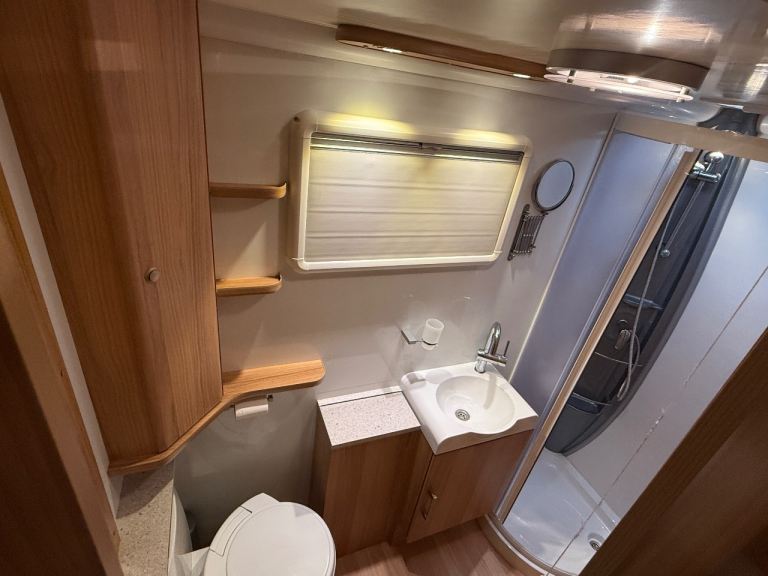 Well-equipped interior with a modern kitchen, washroom with separate shower, and a bright, roomy living area. Plenty of storage throughout.