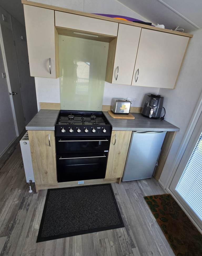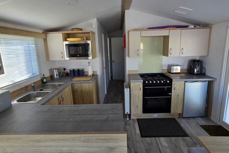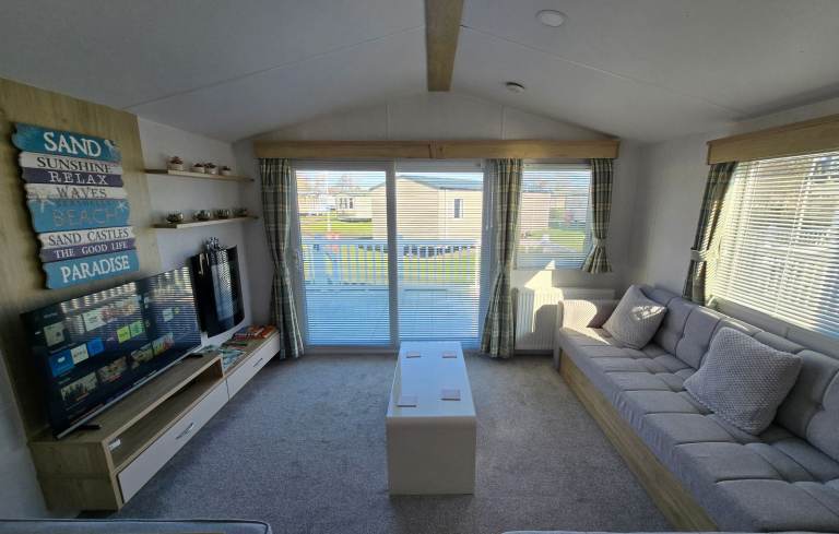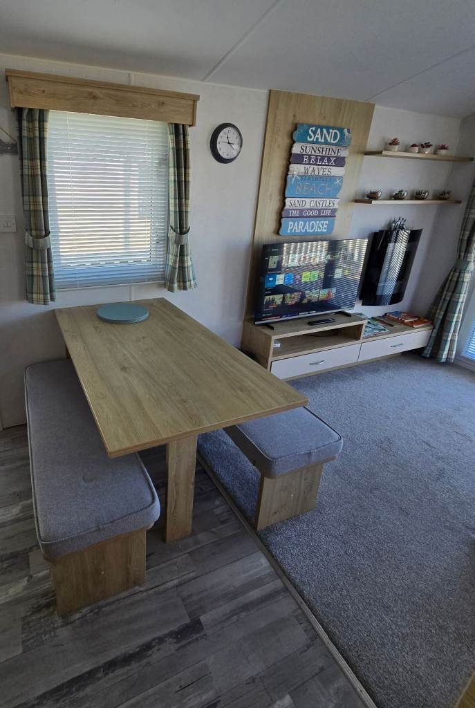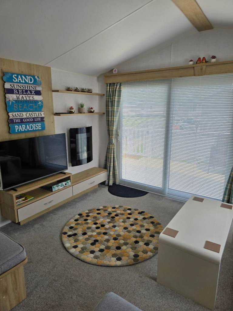Cosy lounge with sliding doors, built in fire with the TV media wall and L shaped integrated sofa. 2 twin bed rooms and a lovely master bedroom. 2 toilets one with a shower. Double glazed windows and doors with Gas central heating throughout.