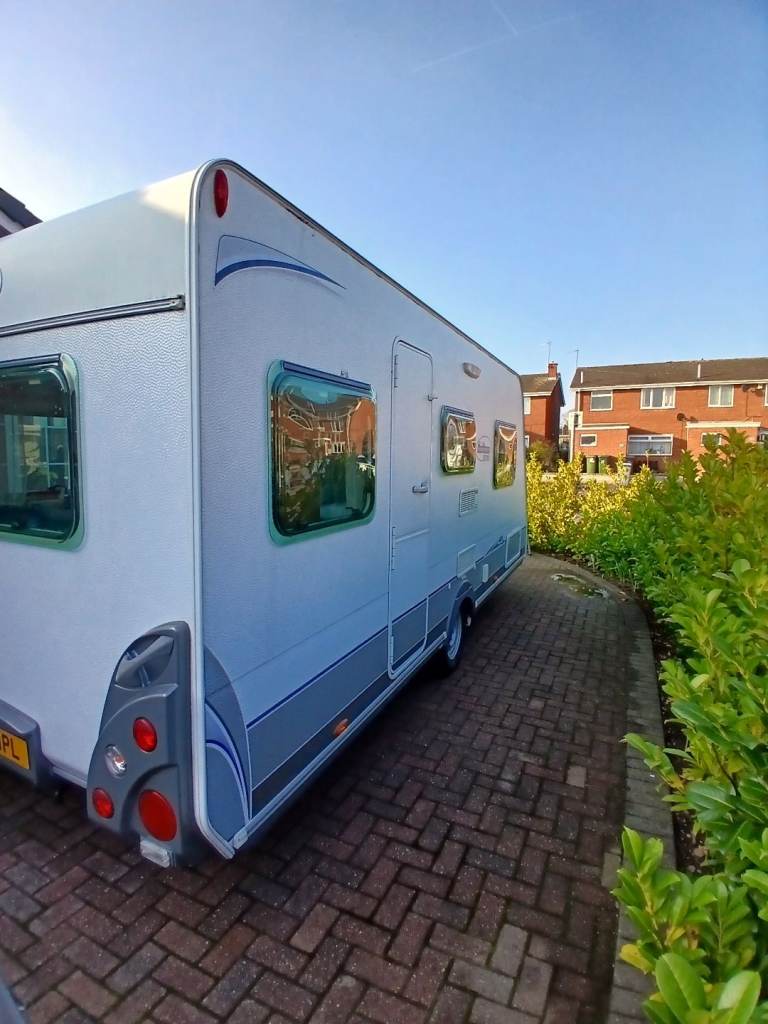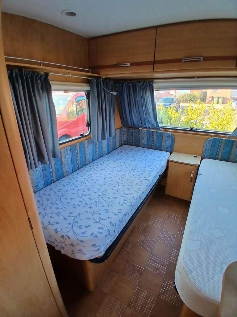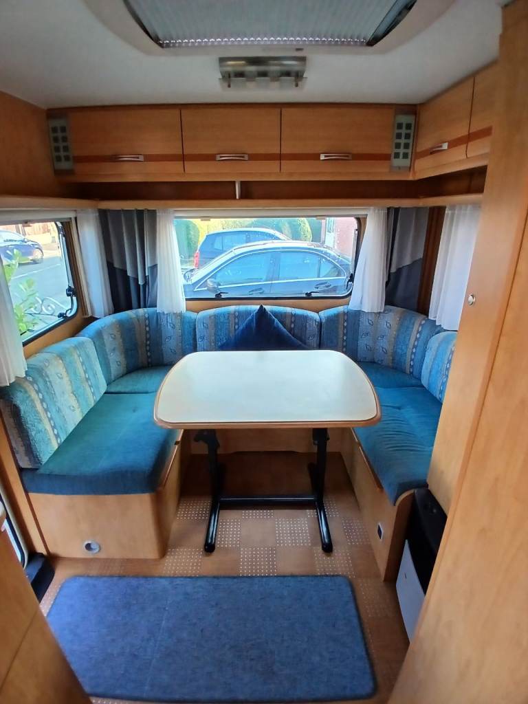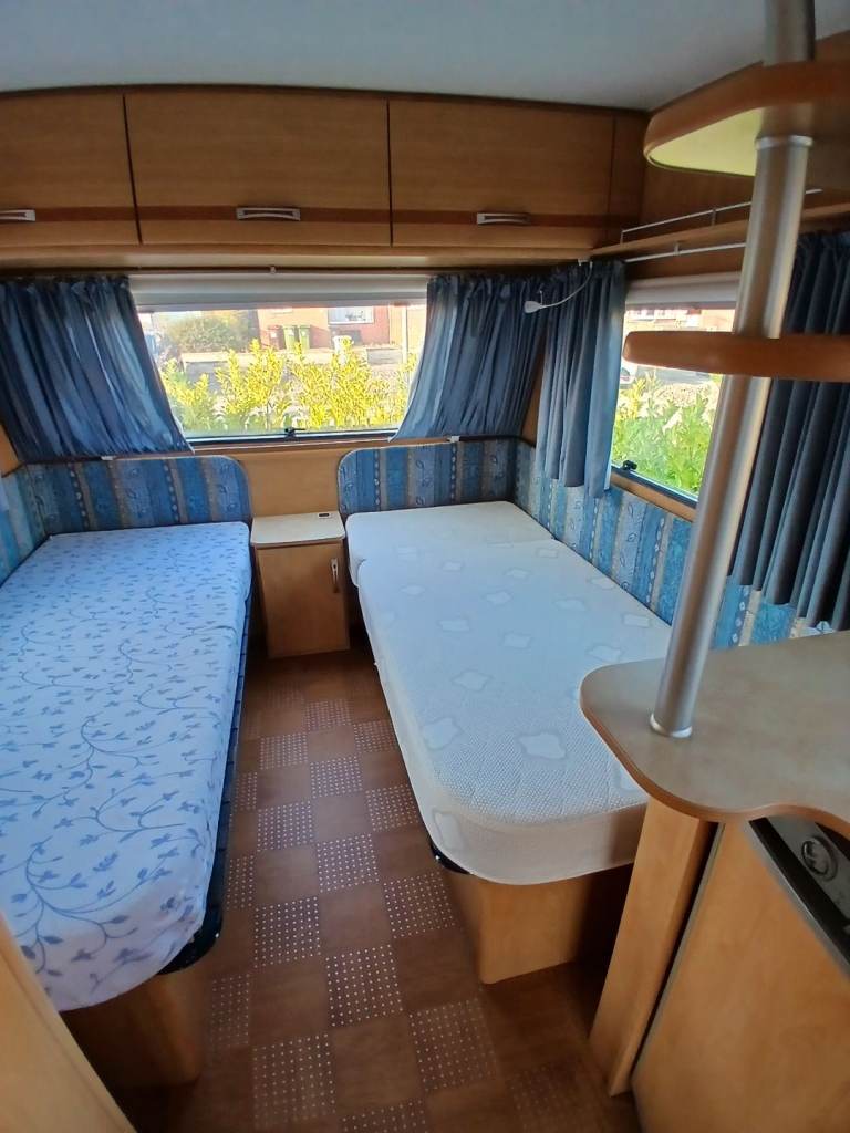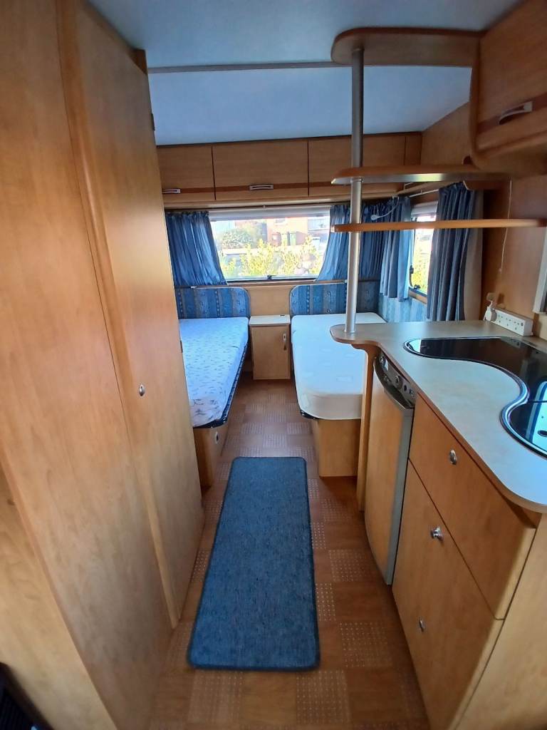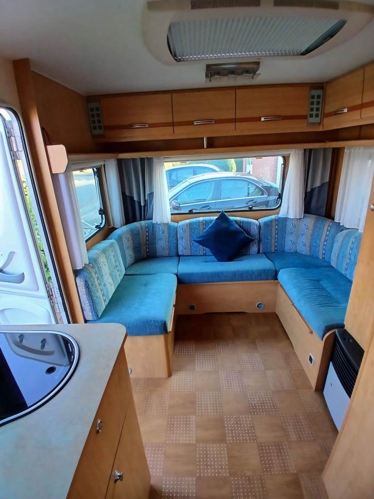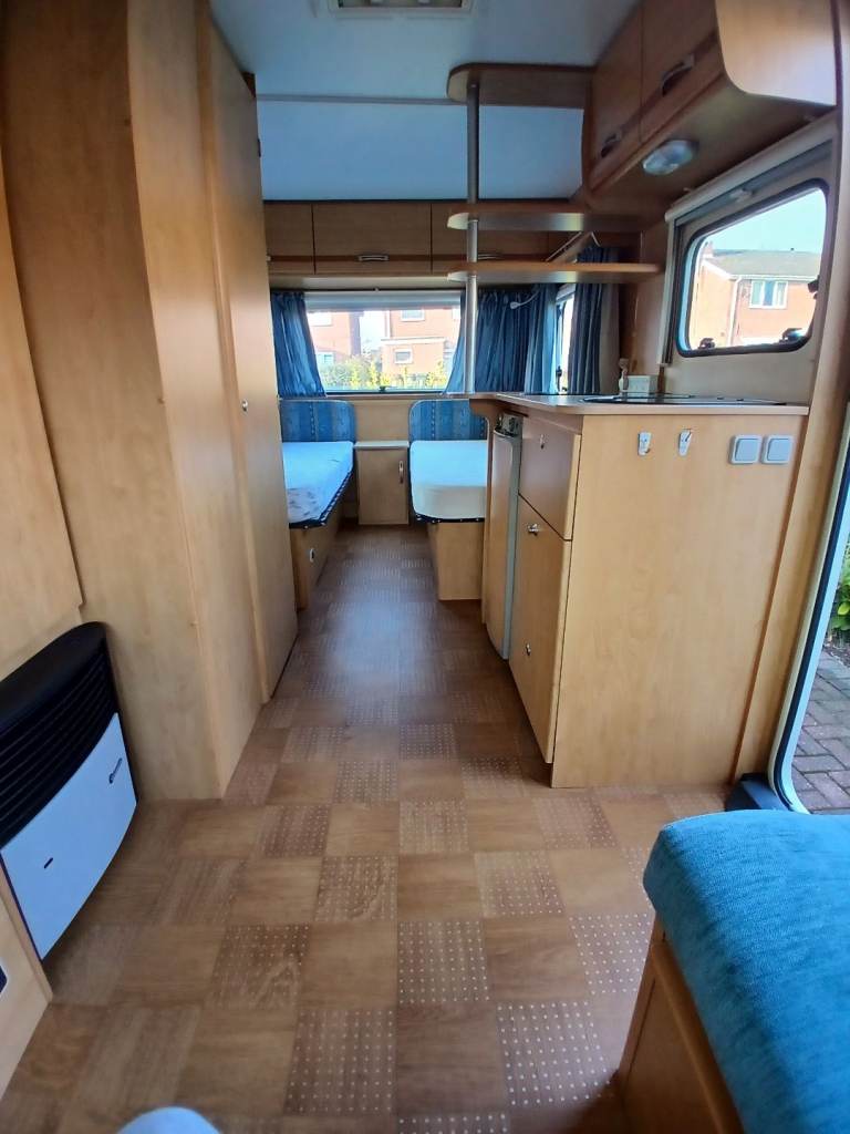 Hello, here we have for sale is this lovely 4 birth with u shape seating which turns into a double bed at at the rear 2 single fixed beds but also turns into a double bed. Its had a new gas regulator, new hot water heater, and a new bathroom tap. Everything works as it should. Its got an onboard water tank aswell. Its in great condition inside and out and comes with a motor mover, 3/4 kampa air awning, water and waste barrels, water pump x2, leisure battery, hook up cable, gas bottle and lots of other things. First to see will buy. Location is worksop.