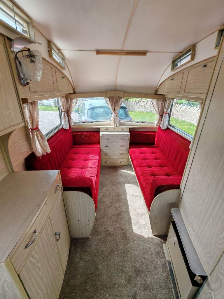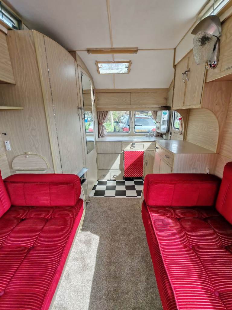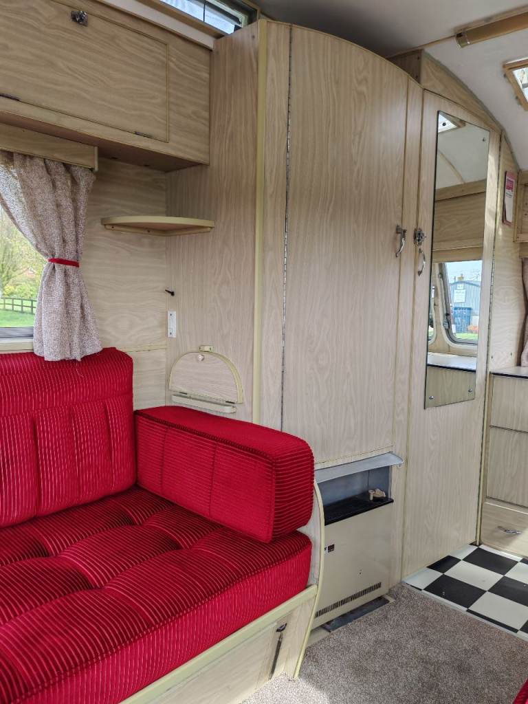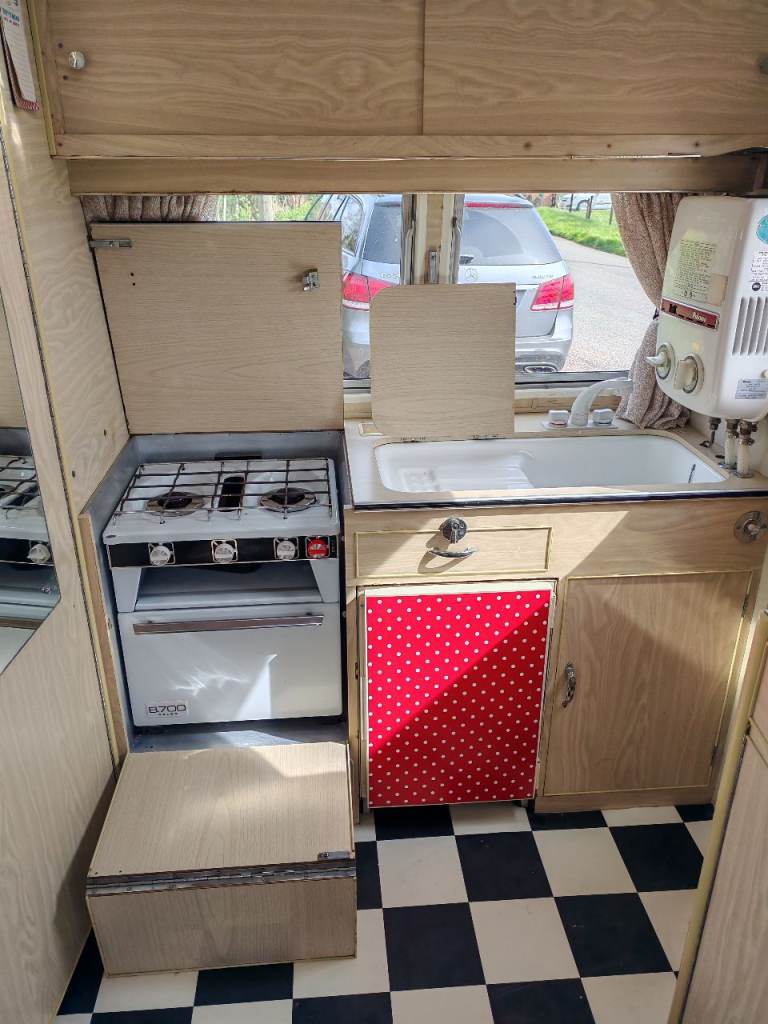 Full oven grill and hobbs fridge battery and electric lighting mains hook up with on board battery charger carver gas room heater on board water heater gas lantern light store away dinning table sink with electric pump side locker holds 2 gas bottles original seating in very good condition there is no damp or leaks everything in perfect working order and in very good the tyres are recent and there is a spare. It tows perfectly all the tow lights work as they should and the chassis is solid it really is a beautiful little caravan ready to use or show my original intent when I got the caravan was to show it but unfortunately lack of space to keep it where it is it's best to be sold and enjoyed by someone else for further info please call thanks