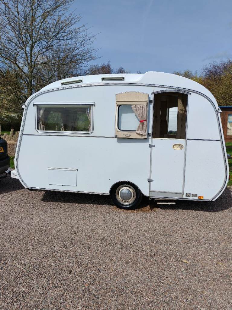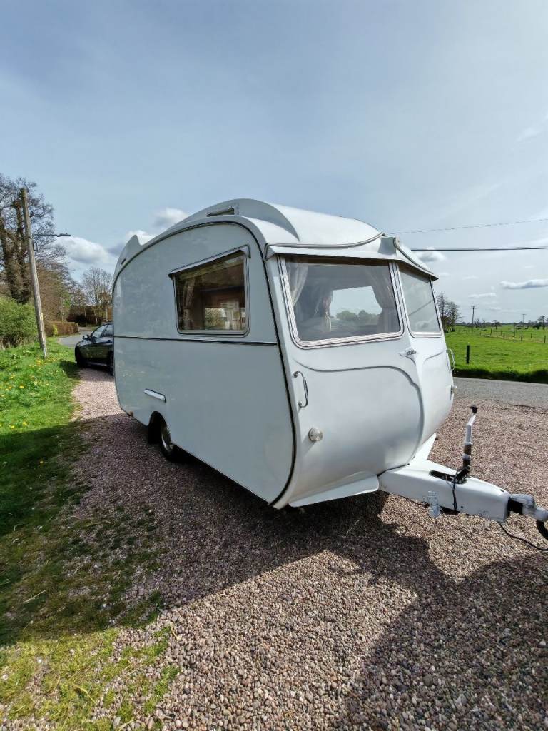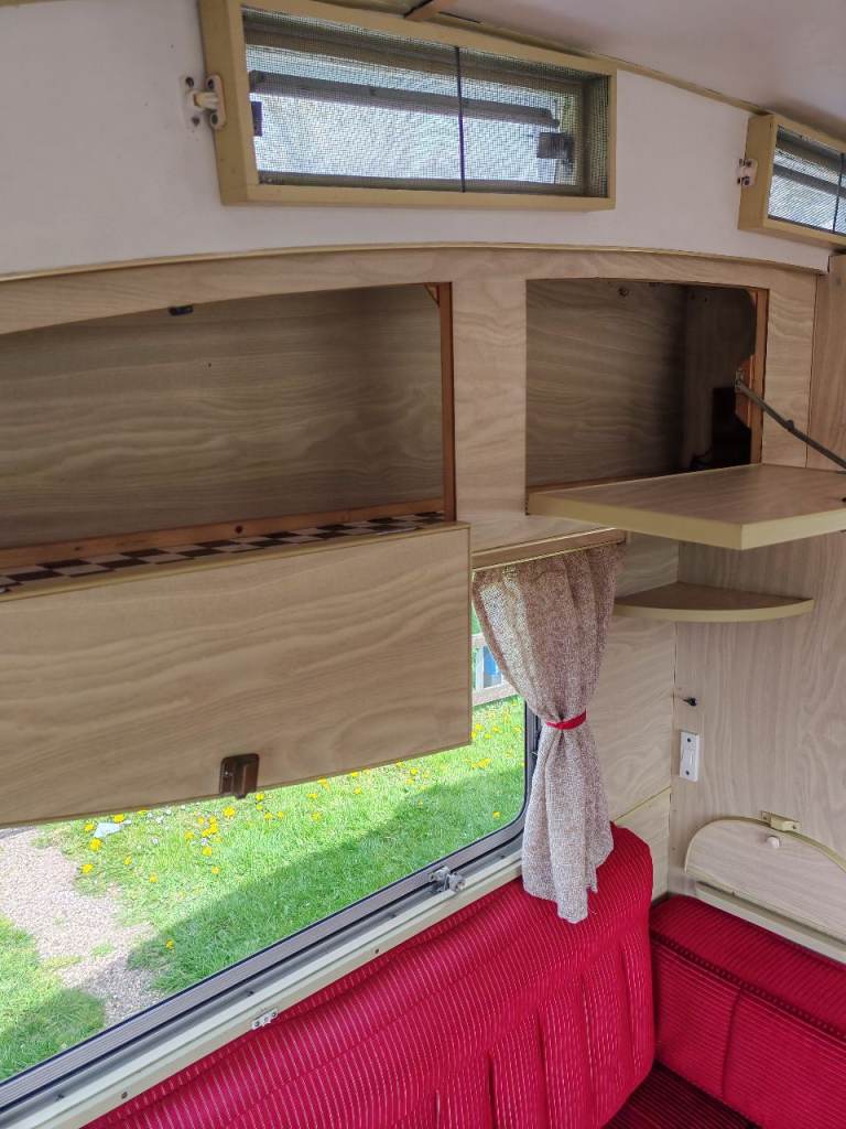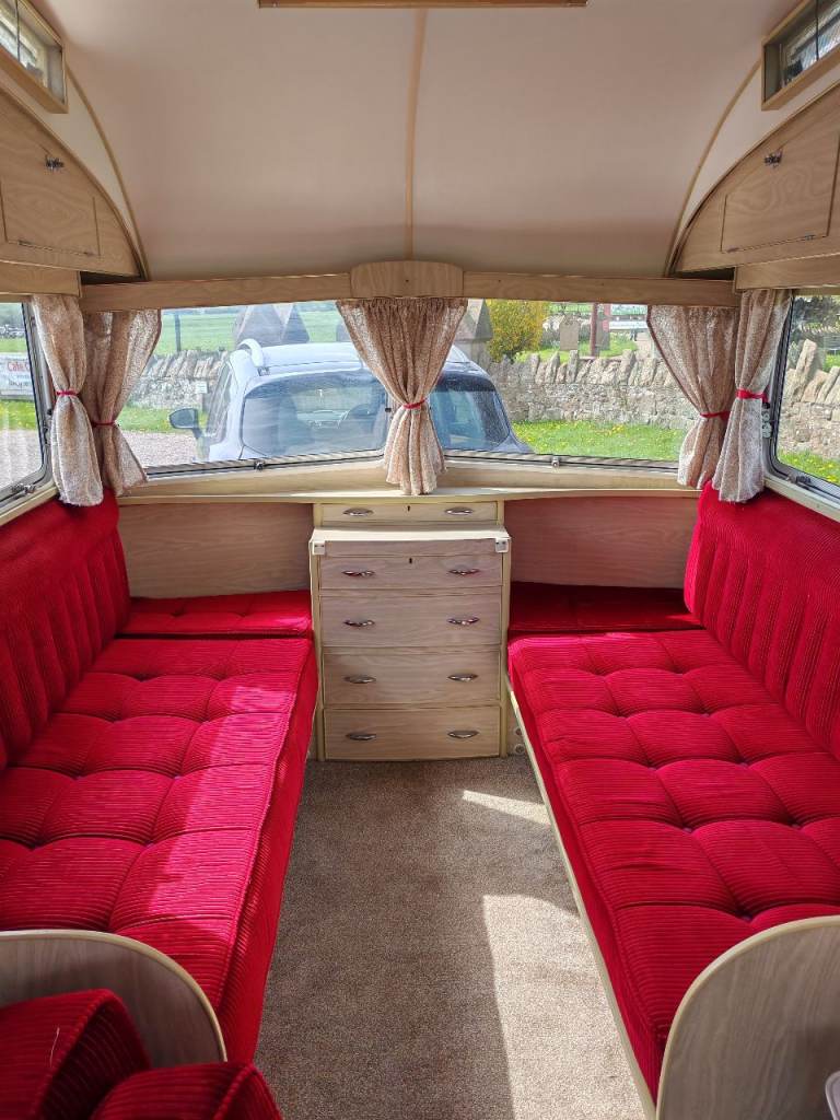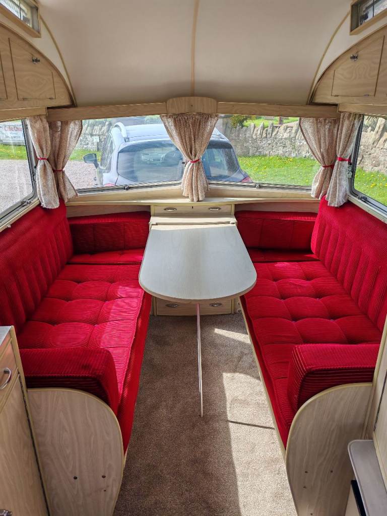 Full oven grill and hobbs fridge battery and electric lighting mains hook up with on board battery charger carver gas room heater on board water heater gas lantern light store away dinning table sink with electric pump side locker holds 2 gas bottles original seating in very good condition there is no damp or leaks everything in perfect working order and in very good the tyres are recent and there is a spare. It tows perfectly all the tow lights work as they should and the chassis is solid it really is a beautiful little caravan ready to use or show my original intent when I got the caravan was to show it but unfortunately lack of space to keep it where it is it's best to be sold and enjoyed by someone else for further info please call thanks