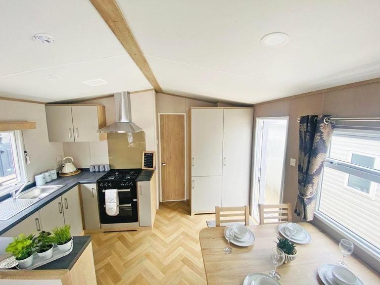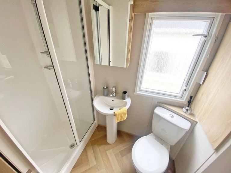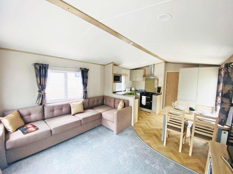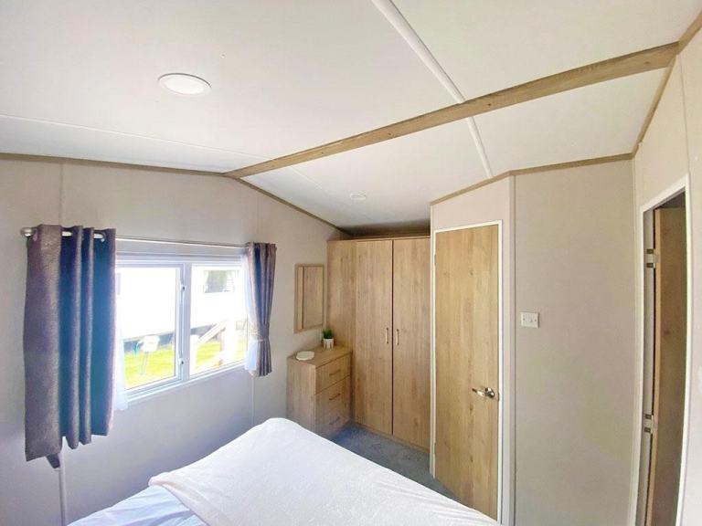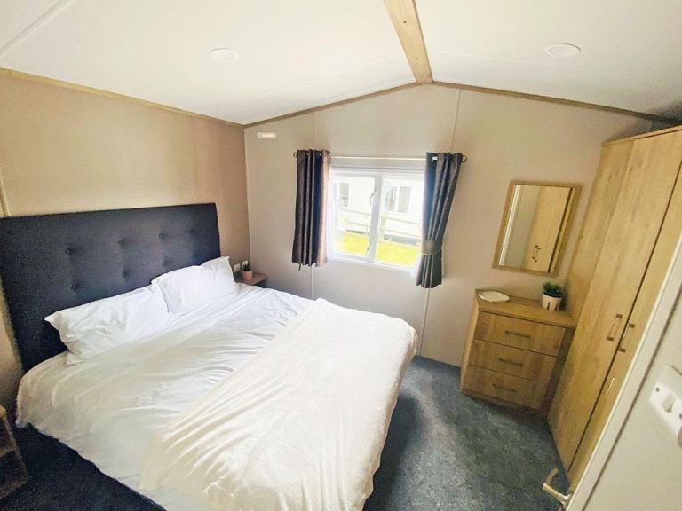 The 2024 Carnaby Ashdale is a modern static caravan ideal for families, available in 2- or 3-bedroom options. It features a durable galvanized chassis, a front bay window, and a spacious living area with L-shaped seating and a TV cabinet. The master bedroom has a king-size bed, large wardrobe, and en-suite WC. Twin rooms are roomy with ample storage. The main bathroom has a shower, sink, and mirror. It also includes central heating, double glazing.