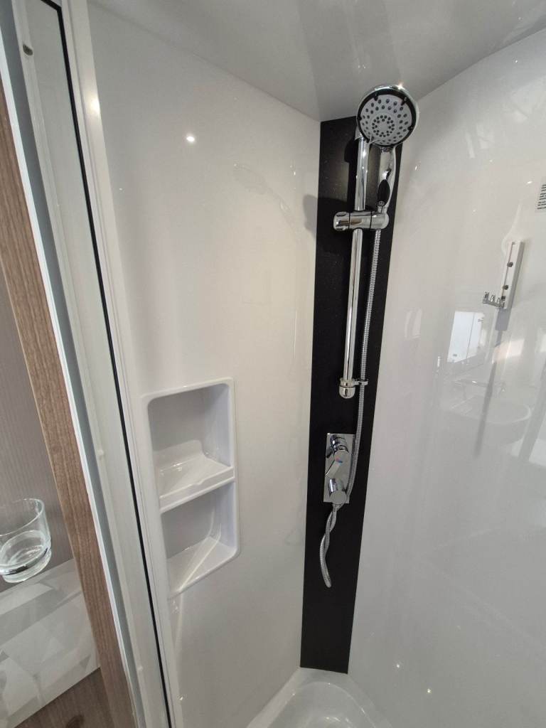 Inside, the Laser 675 offers a luxurious 4-berth layout, ideal for families or couples wanting extra space. The transverse island bed and large end washroom provide comfort and privacy, while the spacious front lounge easily converts into another double bed.