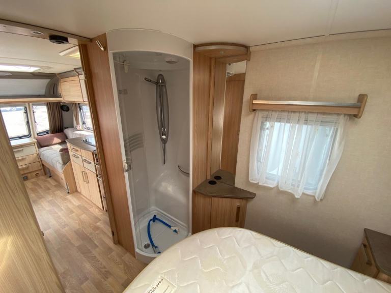 Lovely condition, benefitting from a fitted Motor Mover Features Include: alko wheel lock, beautiful condition, electric heater, external 230v 3 pin socket, external bbq point, fixed bed, front lounge with bed conversion, gas water heater, island bed, large rooflight, leisure battery, mains electric, mover fitted, part exchange welcome, side bathroom, top of the range