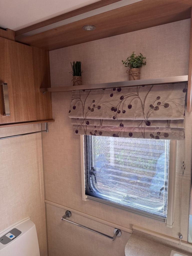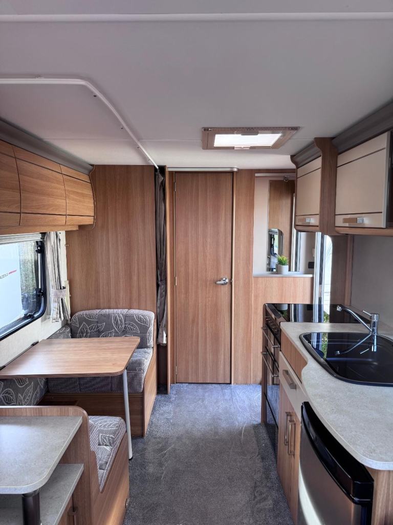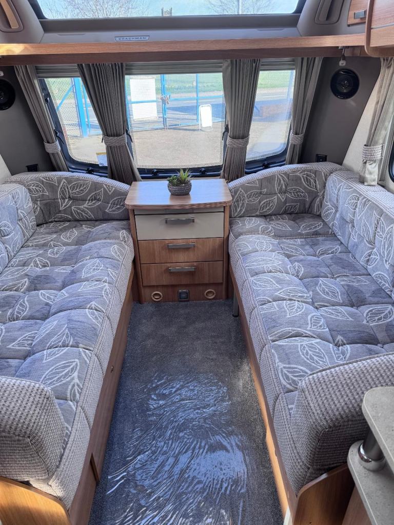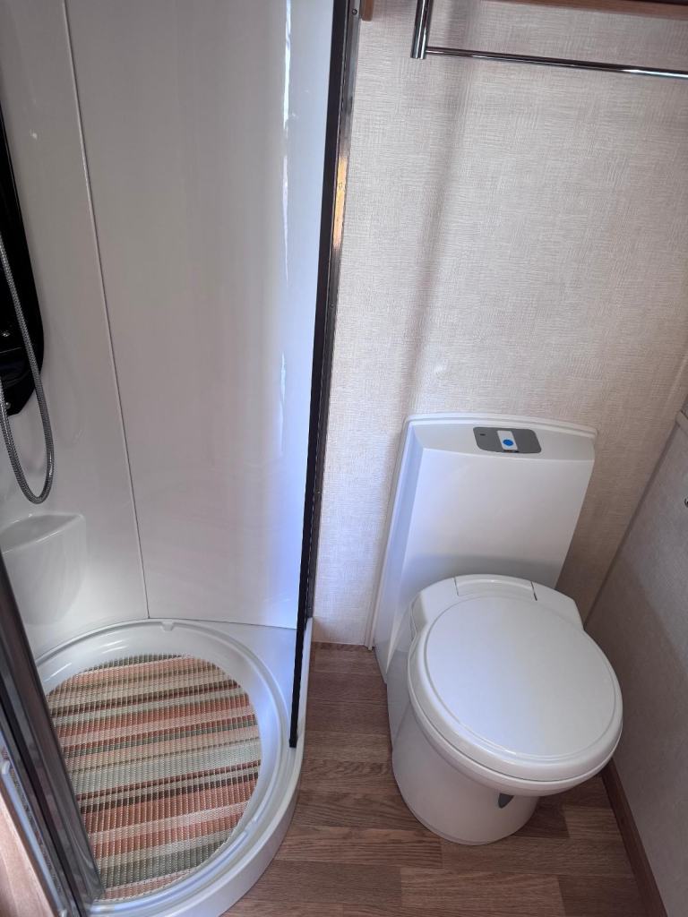 Spacious 4 berth top of the range tourer with large end washroom, seperate shower, a side dinette with fold up bunk, adjacent kitchen and full length parallel seating to the front which converts to a double bed by night.