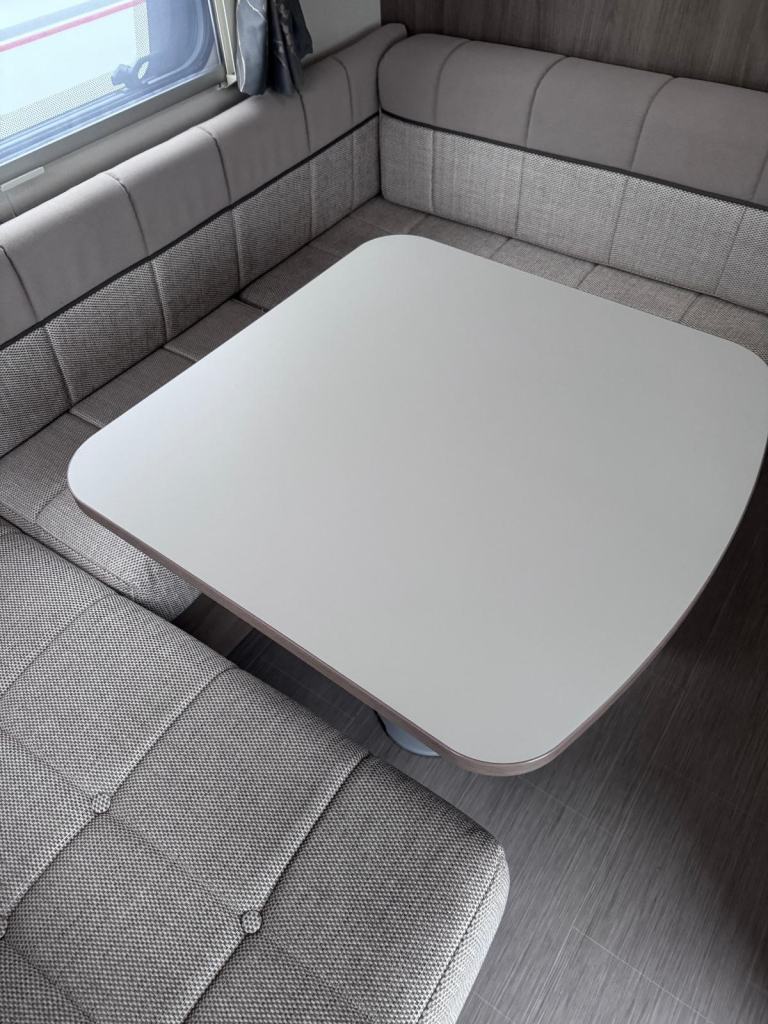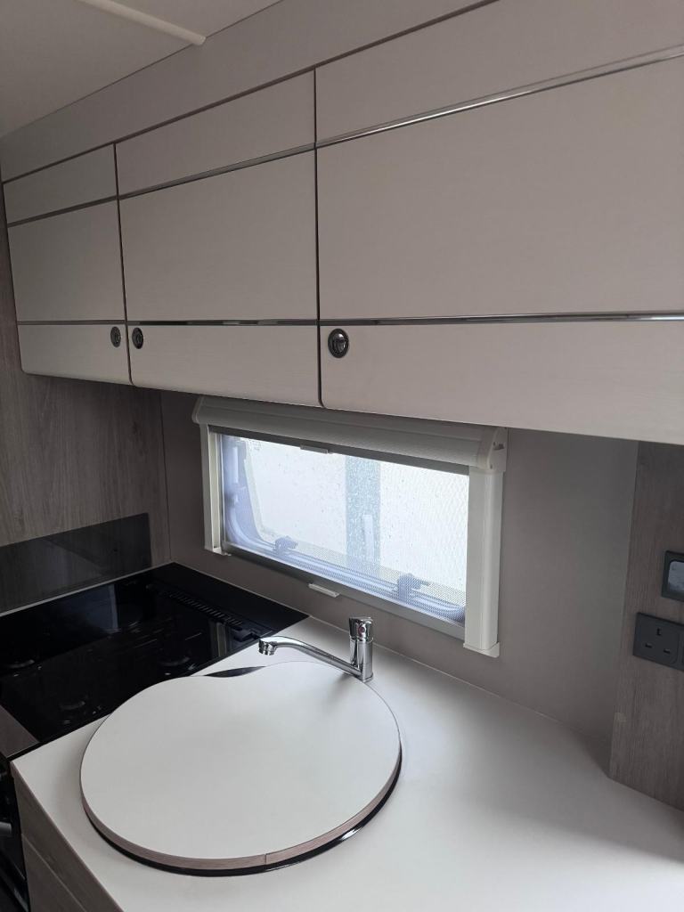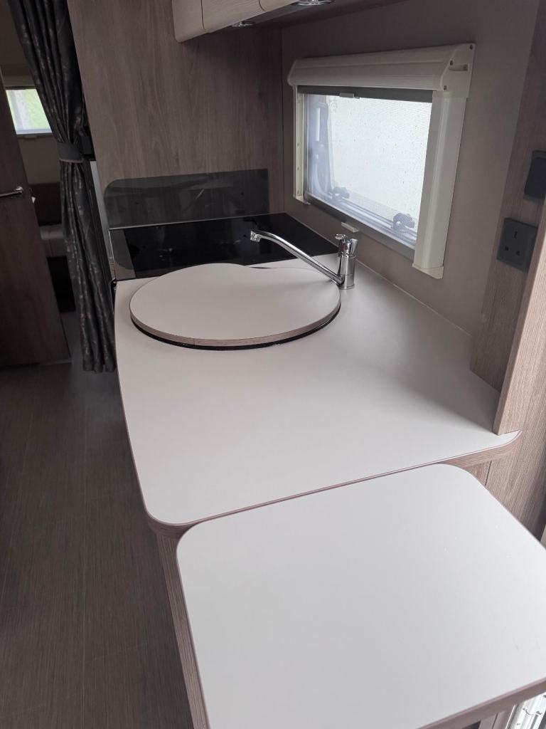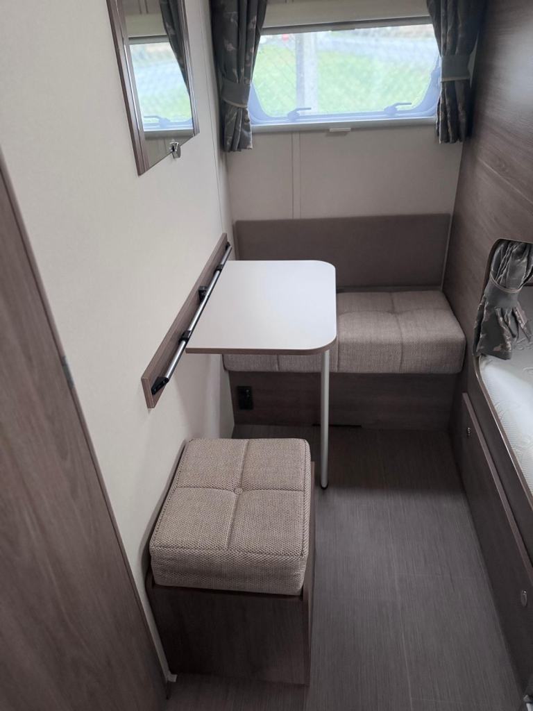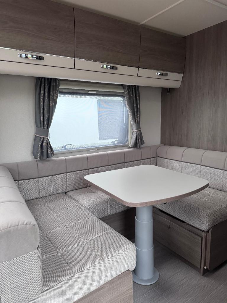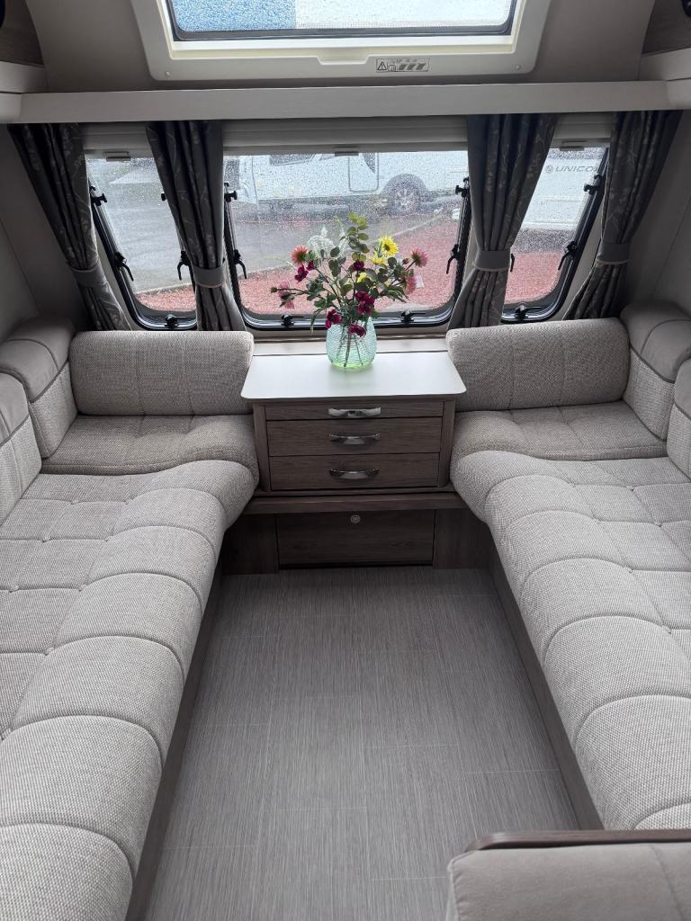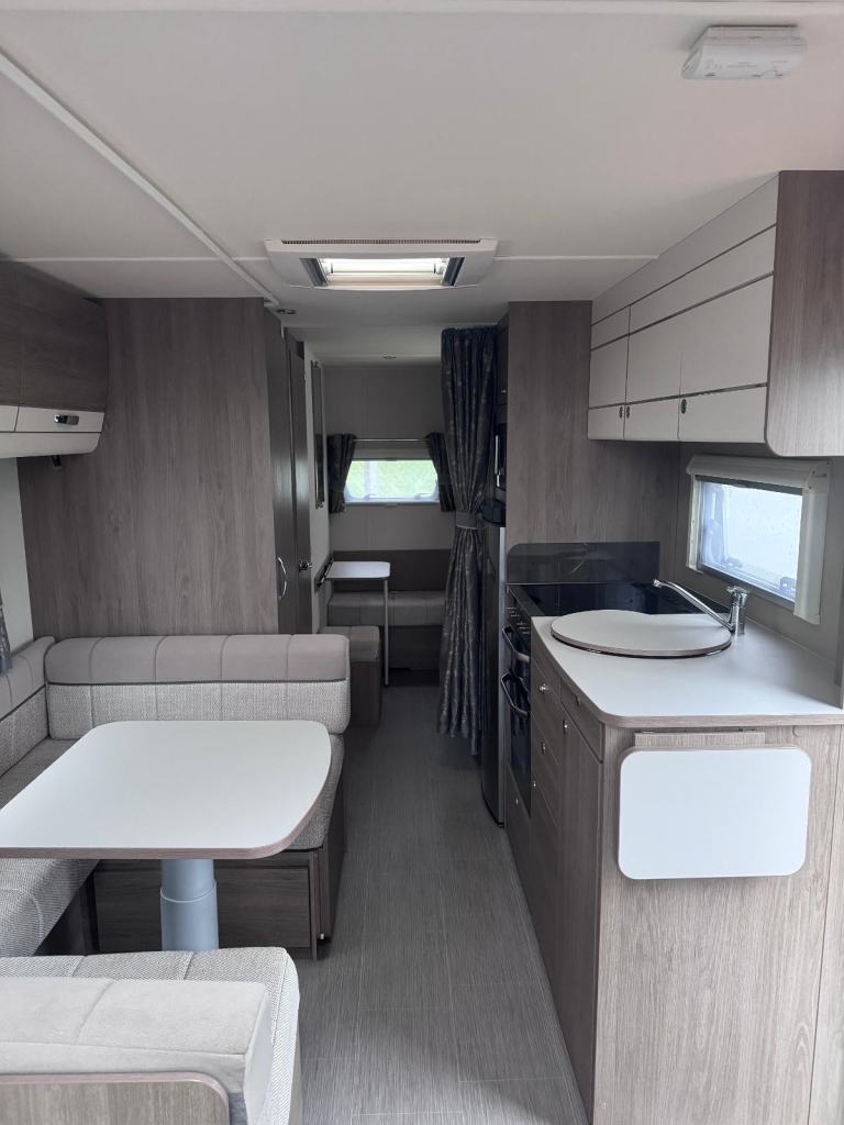 Super-sized, 8ft wide, twin-axle tourer or semi-static. Impressively practical family caravan with dedicated fixed bunks to the rear with the kids seating zone and adjacent washroom, a well equipped kitchen and a U shaped central dining area, leading to a spacious front lounge.