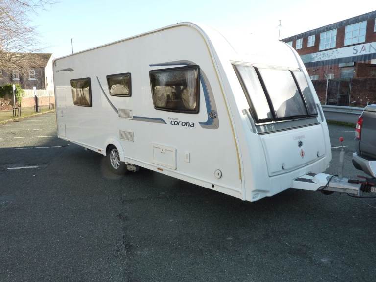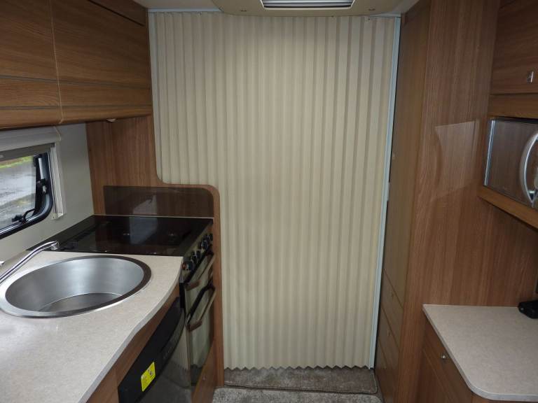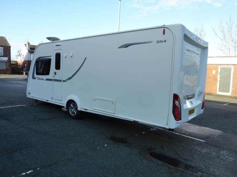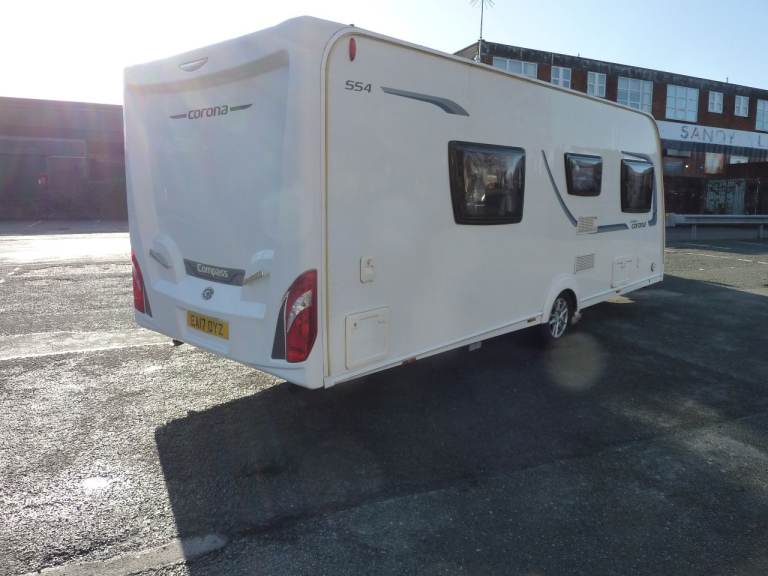 Compass Corona 554 4 Berth 2016 FIXED ISLAND BED in absolute stunning condition through out and must be seen! Double bed at the front. Centre kitchen with oven, hob, grill, and 3 way fridge. Opposite is TV stand with a built in microwave above and a double wardrobe. Towards the rear is a large transverse fixed island bed with storage below. There is plenty of wardrobe space around the bed. There is also a sliding door to make an end bedroom. At the rear is a large luxury dressing room with swivel cassette toilet, sink, vanity unit, towel radiator and a large separate step in shower.