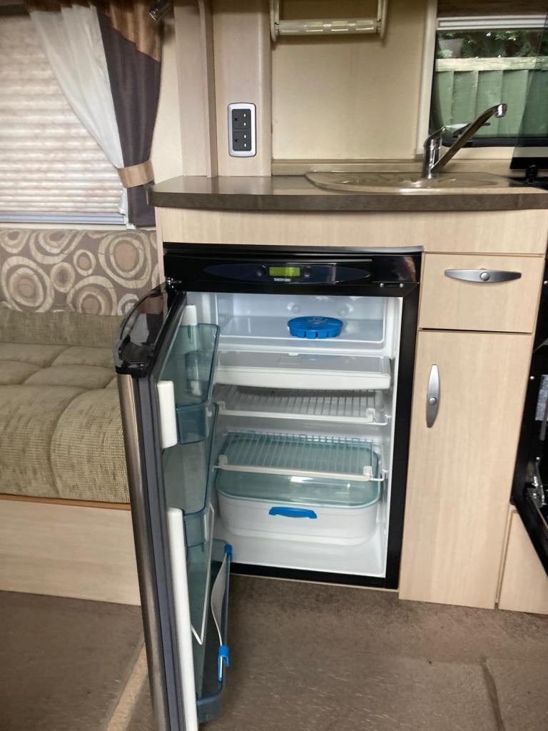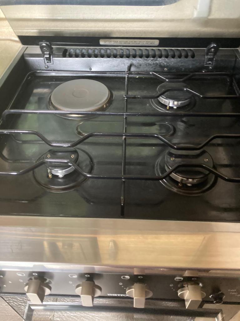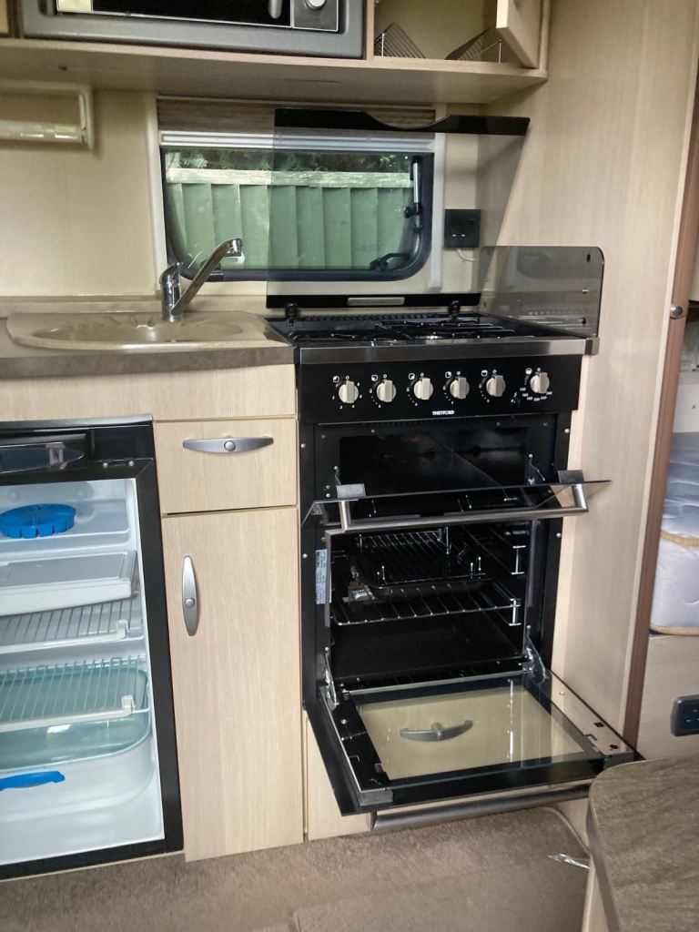 * Kitchen: Thetford Aspire oven/grill, 3-burner hob with 1 electric plate, microwave, and 107-litre fridge/freezer.