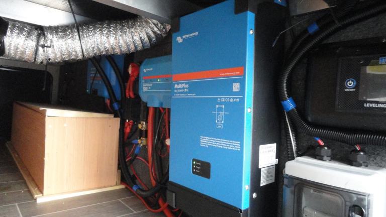 A Victron 2000va / 12v / 80A / 32A Multiplus II inverter, Victron smart solar charger 150 / 80, 200ah Renogy lifepo4 battery (2nd battery ready, battery app available) Victron distributer, solar panel breakers, main consumer units. (Manuals for the Victron kit are available online and via the Victron Connect app)