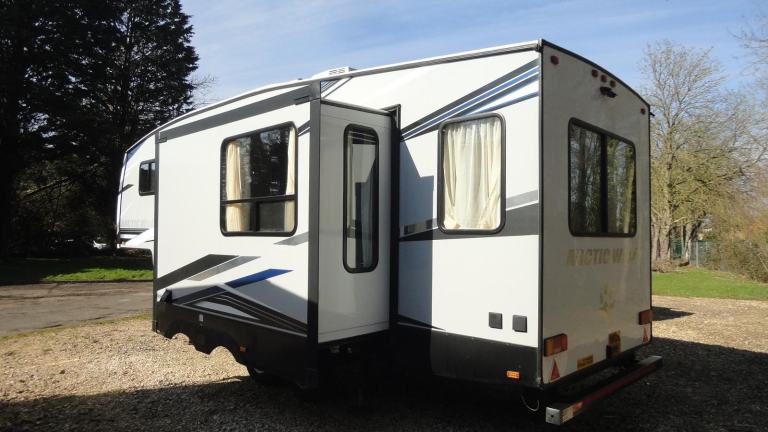 2020 EuroCruiser 5th wheel trailer, Model 857 Elite, 28'L, Tows with a UK truck i.e.: Ford Ranger, Isuzu DMax, Nissan Navara etc. etc. Multi Solar panel panel complete with Victron Invertor system for complete Off Grid use as well 240v mains hook up. Four motorised level jacks for easy and stable living, Motorised Awning, Microwave, Central Heating, Fully insulated for four season use, large kitchen with fridge freezer, oven, pantry, washer/dryer, large under belly storage, reese revolution pin box, Grey GRP side panels, large bathroom with walk in shower, toilet, wash basin, Black, Grey, Fresh water holding tanks. Etc. etc. etc.