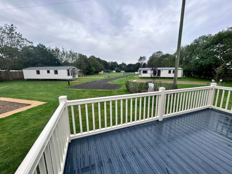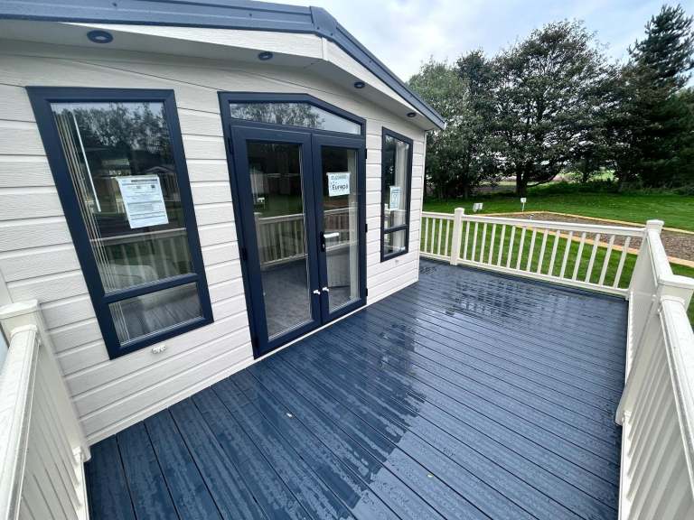 Full front and side decking fitted with Anthracite decking boards. We've made this balcony extra special for this holiday home bespoke for this pitch with the 8ft front decking and a 10ft side decking also allowing full sunshine exposure!!