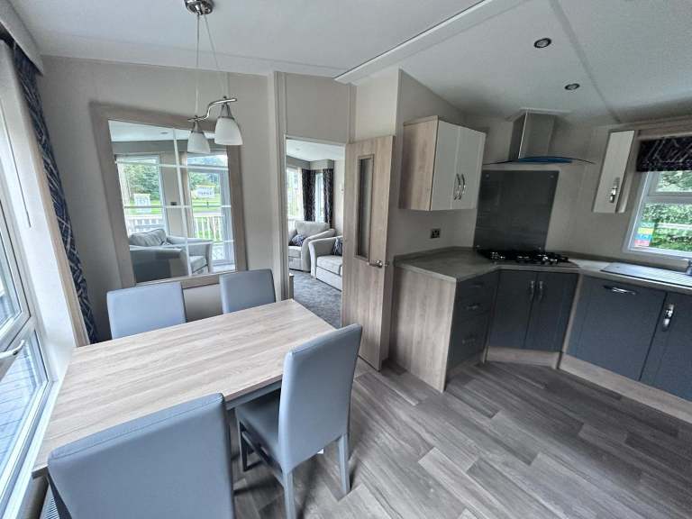 • Pan tiled roof • uPVC cladded exterior • Domestic style gutters • Exterior light • White uPVC double glazed • Central heating • 50mm fibreglass wall insulation • 50mm fibreglass roof Insulation • Electric fire • Vaulted ceilings throughout • Dividing door to hallway • Free standing dining table & chairs • Metal action fold out bed to lounge seating • Scatter cushions in curtain fabric • Cooker hood vented to outside • Integrated microwave • Integrated fridge freezer (full size) • Integrated oven & grill with separate hob • Integrated 450mm wide dishwasher • Shower with thermostatic mixer • Dual flush WC • Extractor fan • Deluxe mattresses • Lift up storage bed to main bedroom • Padded headboards • USB socket in lounge • Smoke alarm & carbon monoxide detectors