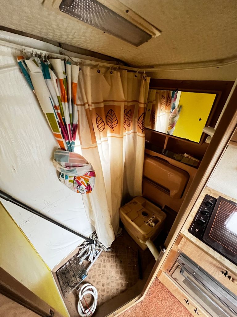 Has boiler shower portable toilet sink kitchen grill oven radio, and antenna for tv.