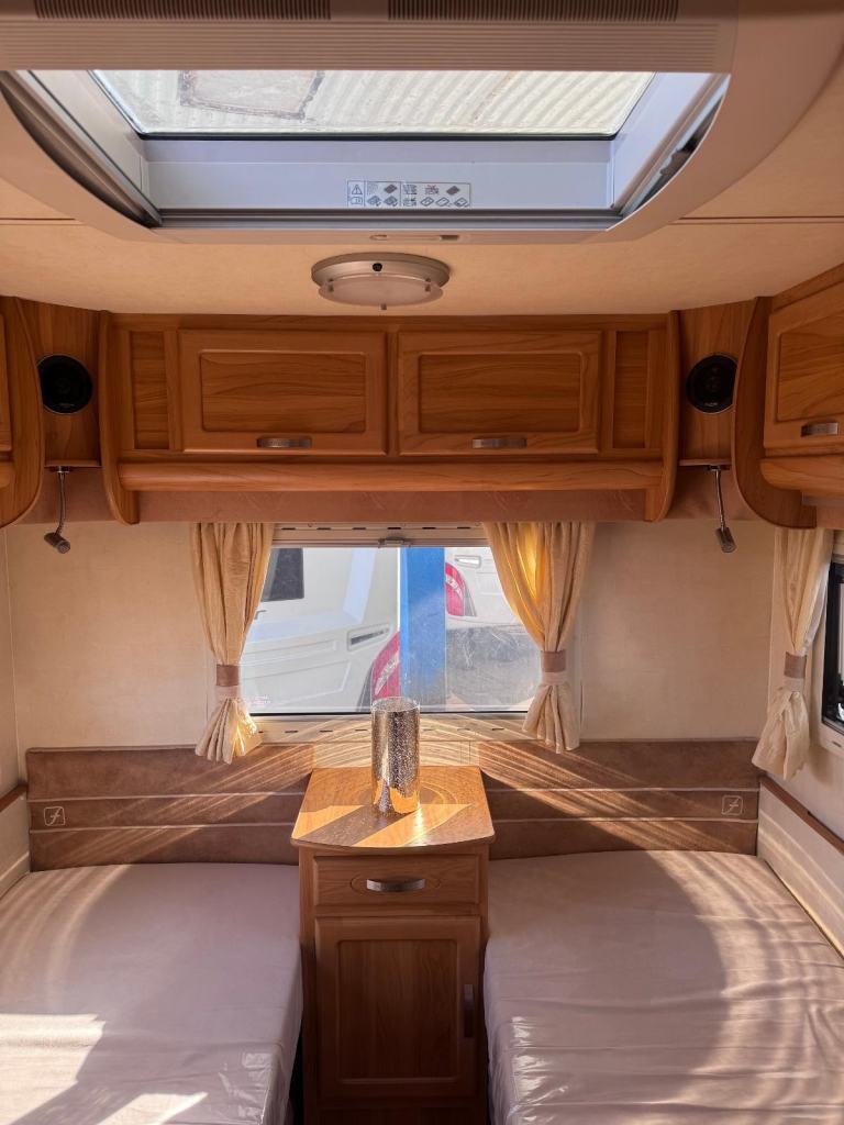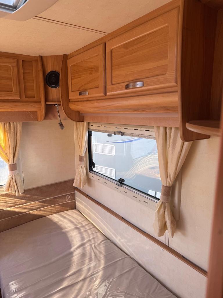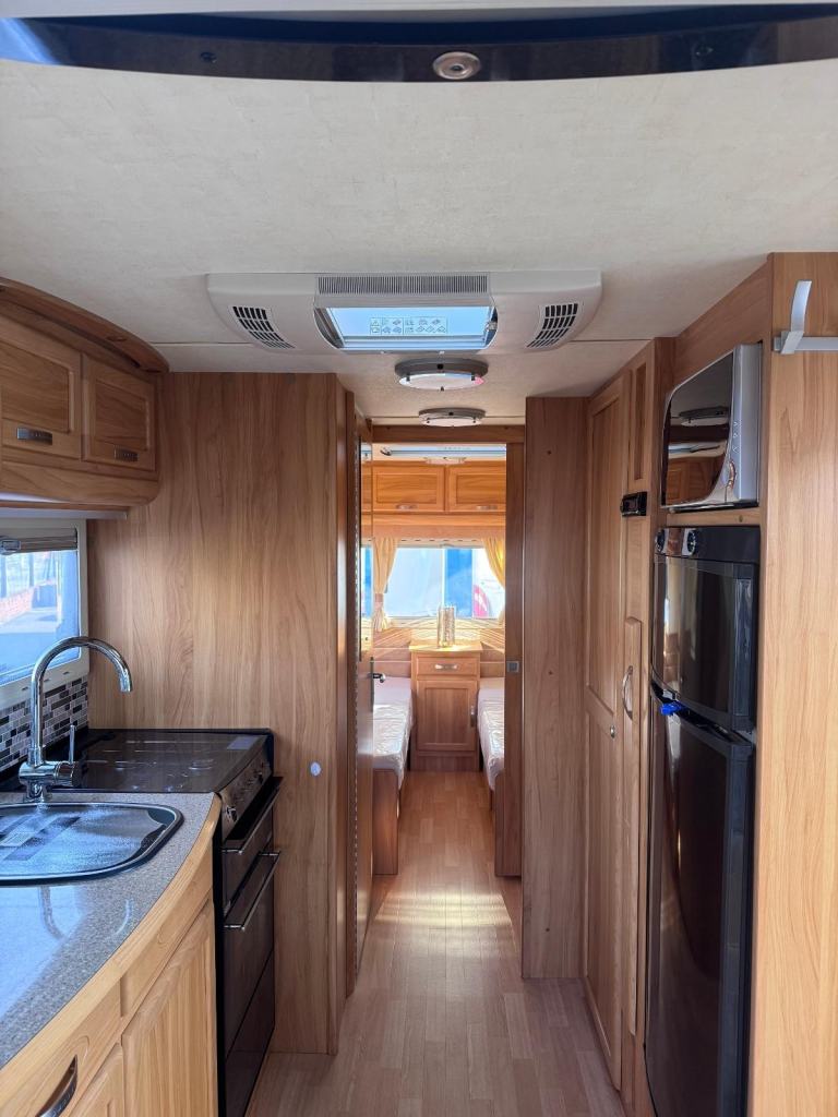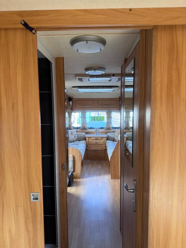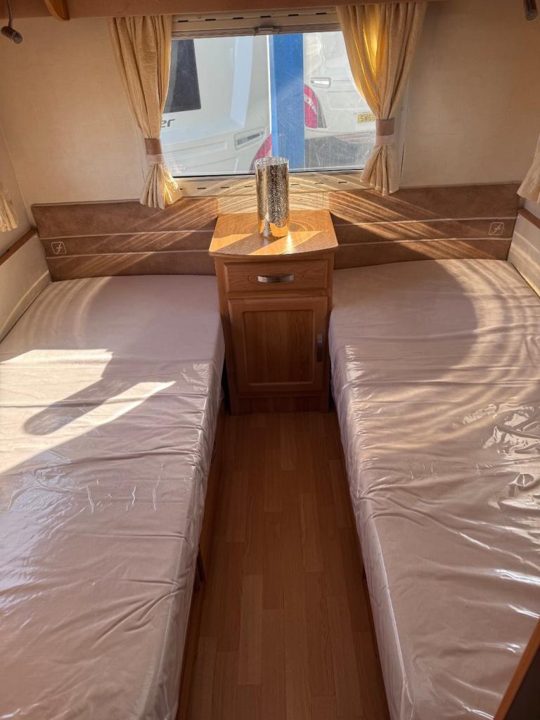 Spacious tourer with twin axle stability, features fixed twin single beds to the rear, midship wash room, shower cubicle and with Alde central heating for all seasons touring.