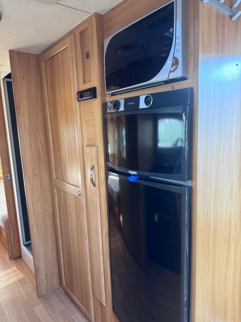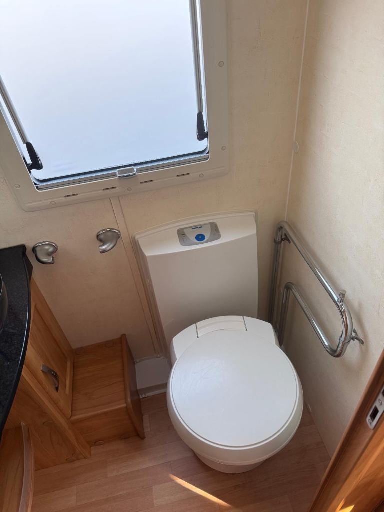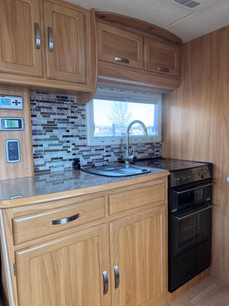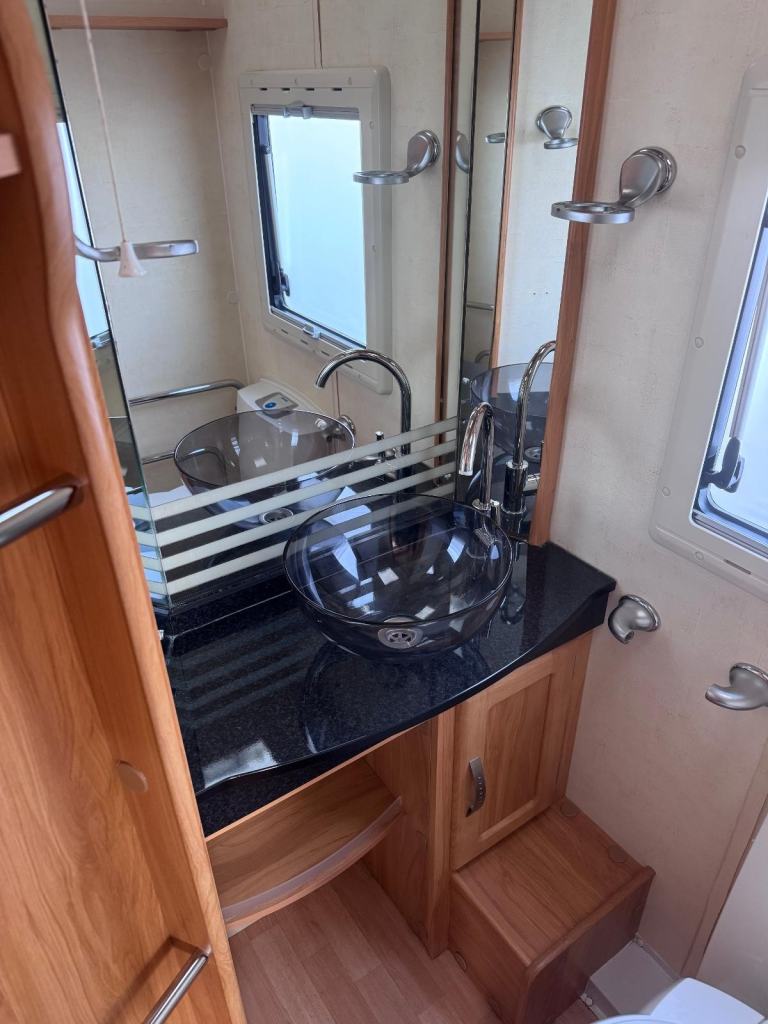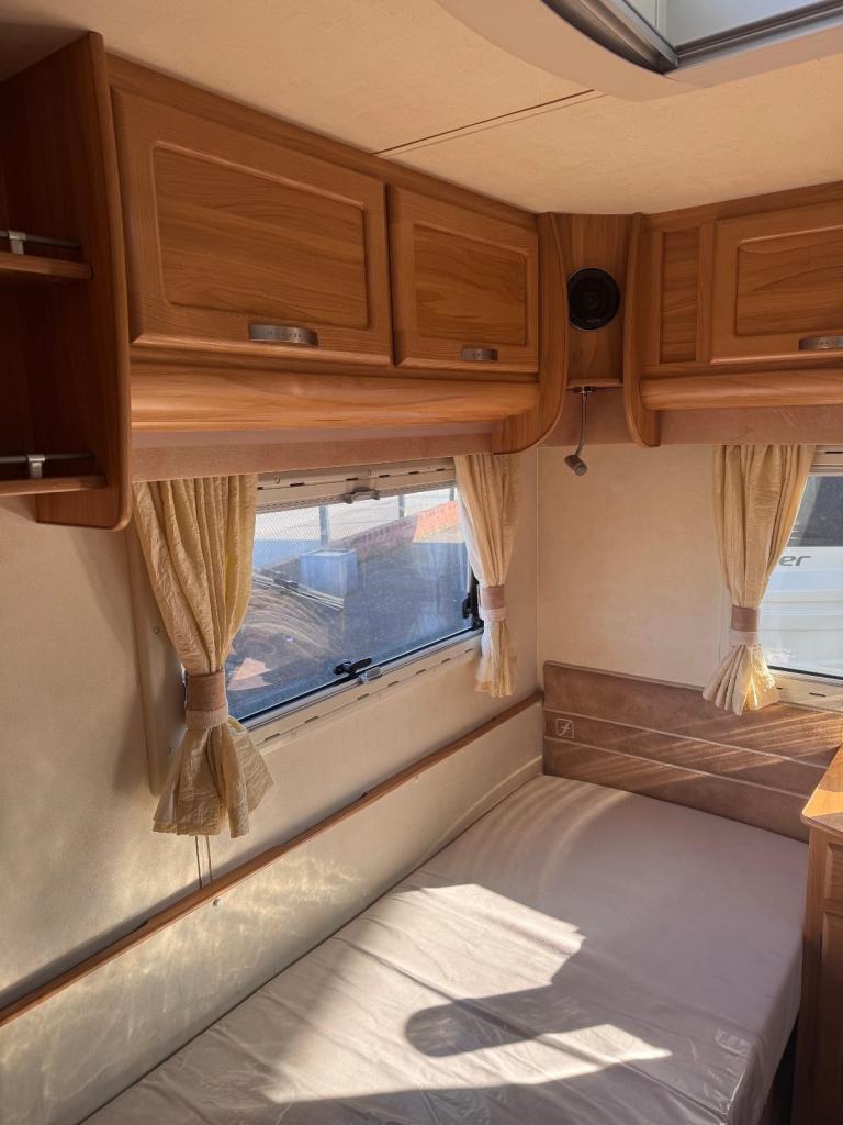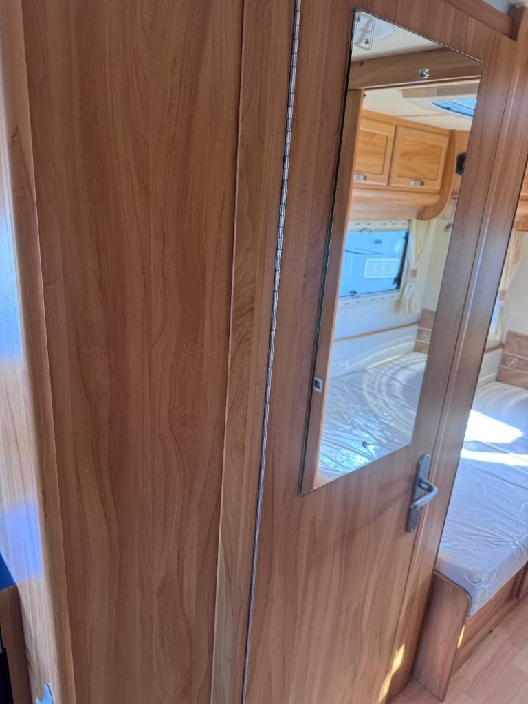 Spacious tourer with twin axle stability, features fixed twin single beds to the rear, midship wash room, shower cubicle and with Alde central heating for all seasons touring.