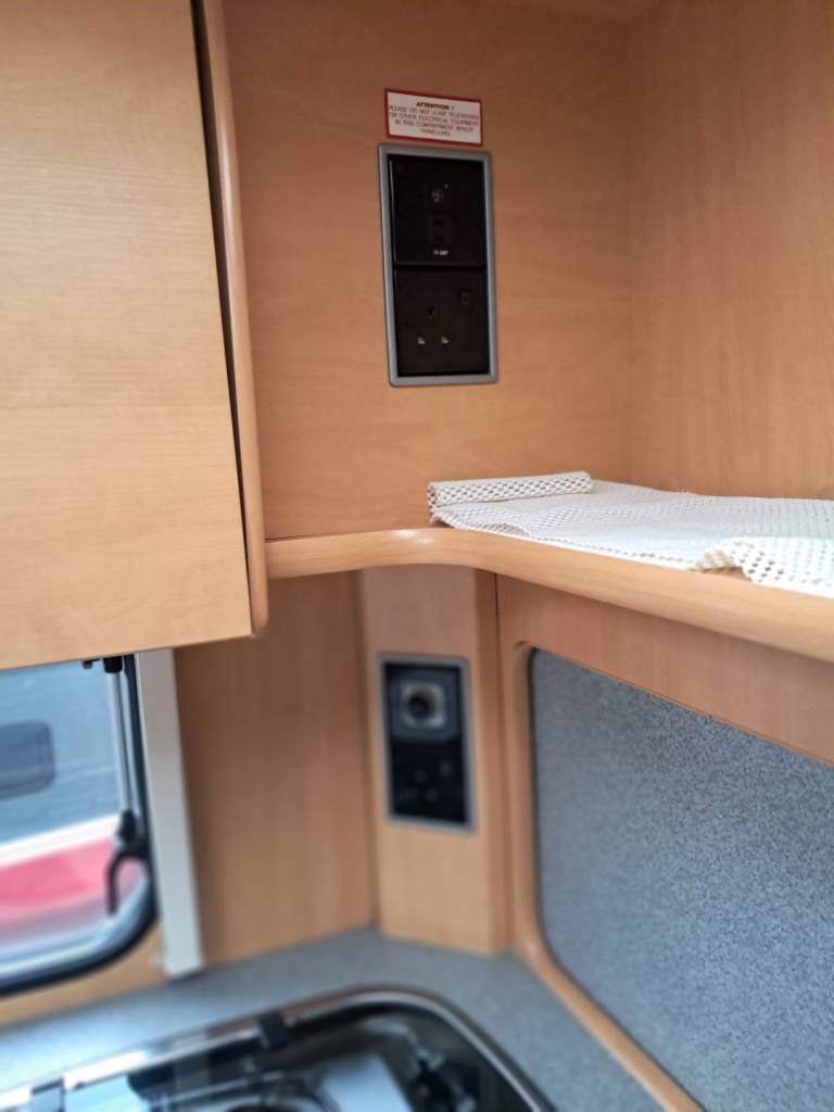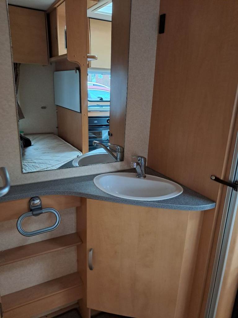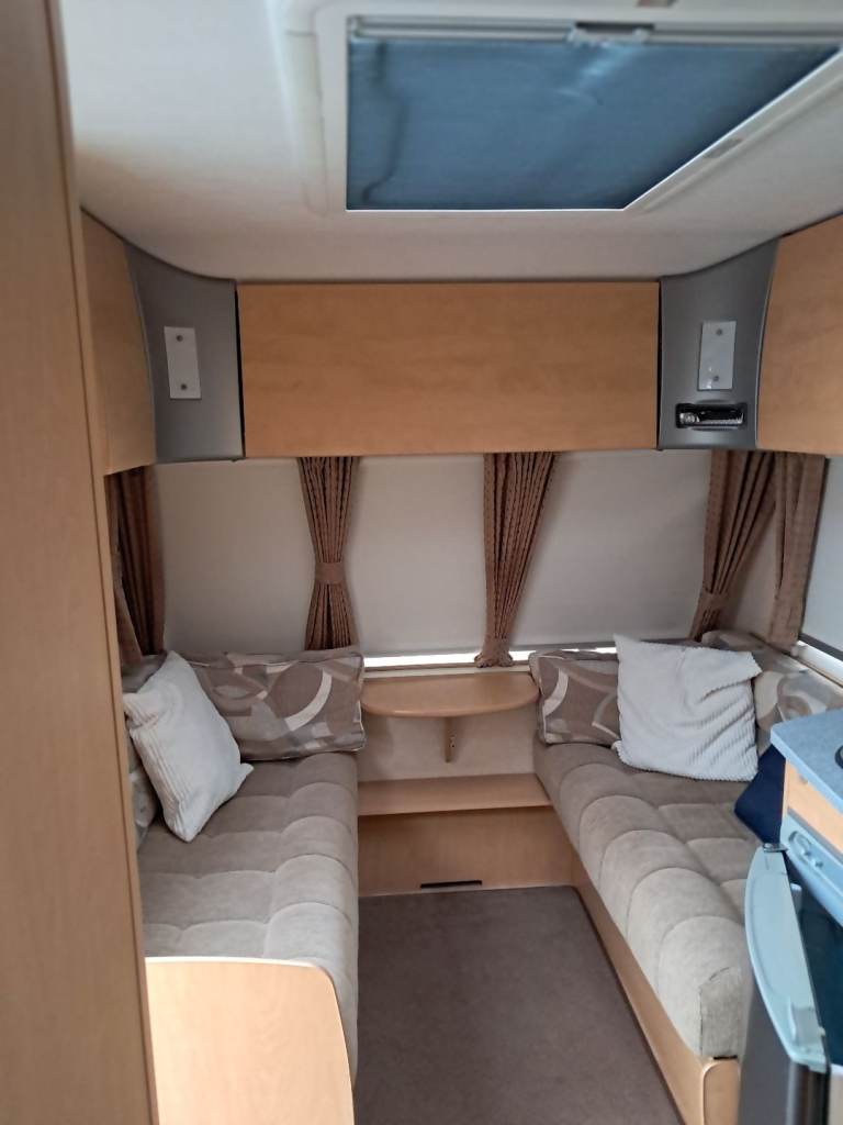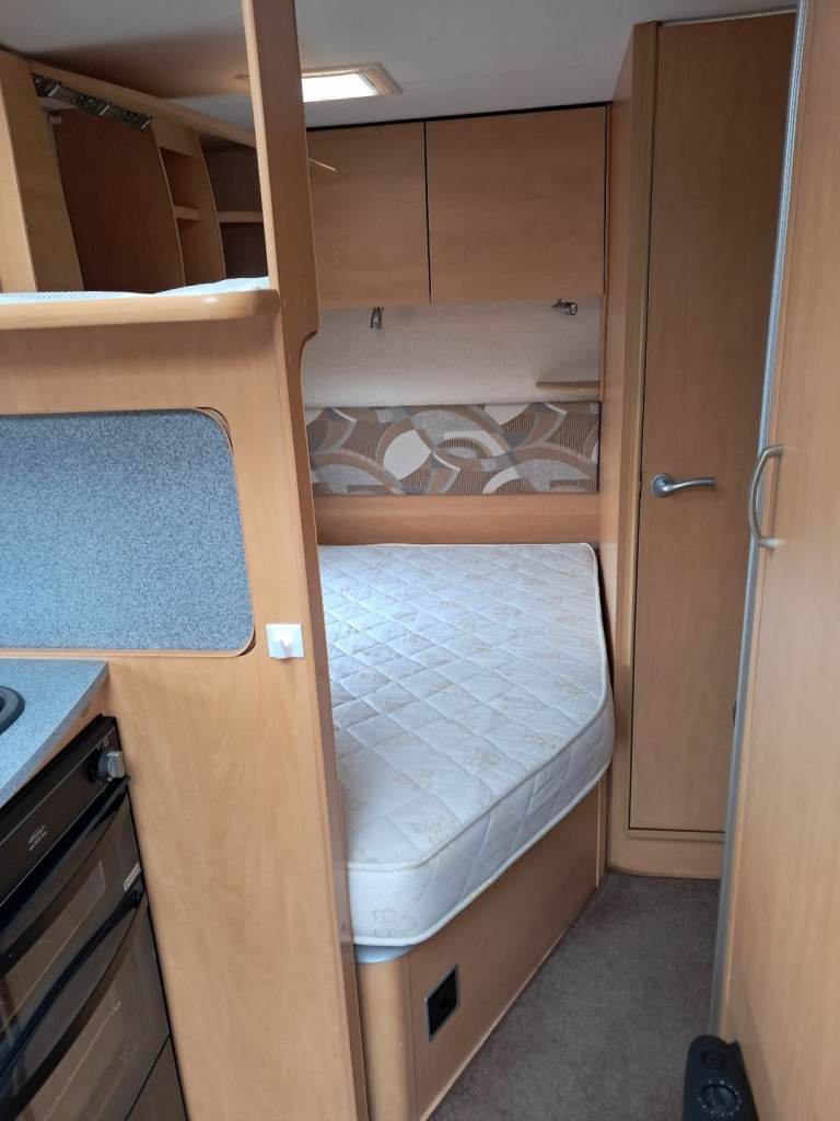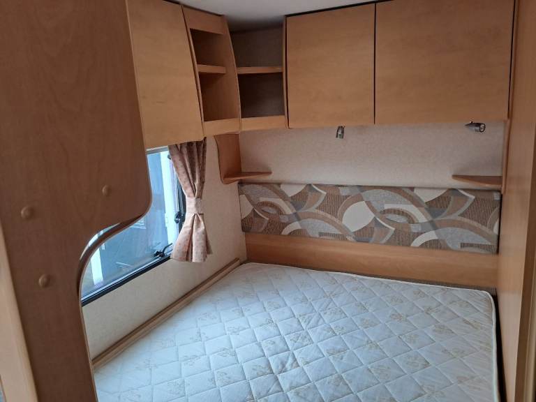 Rear bedroom with fixed bed. Front seating converts to second double bed. Bathroom with toilet and shower. Fridge with freezer compartment, oven , grill and 4 hobs. Microwave, Gas / electric blown heating system. Water heater, TV point and ariel. Inbuilt CD Radio, Alloy wheels, Heki roof light, free standing table. Motor mover with remote control.