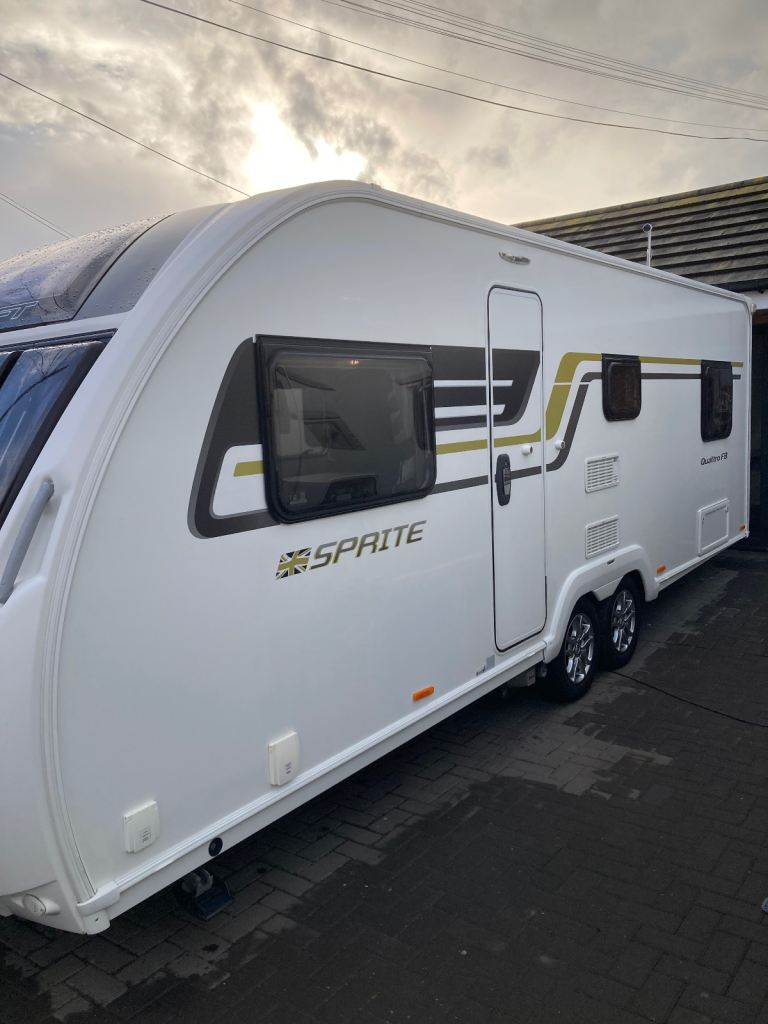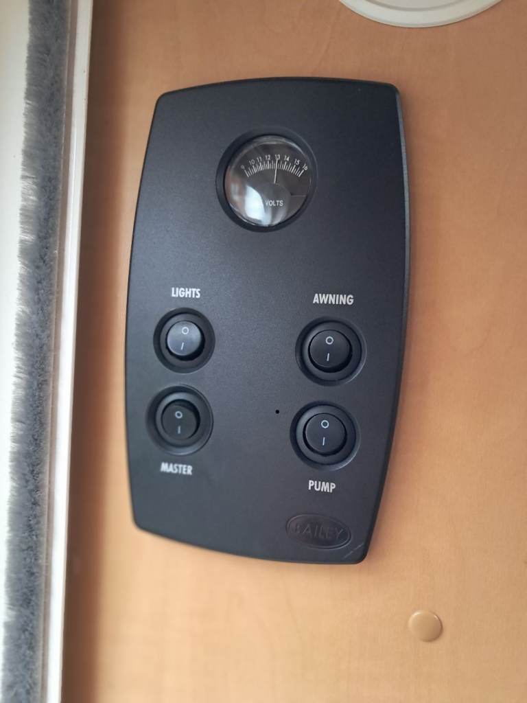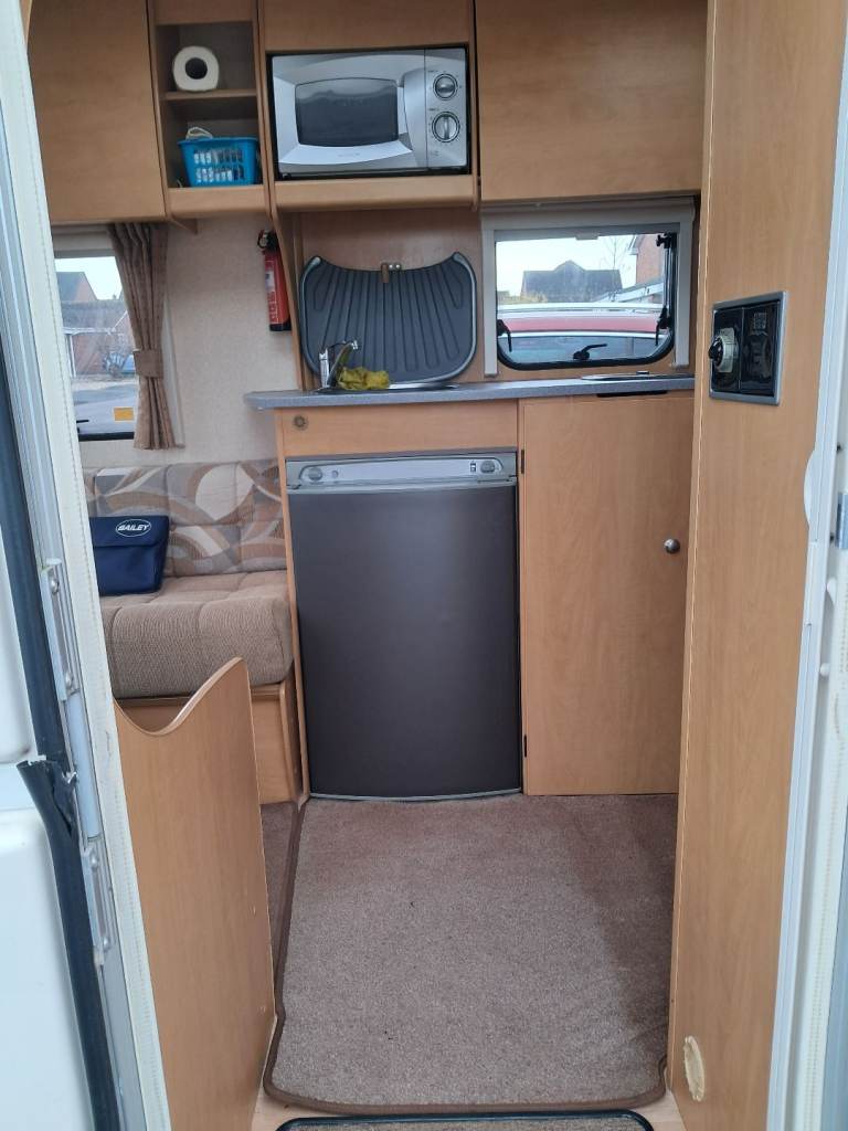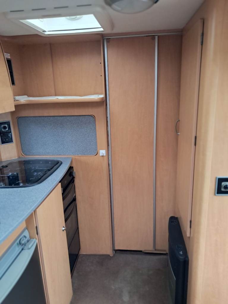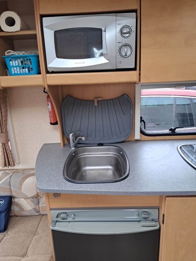 Rear bedroom with fixed bed. Front seating converts to second double bed. Bathroom with toilet and shower. Fridge with freezer compartment, oven , grill and 4 hobs. Microwave, Gas / electric blown heating system. Water heater, TV point and ariel. Inbuilt CD Radio, Alloy wheels, Heki roof light, free standing table. Motor mover with remote control.