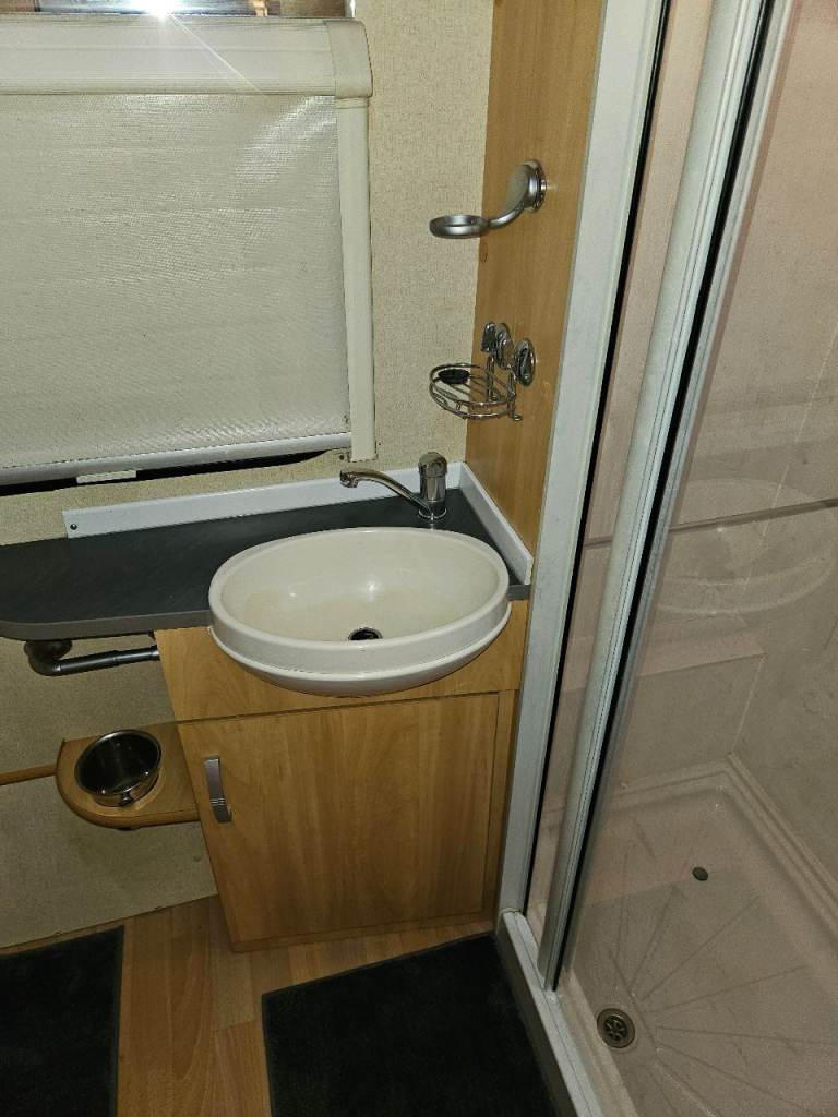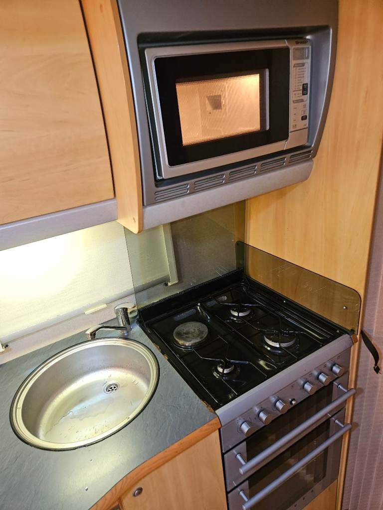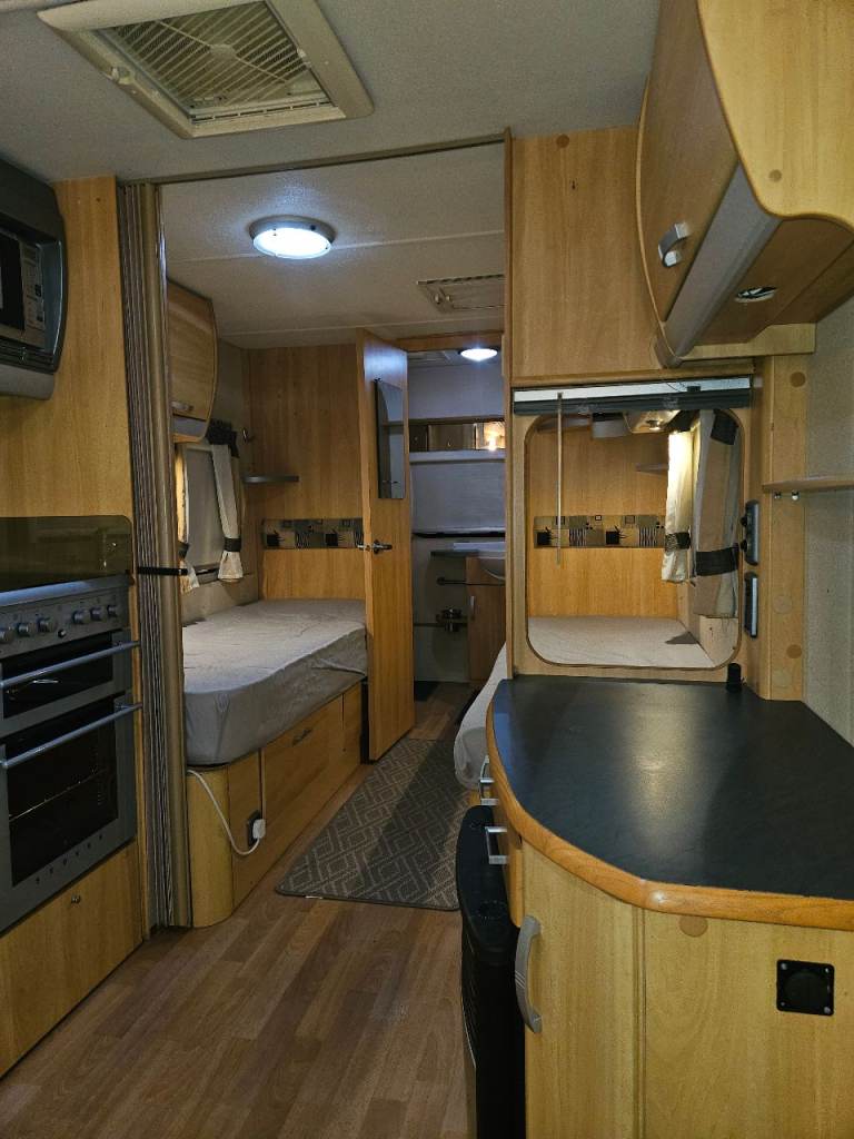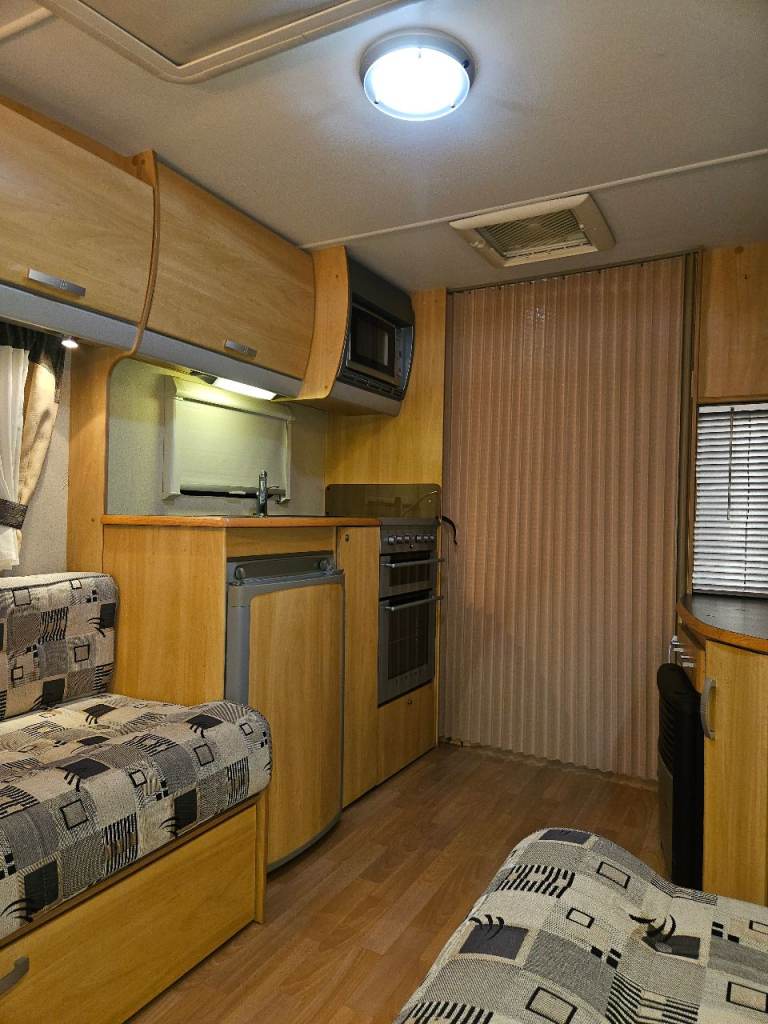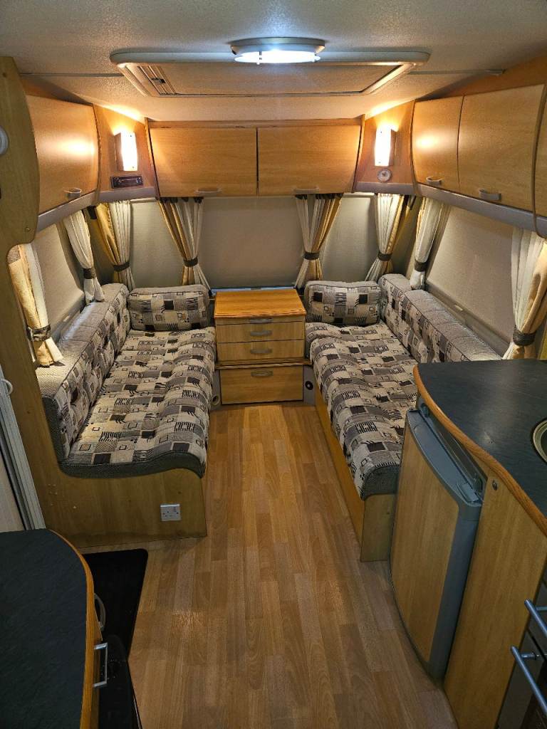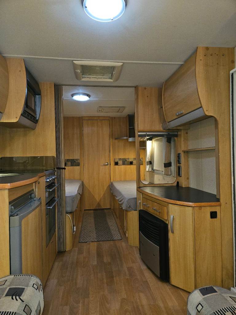 Lovely modern layout for age, front seating making 2x single beds or a huge double, central/side kitchen with Dometic 3 way fridge freezer, dual fuel hob, oven & grill, microwave, circular sink and plenty of work surface.