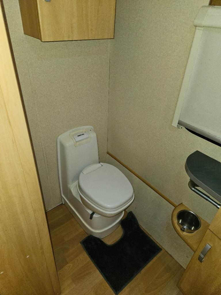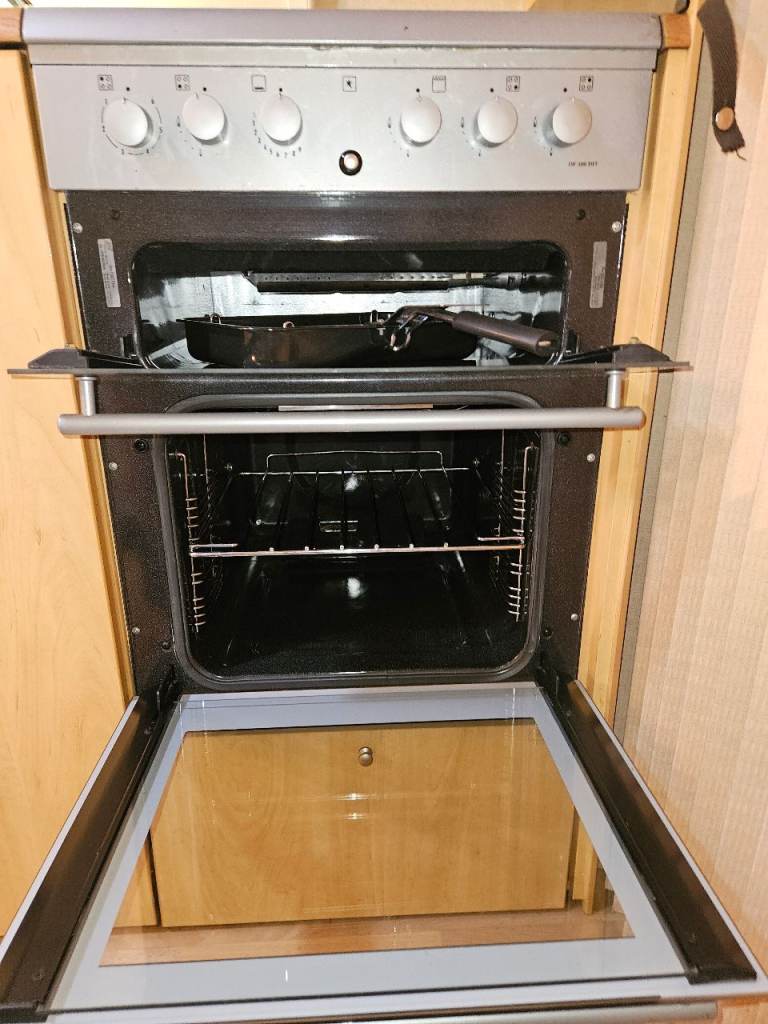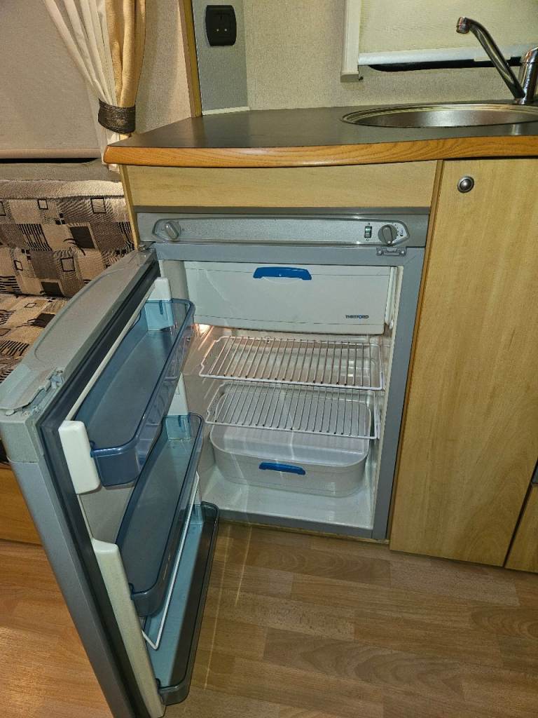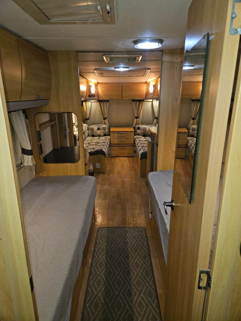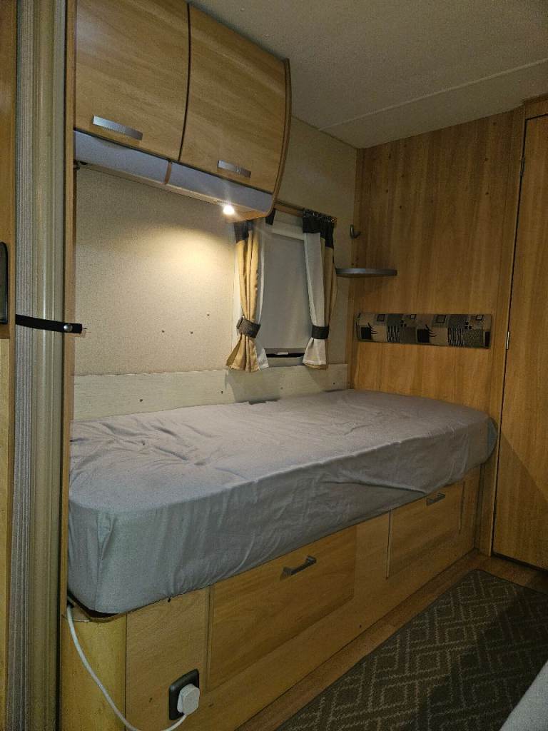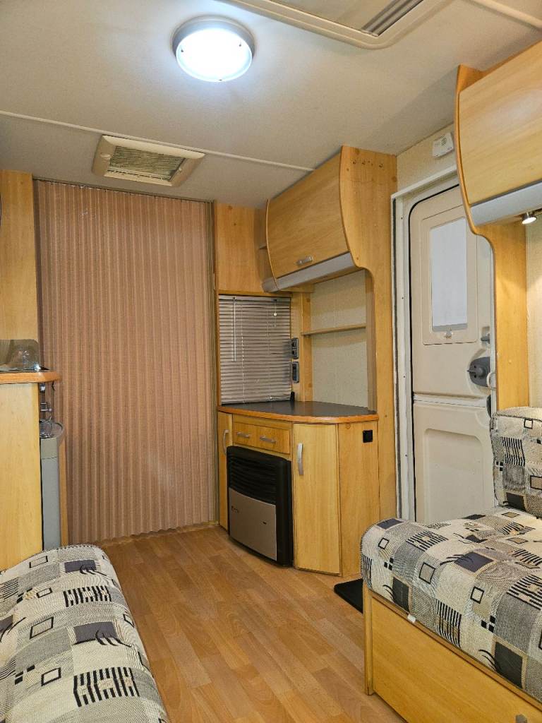 Lovely modern layout for age, front seating making 2x single beds or a huge double, central/side kitchen with Dometic 3 way fridge freezer, dual fuel hob, oven & grill, microwave, circular sink and plenty of work surface.