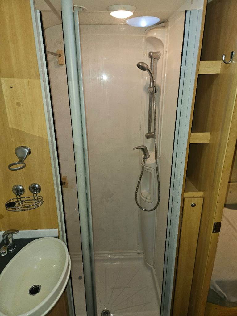 Large end washroom with separate full size shower cubicle, Thetford cassette toilet, sink & vanity, wardrobe and drawers.
