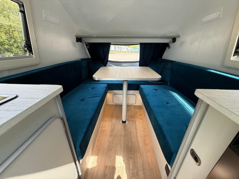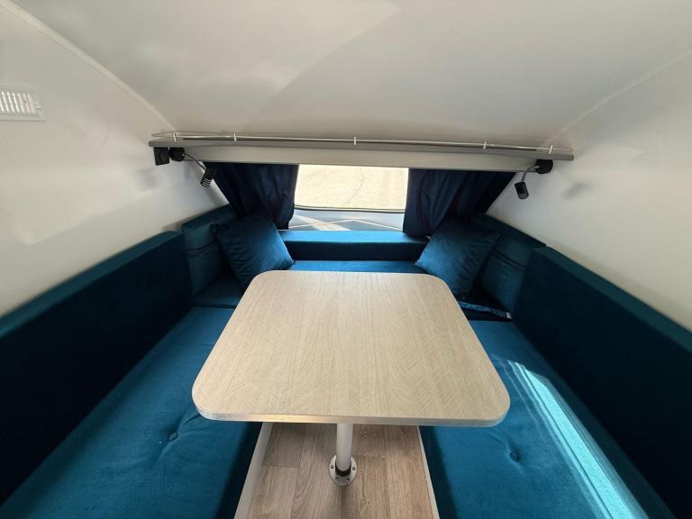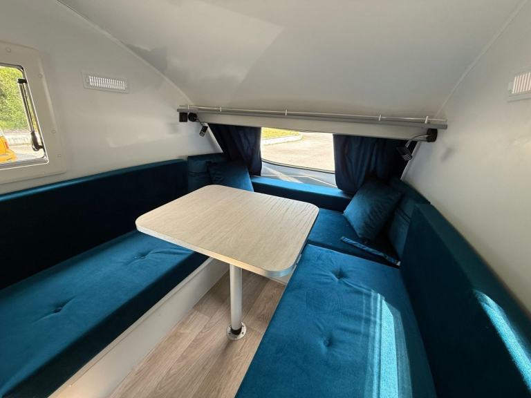 Don’t be fooled by its sleek, aerodynamic profile – inside, the Go Pod Going III packs a clever, space-optimised layout that transforms travel into luxury. Enjoy a cosy lounge that quickly converts into a comfortable double bed, perfect for two adventure-seekers ready to wake up wherever the mood takes them.