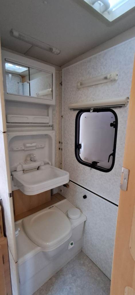 Bathroom with sink, vanity unit and Thetford cassette toilet.
