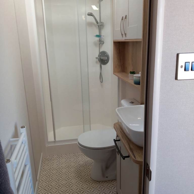 The family bathroom has a shower, toilet, washbasin, extractor fan plus lots of storage space.
